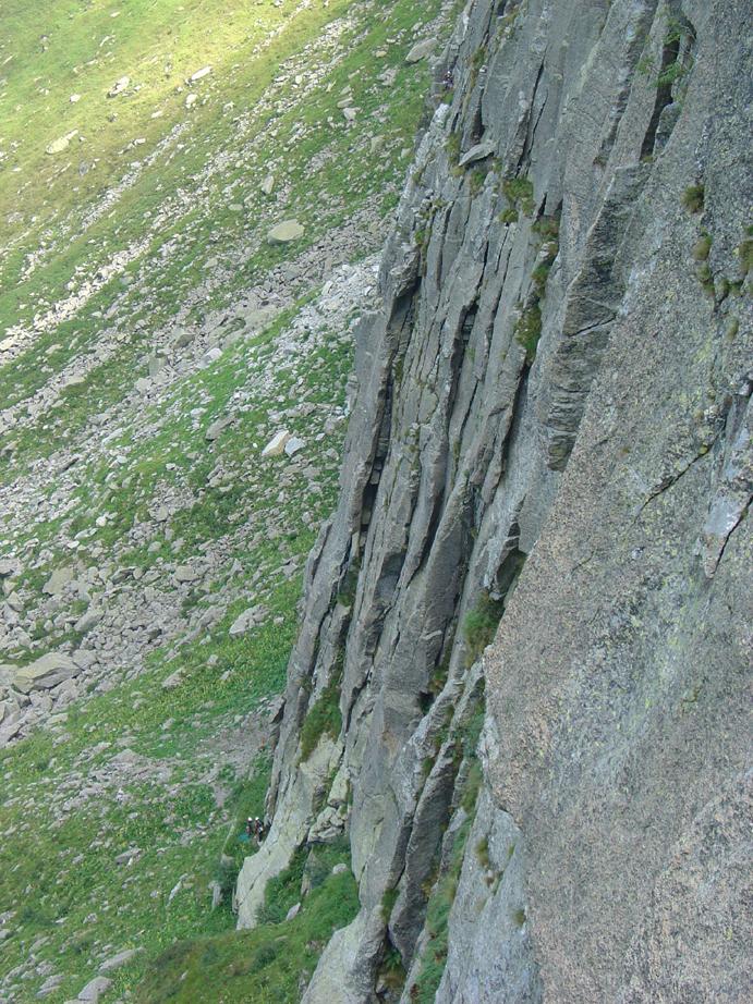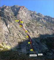 - L3) Superare una placca fessurata (4c), poi un grande diedro che si risale prima sul fondo e poi sulla faccia destra fino ad uscire su un terrazzino sul margine della parete (5b).