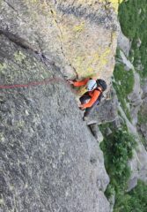 - L4) Salire facilmente per alcuni metri, superare una lama staccata (5b) e proseguire a sx (a dx si stacca “Papillon”), prima su placche e poi lungo una bella fessura che porta ad un terrazzino (5b).