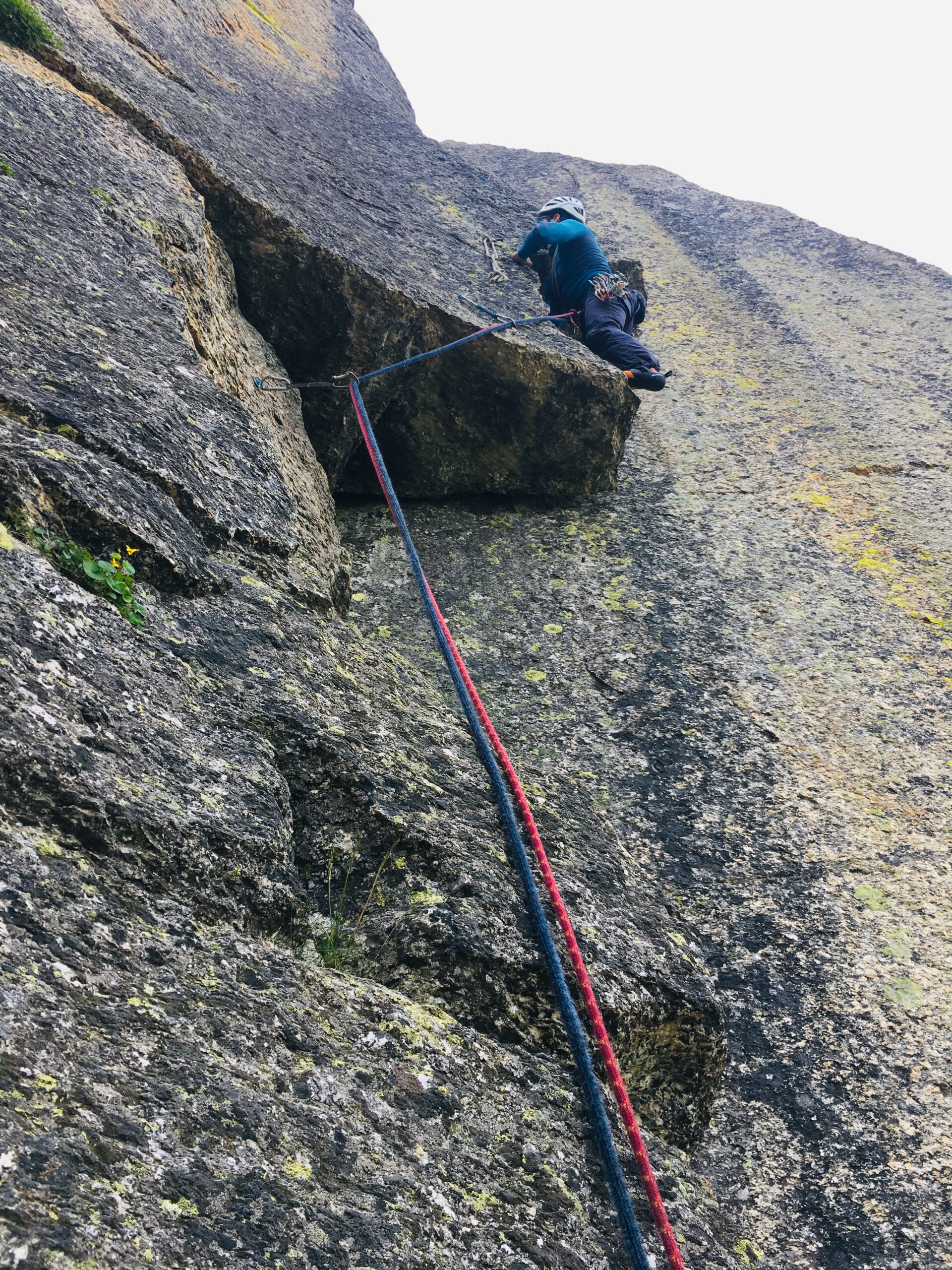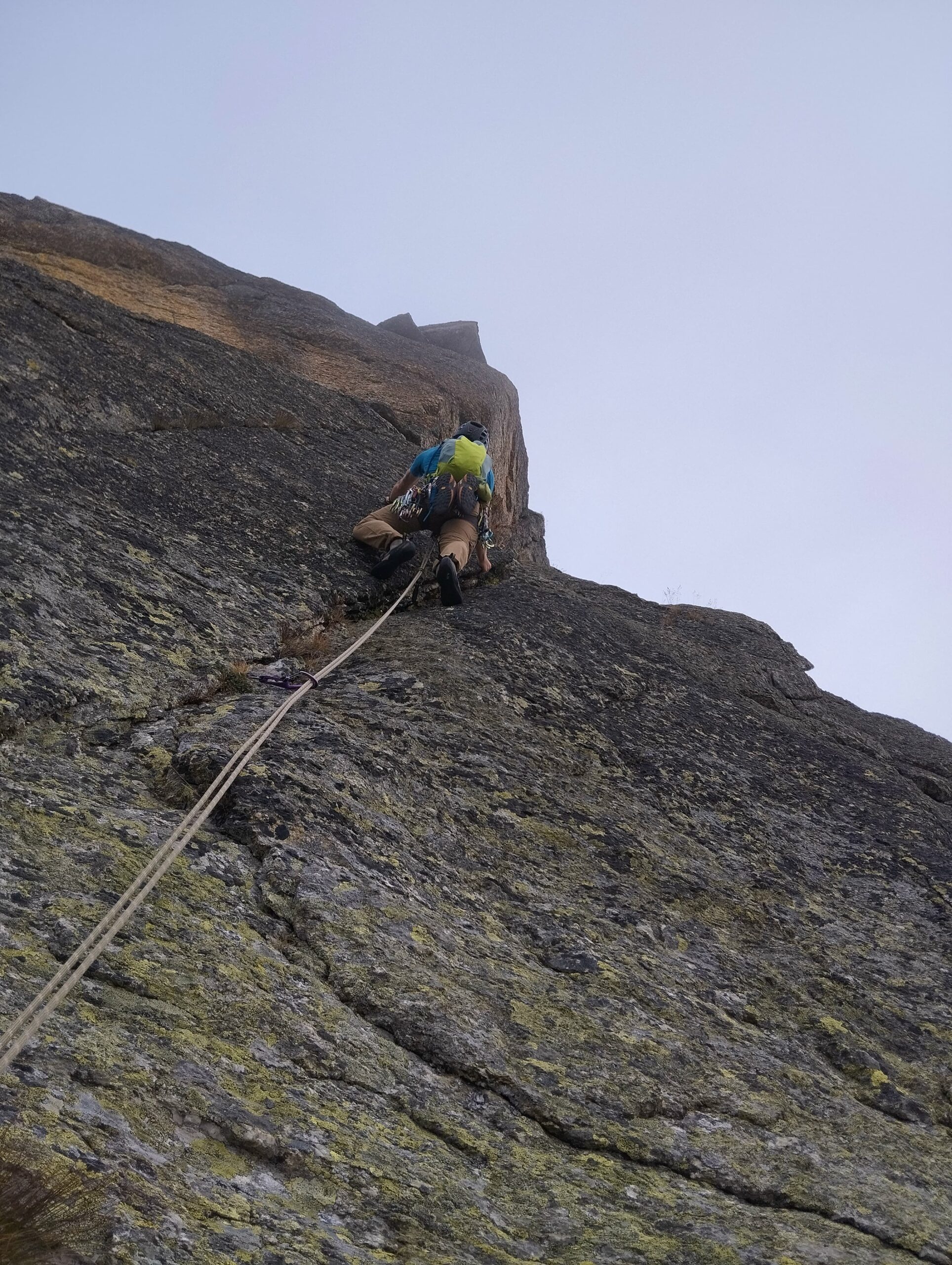 - L14) Superare sulla destra un secondo torrione, superando un breve muretto verticale (4c) per poi scendere verso sinistra ad un altro intaglio (sosta da costruire su blocchi o friend)