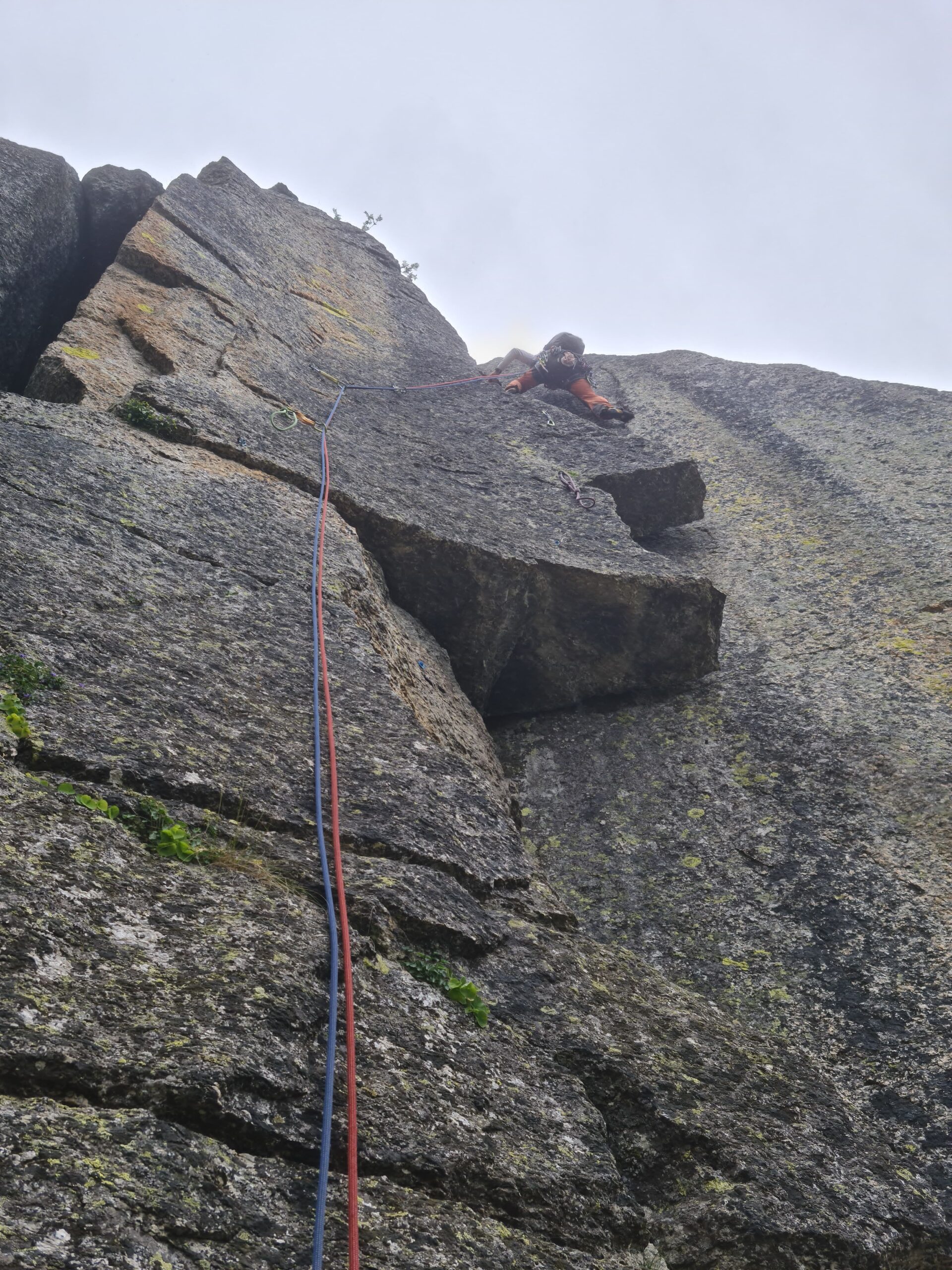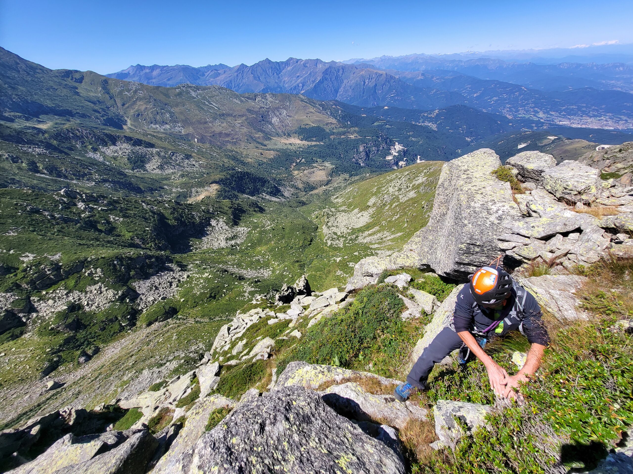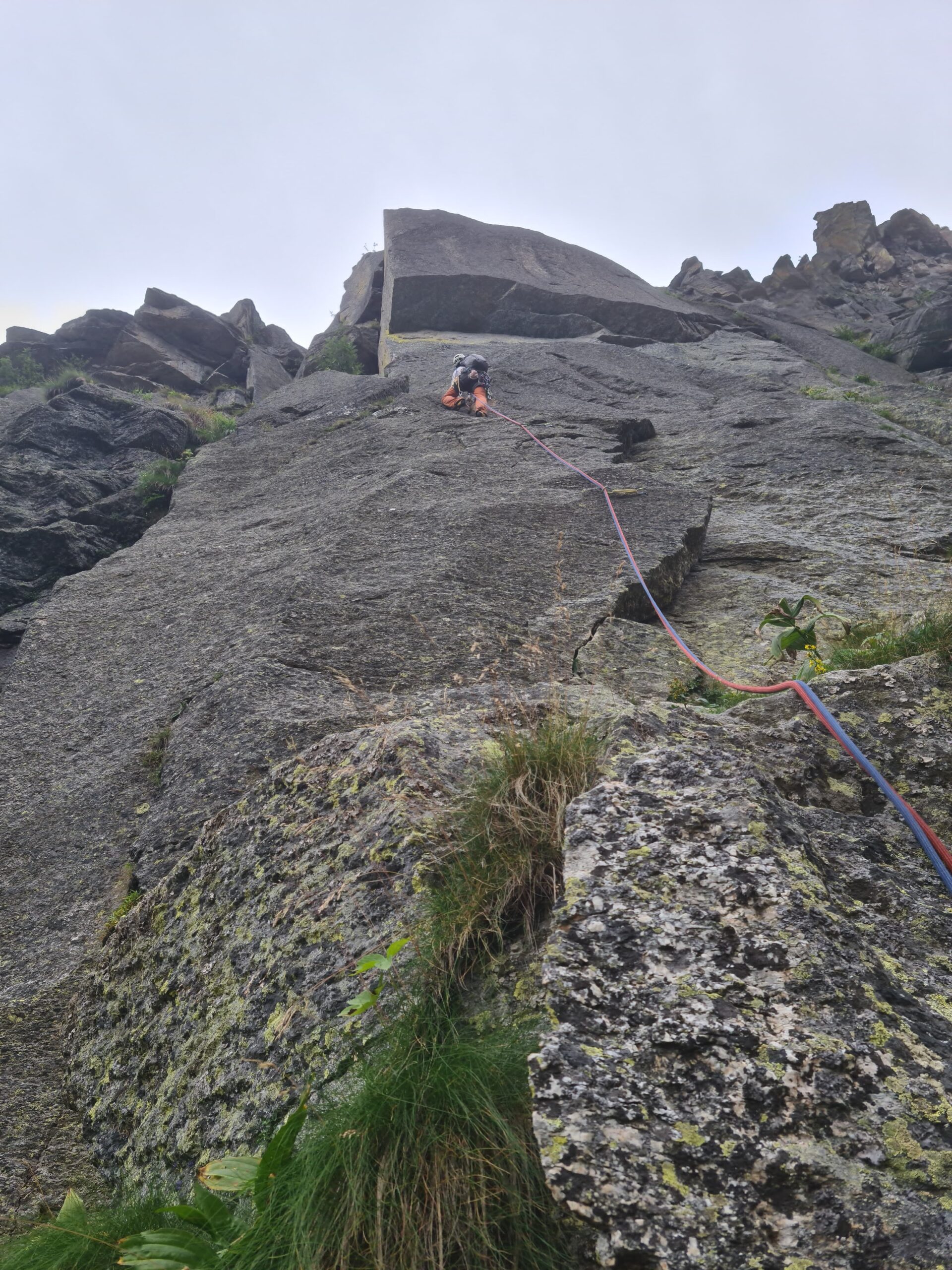Proseguire lungo lo sperone di cespugli, blocchi e facili paretine (passi di III) per circa 100m di dislivello, fino a raggiungere un intaglio all’altezza della Brecca (breccia tra Ostanetta e Rumella, ben visibile sulla sx). Dall’intaglio spostarsi a dx e puntare alla parete di fronte, un segno blu e una freccia indicano la partenza dell’ultimo tiro.