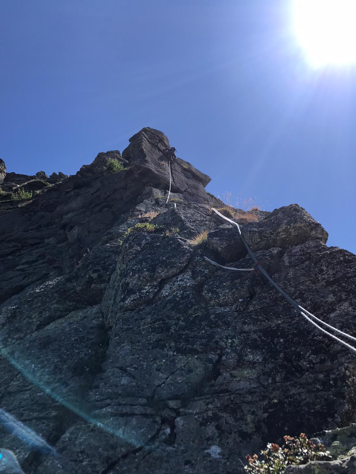 La prosecuzione in vetta è più discontinua, alpinisticamente impegnativa (necessità costante di integrare e all'occorrenza preparare delle soste) e piuttosto lunga per lo sviluppo. Oltre ai 400 di arrampicata, considerare 100m di dislivello facili, prima della placca finale.