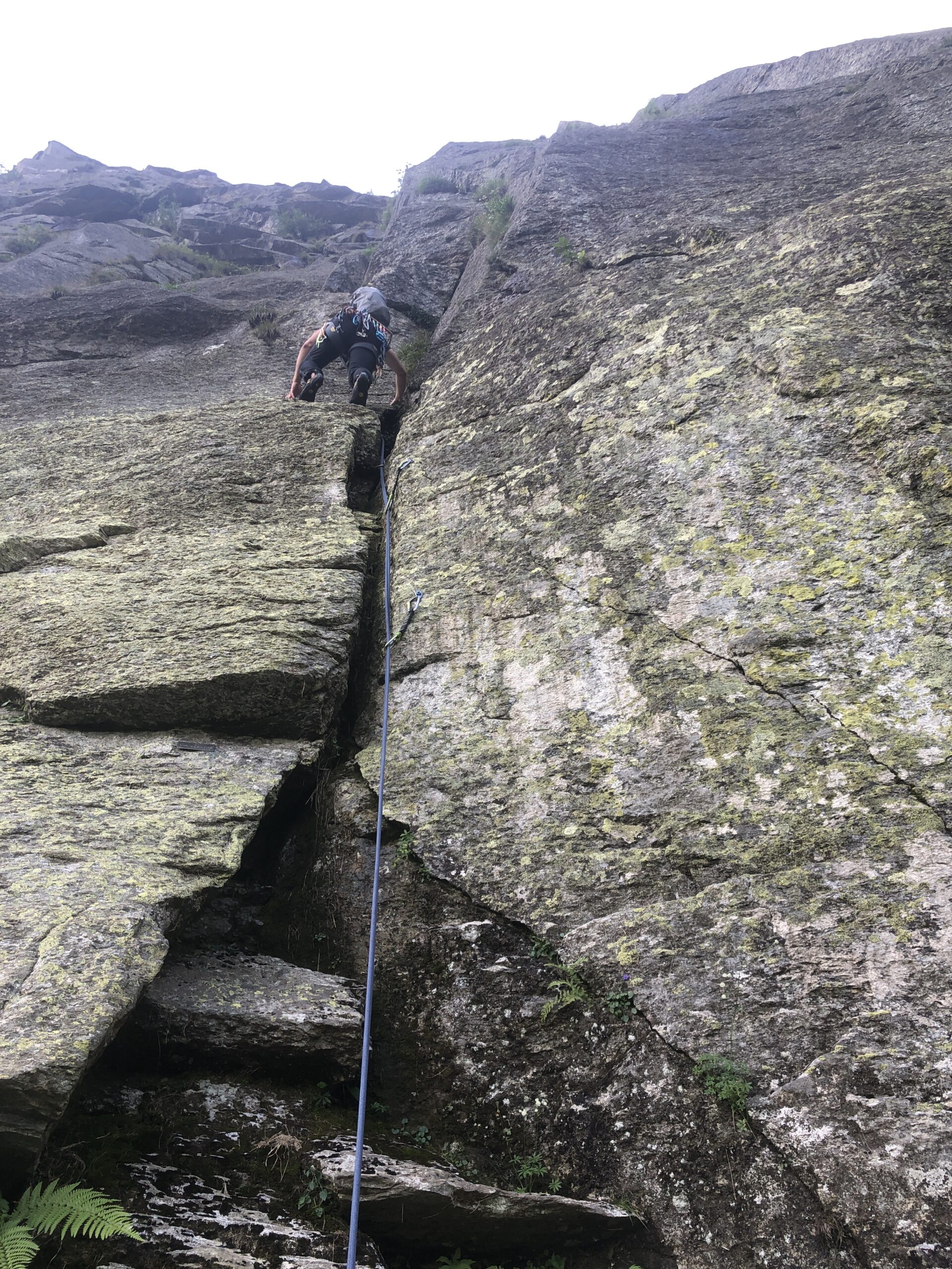 - L7) Superare un camino (4b) e proseguire verso dx lungo un breve tratto erboso fino alla base dello sperone lungo il quale si svolge la seconda parte della via (sosta a 2 fix con cordone).