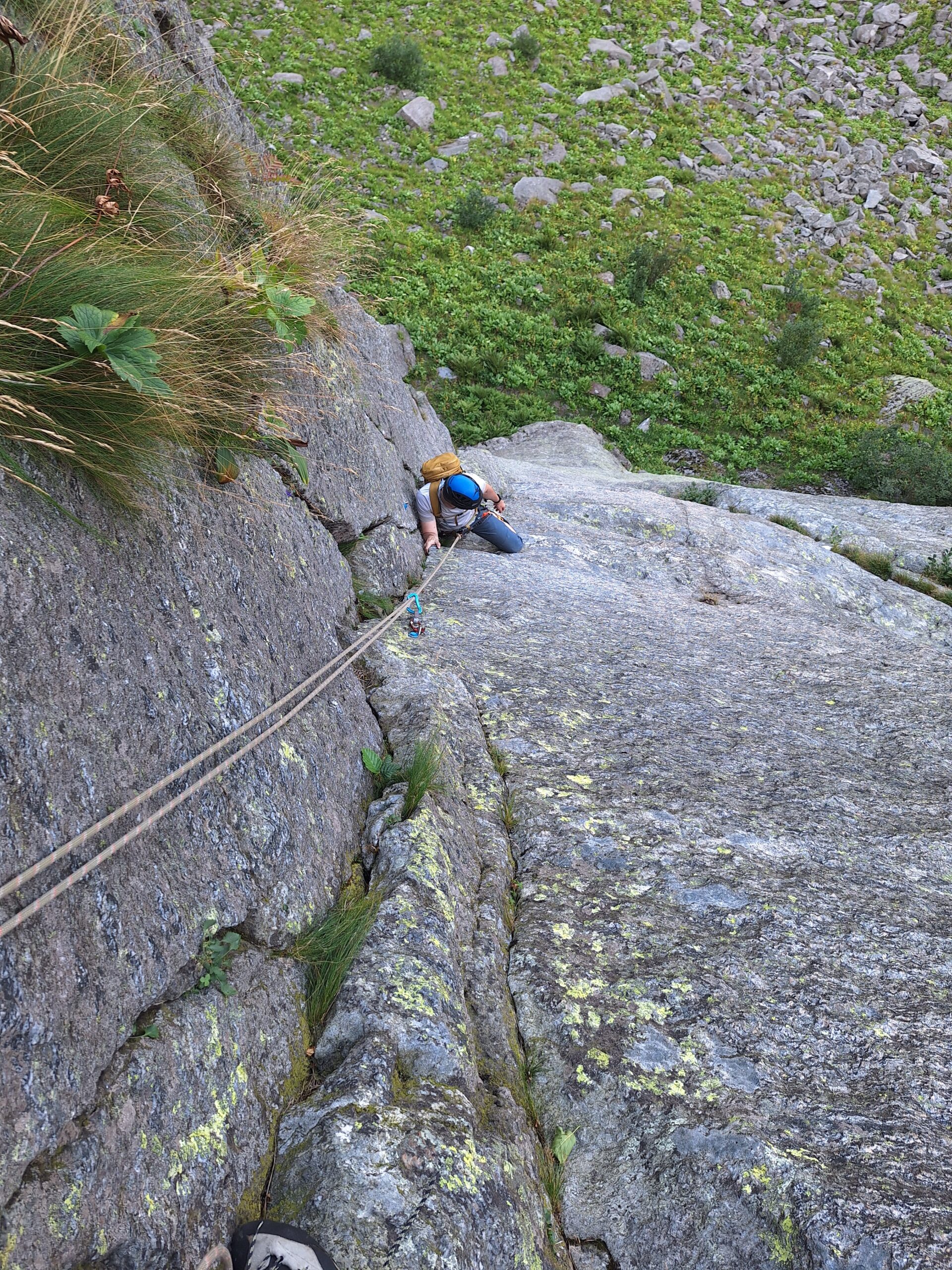- L2) Spostarsi a destra, risalire una spaccatura verticale (5c) e sostare su un terrazzo erboso.