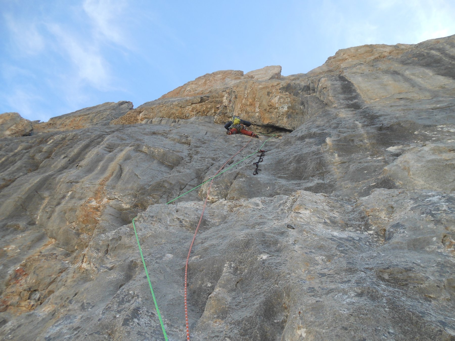 L7 – (Tiro chiave, molto impegnativo anche per i secondi ma molto bello) Salire il diedrino appena sx della sosta. Al suo termine (chiodo) ci si alza con un duro passo in libera di VII+ sulla bellissima placca grigia sovrastante (fattibile penso con un passo di A1 su cliff in buchetto netto o alzandosi molto bene sulla staffa sul chiodo presente; possibile piramide umana dei primi salitori) . Si prosegue sulla placca verticale poco protetta (VI+) fino ad un arco giallo che si segue verso sx (VI, alcuni chiodi). La parte finale della traversata può essere effettuata stando alti sotto il tetto o bassi sulla placca grigia (presente qualche raro chiodo sia sopra che sotto). Stando alti si affronta un passo di VII+ e una breve calata da chiodo con moschettone verso un diedro di rocce rotte che si risale fino ad una rampa dove si sosta oppure una sezione di VIII- in libera raggiungendo con una traversata discendente su tacche l’uscita del diedro citato. Stando bassi sembra più facile, ci sono tre chiodi e una clessidra, V+VI. In ogni caso si sosta su un chiodo rinforzabile sulla rampa oltre il diedro di rocce rotte (grosso spuntone). 40m VIII- o VII A1