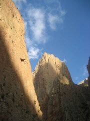 Splendido vione di 600 metri in un ambiente solitario nel cuore dell’atlante marocchino. Roccia perfetta, il tiro di 6c della 6° lunghezza è un capolavoro.