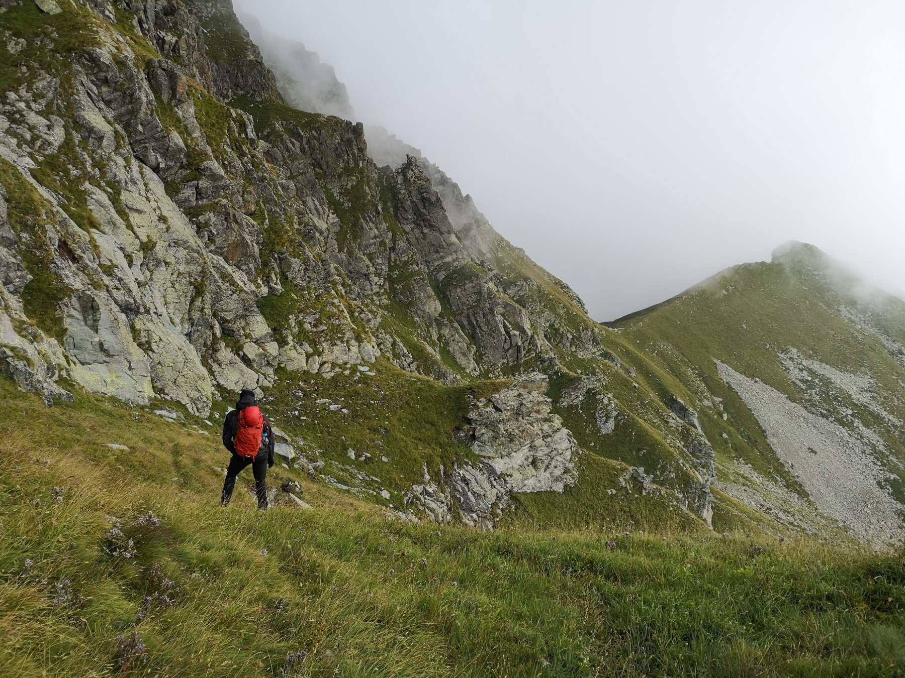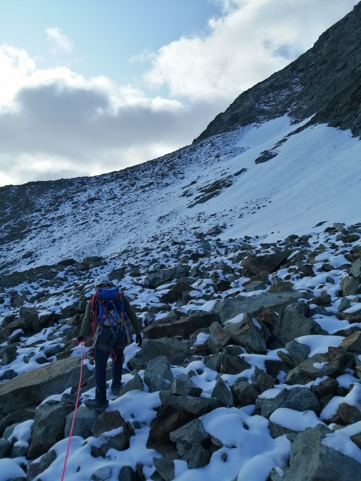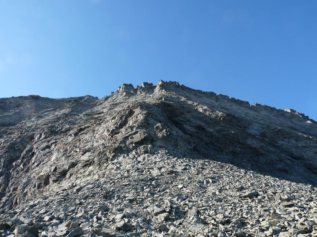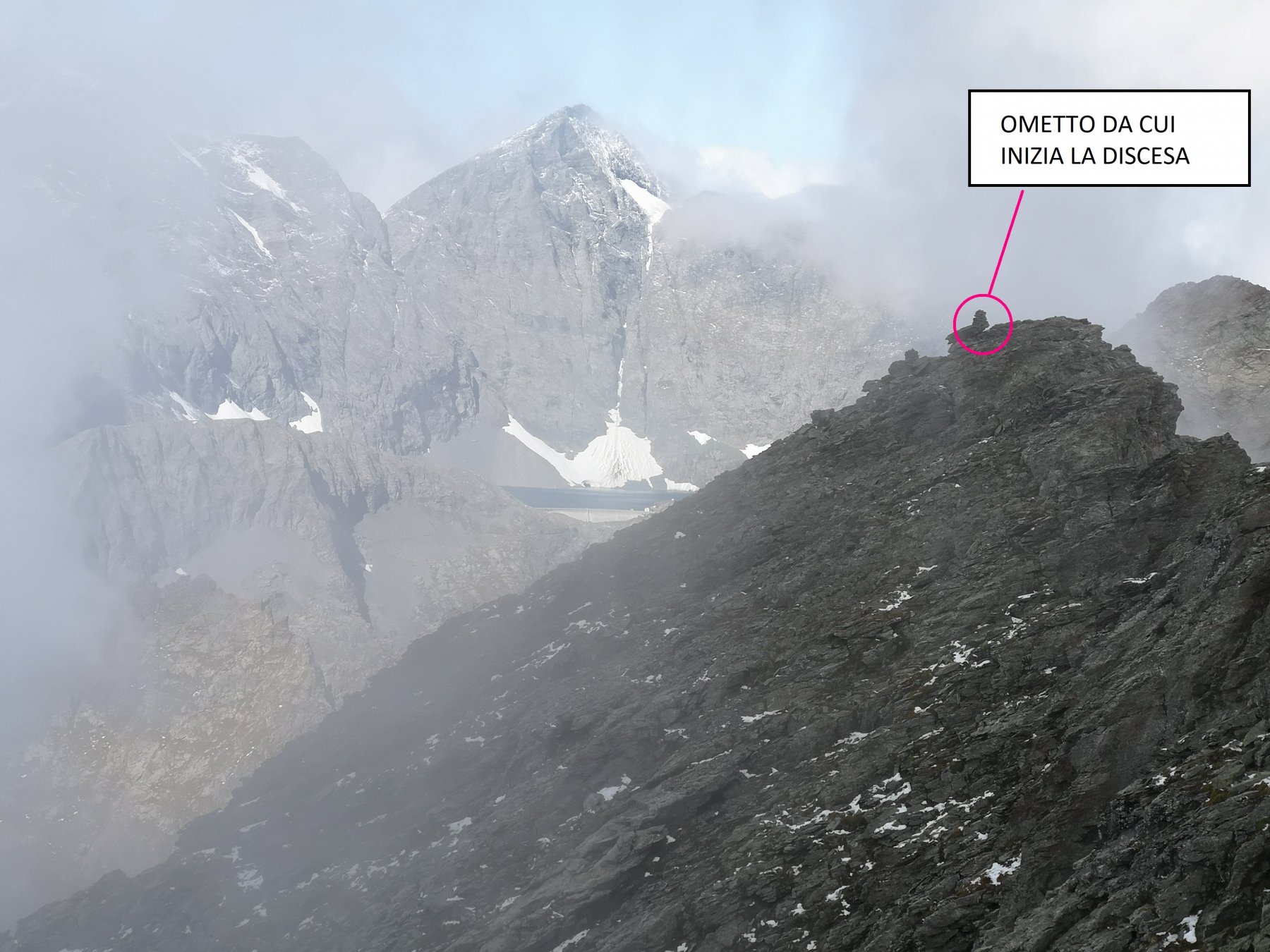 Dall’ometto della punta centrale, si segue abbastanza fedelmente la cresta (rocce instabili, max II+, esposta) in direzione Ovest fino a raggiungere un secondo ometto molto grande (simile a quello di vetta) che segnala il punto di discesa, in cui si lascia la cresta per scendere nel canalone sottostante, lato Val di Viù. Dopo aver disceso una cinquantina di metri si piega a sinistra (direzione est) e si traversa la parete sud mantenendosi poco sopra i 3000 metri di quota. Si ripiega poi di nuovo a destra e si riprende a scendere seguendo gli ometti presenti (discontinui). Si scende fino ad incontrare il sentiero che rientra per il Colle di Costafiorita e Ghicet Paschiet.