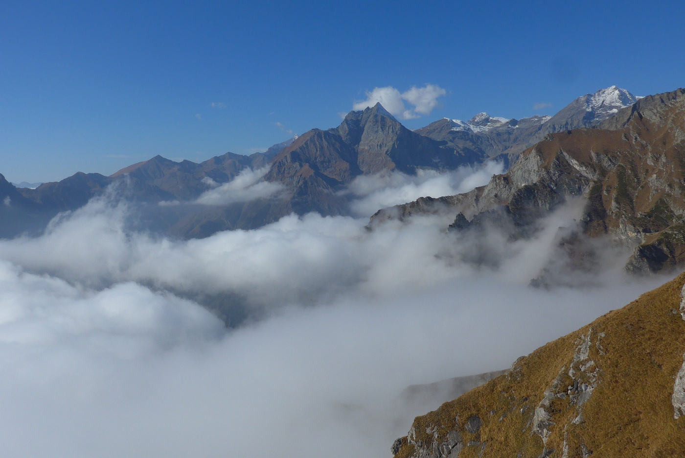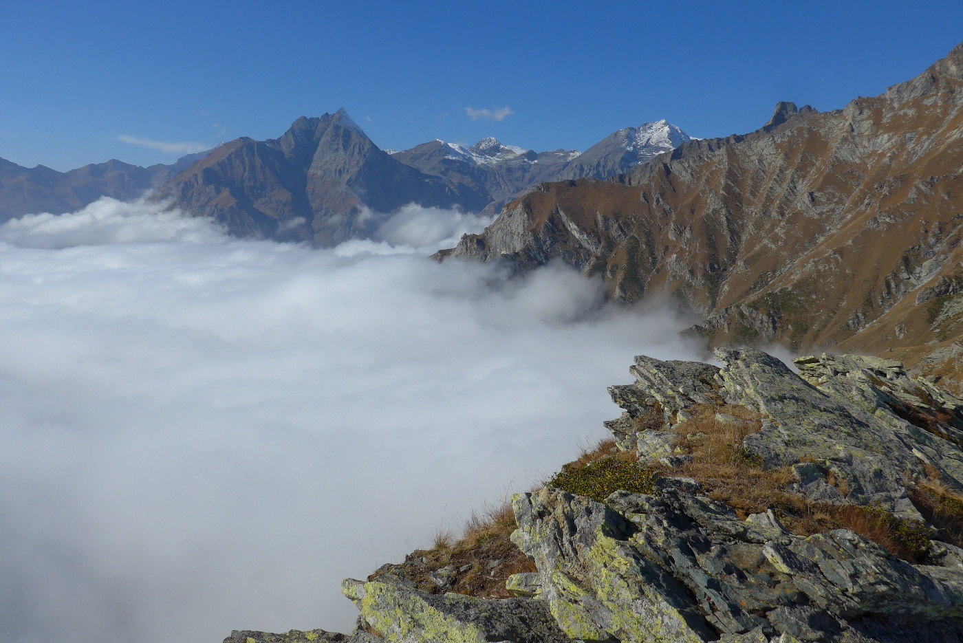 Alla partenza non avrei dato due lire per la salita, in quanto al colle non si vedeva da qua a là. Poi piano piano siamo usciti dalle nuvole, con panorami spettacolari su tutte le cime della val di Viù.