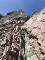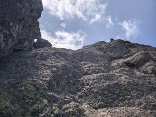 L3: Due possibilità: salire il caminetto stretto a destra della sosta e poi spostarsi per fessura orizzontale verso destra, oppure andare ancora più a destra fino al largo camino e salirlo direttamente. In entrambi i casi uscire poi dal camino verso destra dove diventa più verticale. Sosta da attrezzare su masso incastrato. (25m, V)