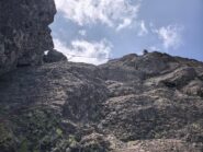 L1: Salire il camino fino a una cengia, poi a sinistra seguendo la logica fino a una seconda cengia. Sosta da attrezzare su masso incastrato (50m, IV)