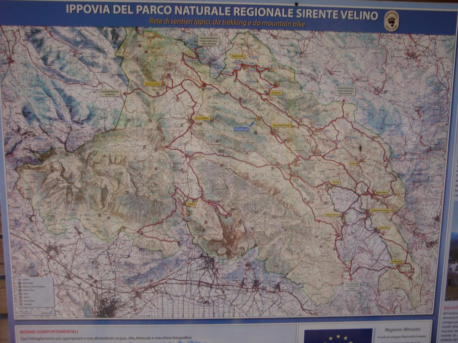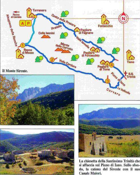 Dal cimitero di Rocca di Mezzo (1264 m)inizia una strada sterrata che si inoltra nella Valle cordora. In leggera salita,dopo un breve tratto, si giunge ad un bivio per la discarica del paese.Si continua diritti superando una brevissima rampa ed iniziando a scendere in un bel bosco.Immersi nel verde di una fitta vegetazione si giunge ad un secondo bivio.Si continua a scendere proseguendo diritti.In qualche tratto la stradina sembra quasi scomparire diventando un’esile traccia erbosa e la vegetazione esuberante ai lati, tende ad invadere e restringere lo spazio centrale.Dove il bosco si dirada appare sulla dx il M.Sirente.Dopo aver percorso un tratto molto tecnico per il fondo sassoso e dissestato, la discesa termina e si giunge all’inizio di una zona piena di piccole colline erbose (Vallicelle).Si continua ancora in leggera discesa fino a quando la strada si immette su una pista erbosa.Qui si inverte il senso di marcia e si prosegue a sx con una leggera salitella ad un piccolo valico.Da qui rapida discesa molto sassosa e dissestata verso il Piano di Iano. (990 m).Si prosegue attraversando il Piano in direzione Nord puntando alla Chiesa di S.S. Trinità (1025 m),posta in prossimità di una grossa sterrata proveniente da Terranera.Si supera una rampa ripidissima e si giunge sulla sterrata.Si gira a sx arrivando in breve con leggera salita al bivio per le Pagliare di Tione(1084 m).Piccola deviazione per visitare l’insediamento rurale,situato in una invidiabile posizione panoramica.Si riprende poi la sterrata e ad un grosso bivio si continua a sx raggiungendo dopo un pò il bivio a sx per le Pagliare di Fontecchio e poi un secondo bivio a dx per le Pagliare di Fagnano.Continuando per la sterrata che percorre la Valle Iannella, si raggiunge il borgo di Terranera (1274 m).Da qui con la pista ciclabile (asfalto coperto da ghiaino) si ritorna al punto di partenza (cimitero di Rocca di Mezzo)