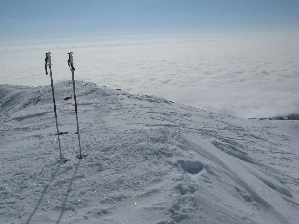 Poca neve e manto discontinuo fino a quota 1050 circa, poi bel percorso in dorsale fino alla cima su una mega traccia ben battuta. In alto, cresta con neve molto ventata, crosta quasi portante, con leggeri cedimenti.