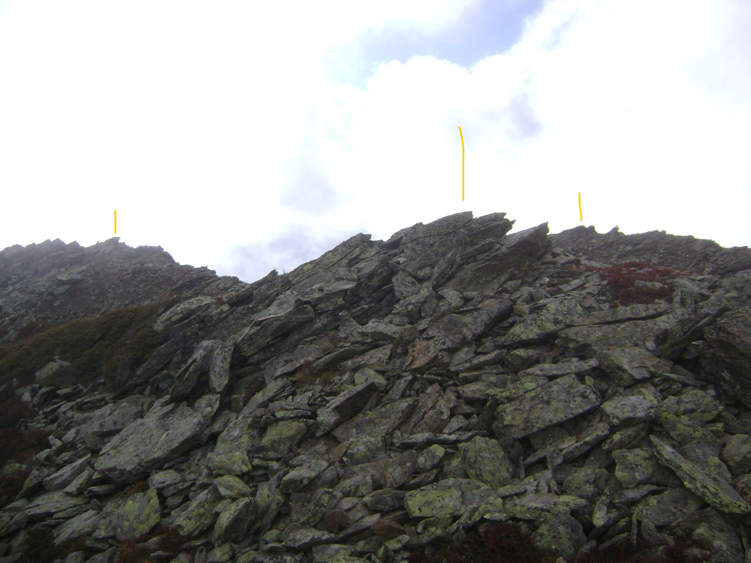 La vetta è uno stretto “catino” con lievi spuntoni di roccia che contengono una conca d’erba e pietre. Sui tre più alti rilievi il mio gps (che per onestà non è sempre precisissimo) mi dava la stessa altitudine. Comunque sia, uno di questi tre è la vetta. Poco oltre, percorrendo la traccia si raggiunge un ometto con panorama verso Etroubles.