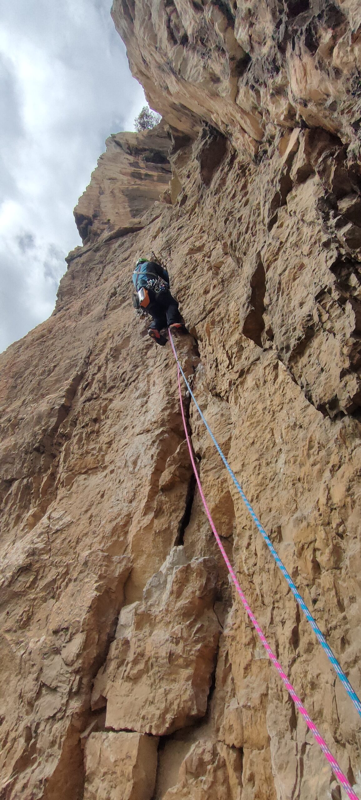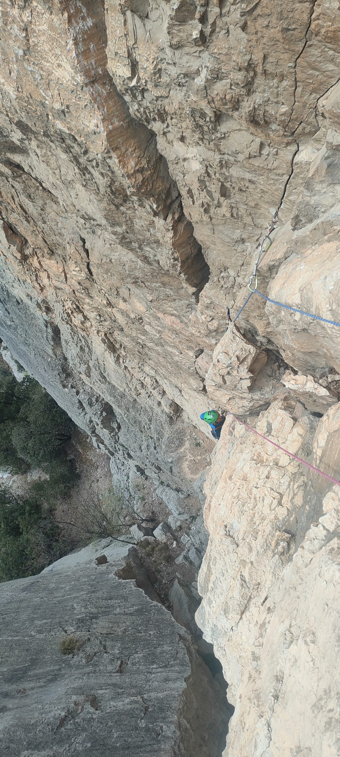 proseguire verso destra in direzione del camino tra la parete ed il grosso pilastro. Sostare all’inizio del camino (2 chiodi+cordone).