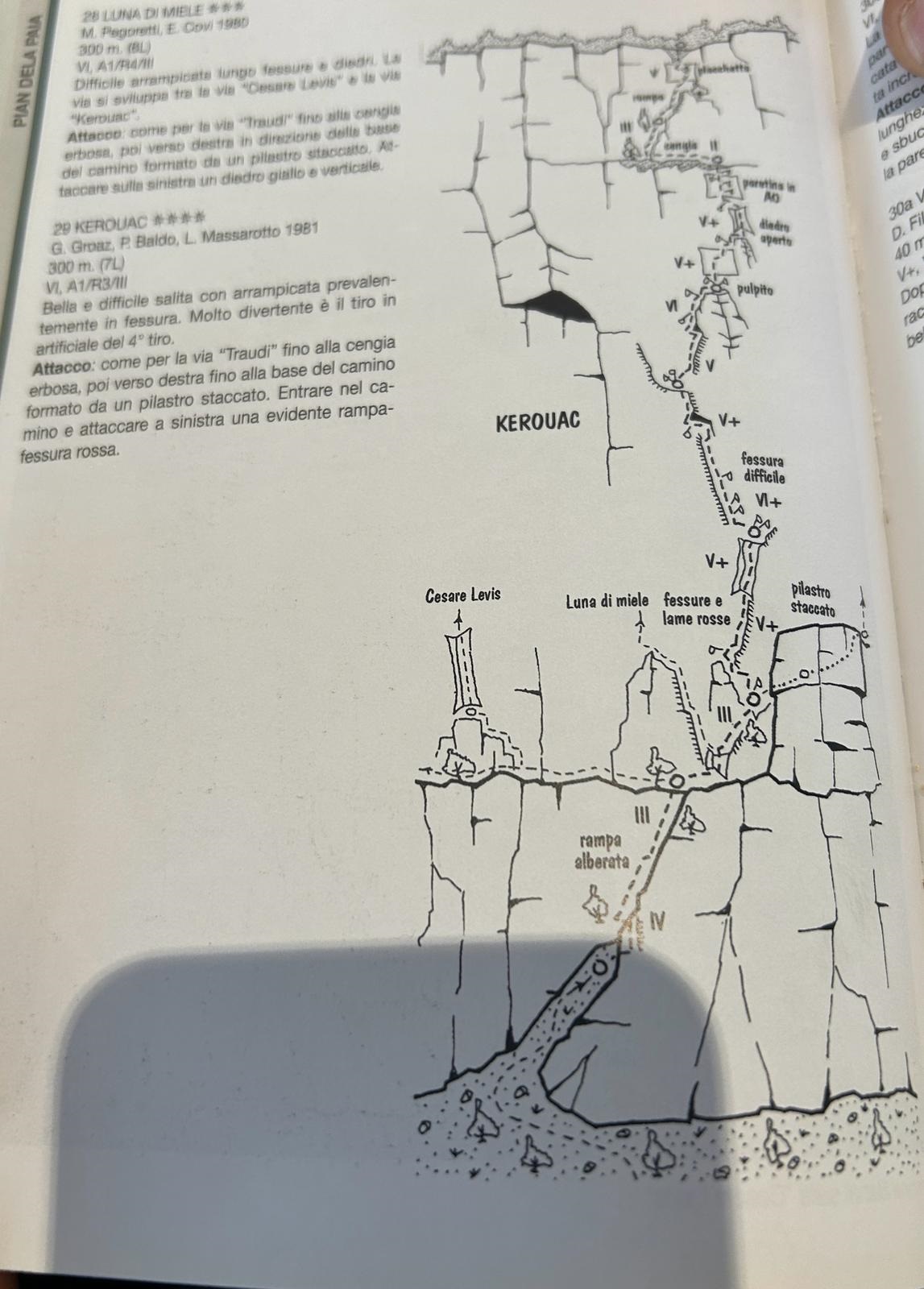 dritti sopra la sosta, poi è necessario spostarsi a destra entrando in un diedrino che porta alla difficile placca soprastante oltre la quale si sosta (2 chiodi). 35 Mt., V+, VII+ oppure A0, 9 chiodi, 1 clessidra con cordone.