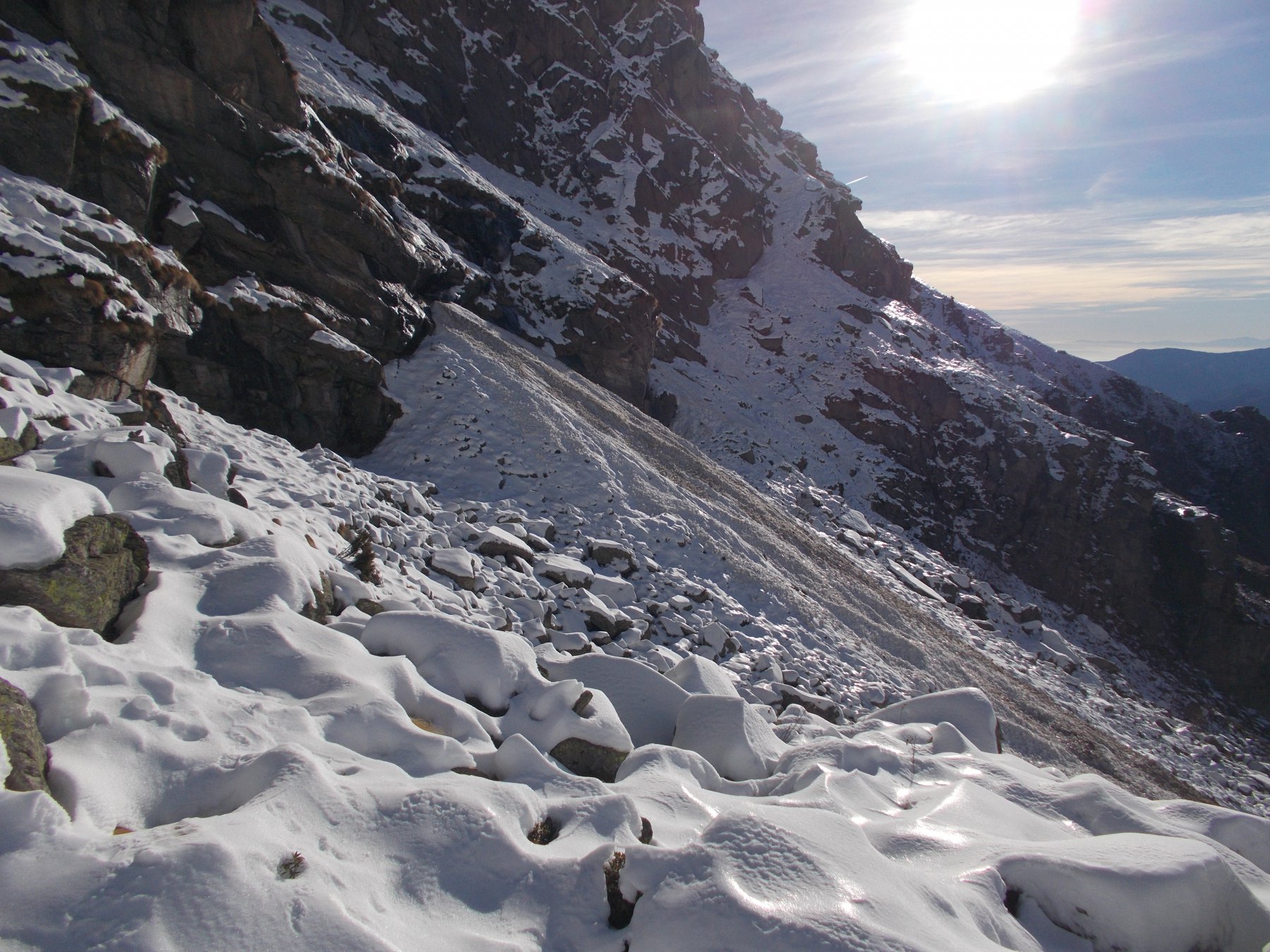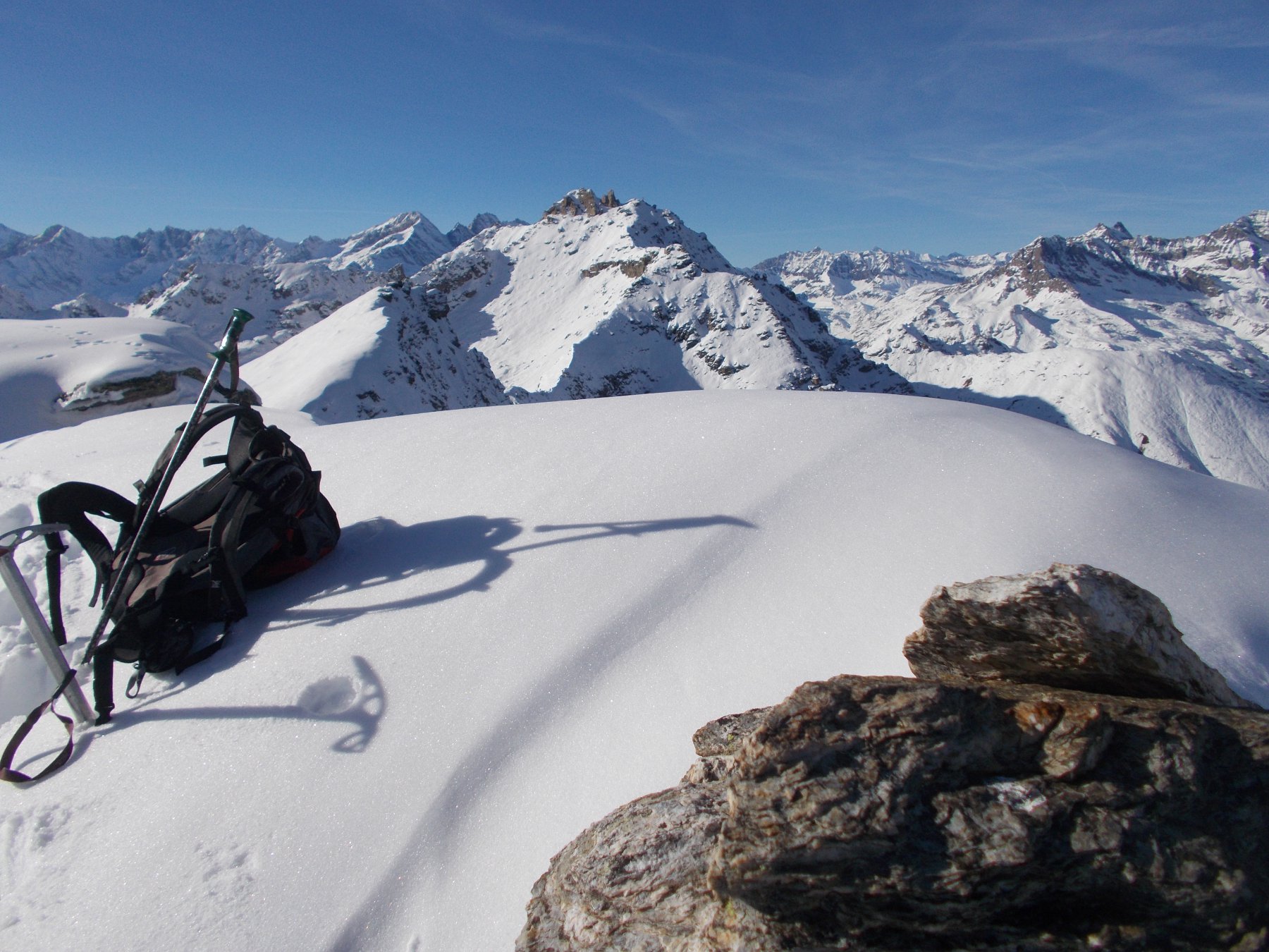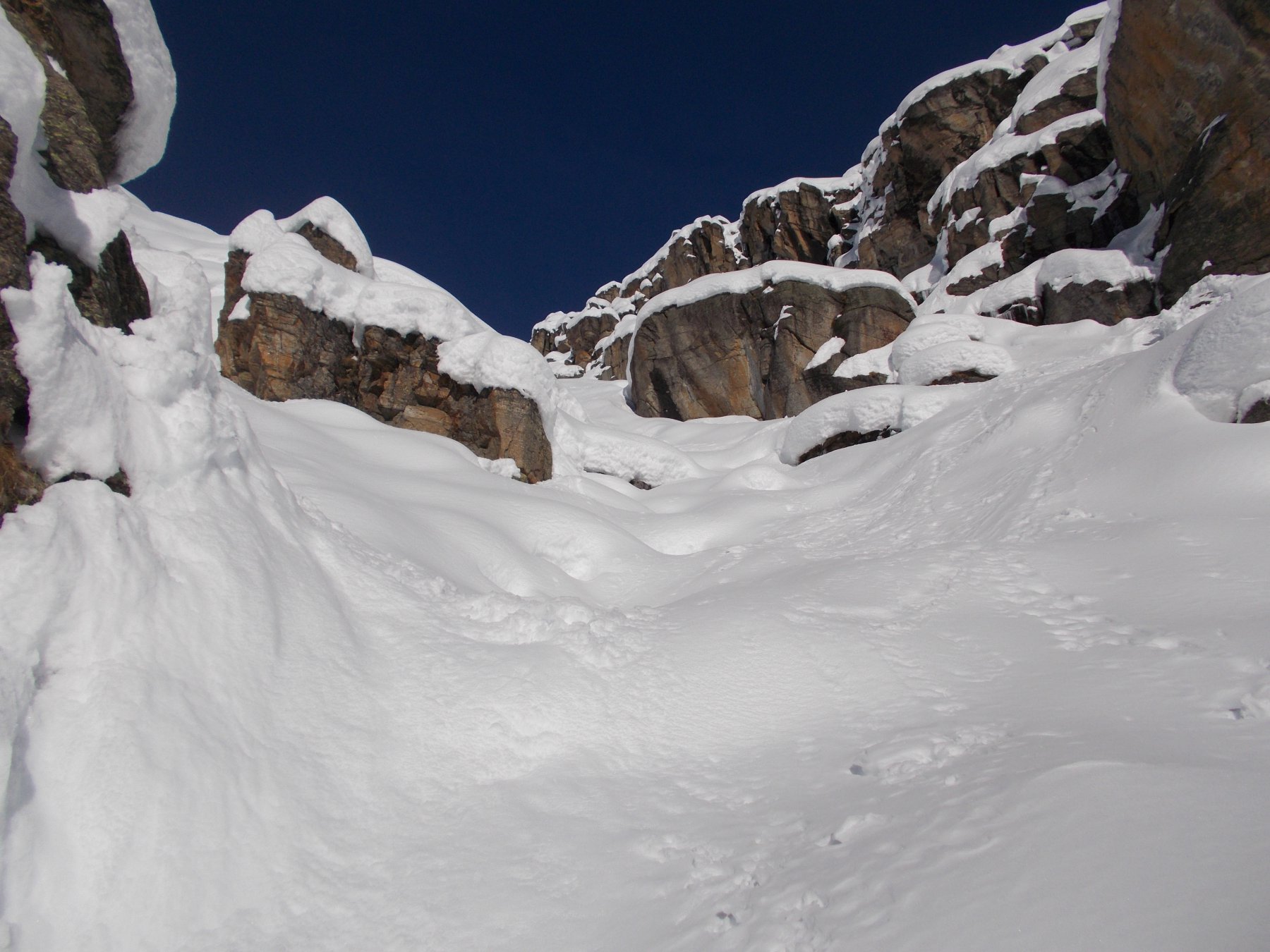 la Salita al Tovo piccolo, e’ di sicuro invitante ma non banale, per neve instabile lungo il breve e, al contempo esposto tratto di cresta ( la ovest) che dal colletto tira su dritta sulla destra fino in punta. In comune per gran parte con la salita alla Testa Paiaire, c’e’ tutto il lungo avvicinamento incluso il canale sul finale di gita, oggi interessato da piccole slavine, scese di recente a creare qualche intoppo, non tanto in fase di salita (con i ramponi tanto quanto.bene o male si sale.) quanto in discesa, per difficolta’ a mantenere il controllo degli sci su terreno decisamente brutto. Per trovare la prima neve allo stato attuale delle cose, sono 2h 30 di sci in spalla da Vonzo, ma poi vuoi per lo scarso innevamento iniziale, (a partire da 1900m praticamente all’altezza dell’Alpe Balmot), vuoi per il terreno alquanto accidentato in questa fase centrale della salita, gli sci non si calzano che poco prima di essere in vista del canale, la cui risalita da subito si presenta problematica. La neve non sara’ stata tanta, ma per quel poco che si riconducevaa ad essere il tratto sciabile, e’ rimasta intatta con due dita di fresca su fondo duro. Una vera goduria..peccato solo di breva durata.