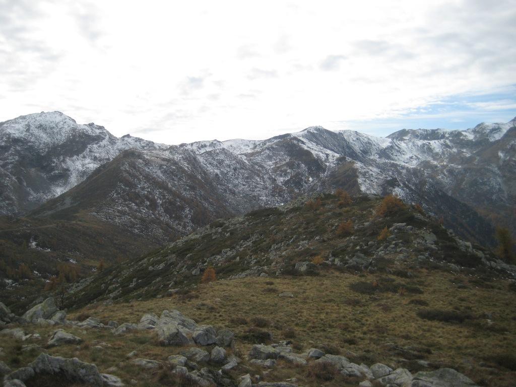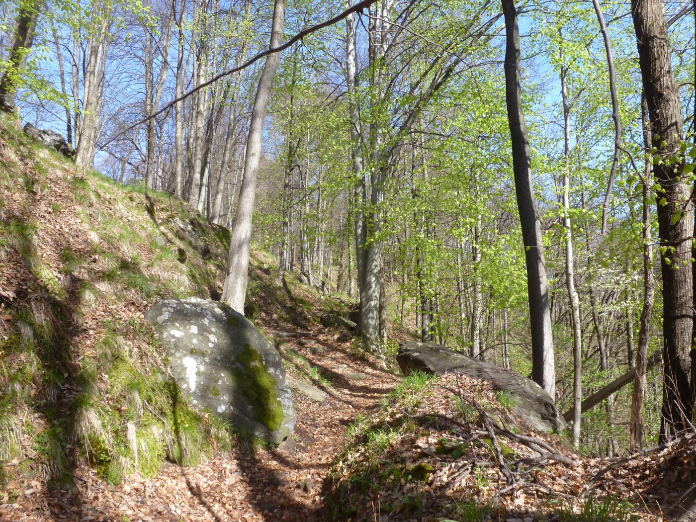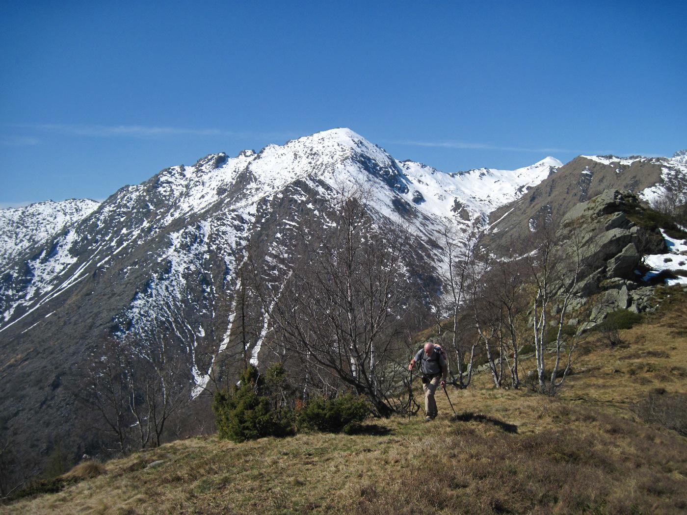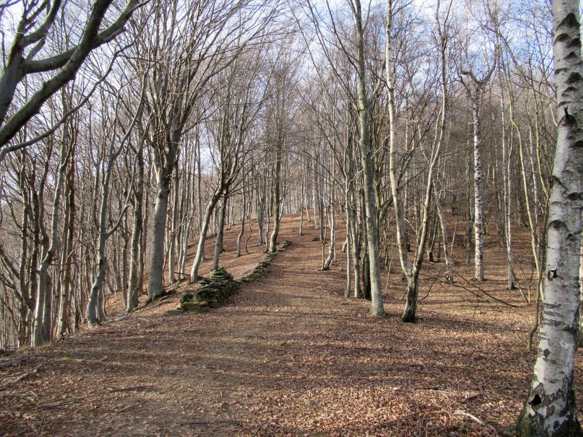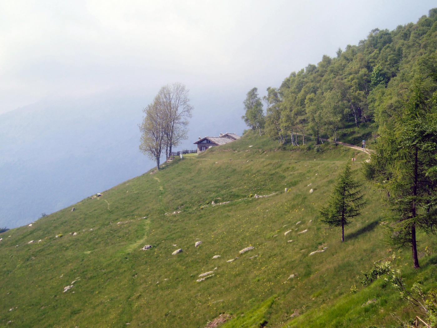Qui voltare a destra (cartello) su un sentiero che inizia a risalire l’intera dorsale sul filo fino alla Testa della Cialma 1620 m, per poi spostarsi con un lungo traverso sul versante nord fino a passare sotto l’Alpe del Conte 1767 m.
