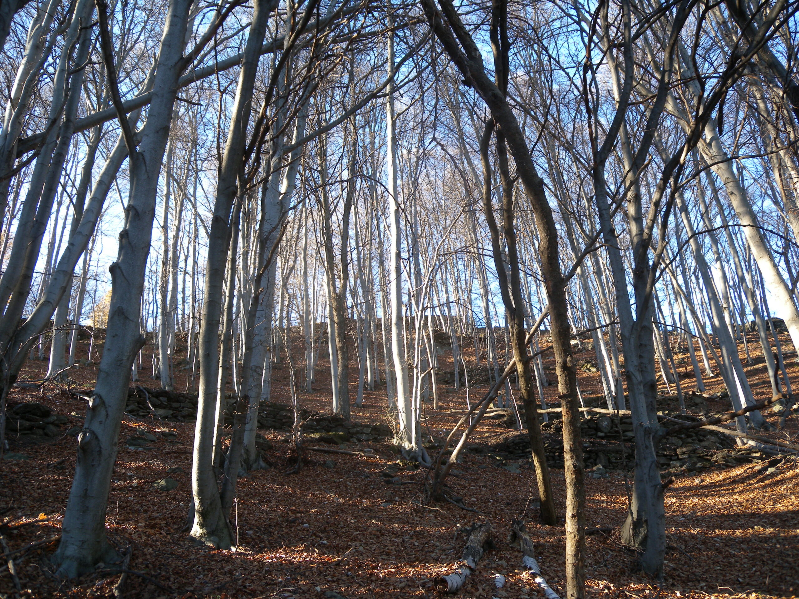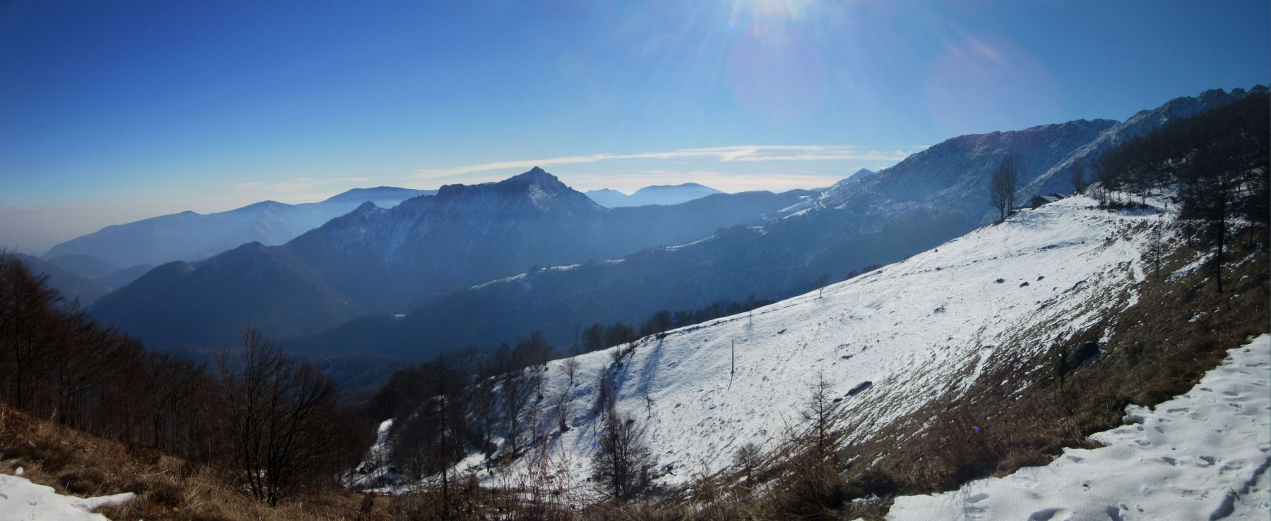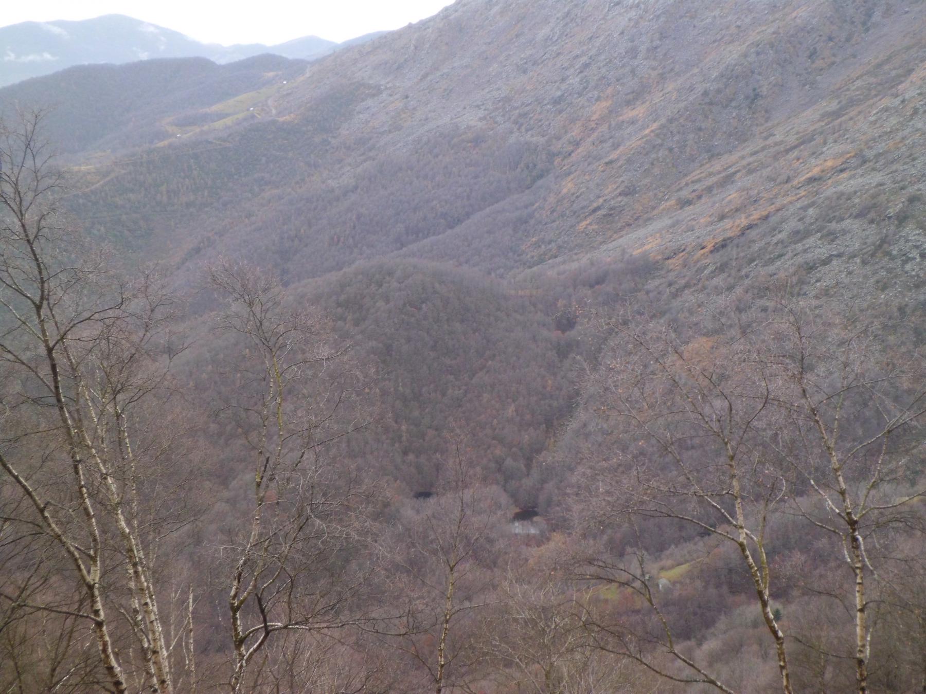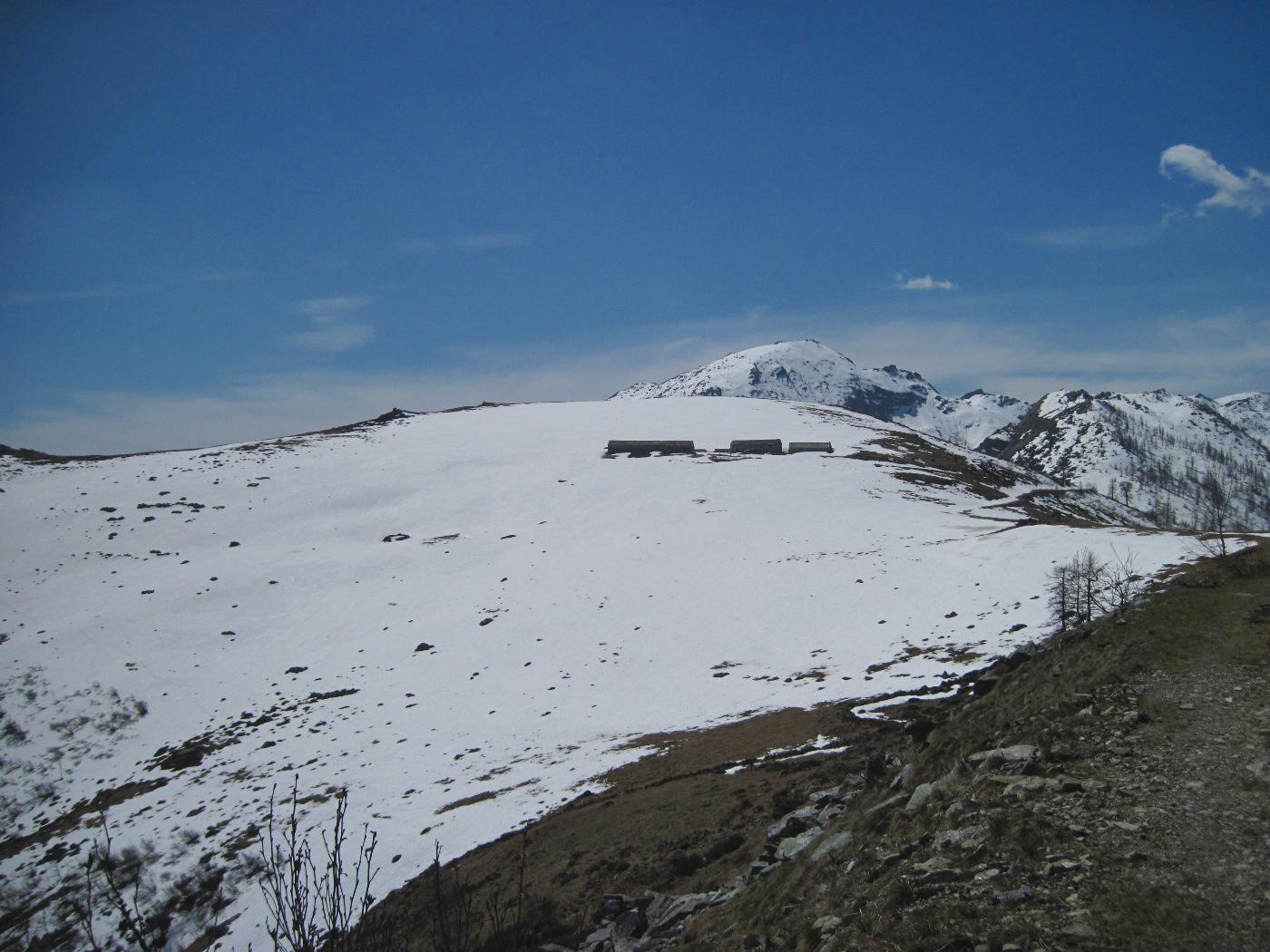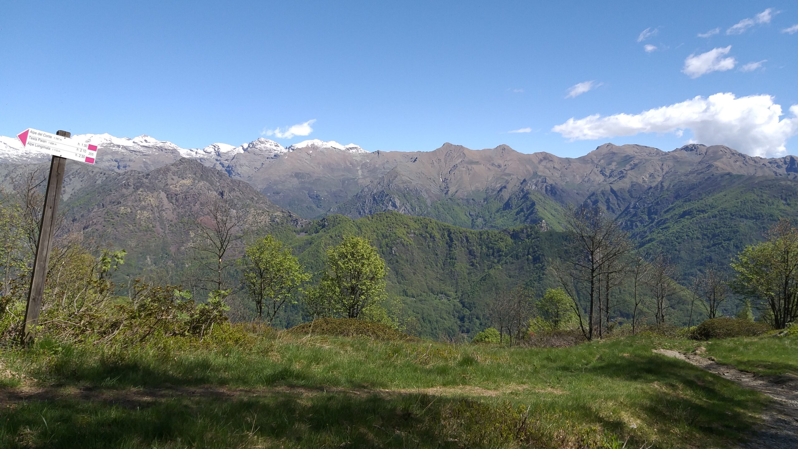 Qui voltare a destra (cartello) su un sentiero che inizia a risalire l’intera dorsale sul filo fino alla Testa della Cialma 1620 m, per poi spostarsi con un lungo traverso sul versante nord fino a passare sotto l’Alpe del Conte 1767 m.