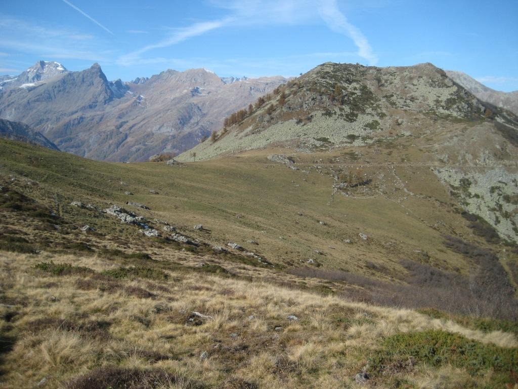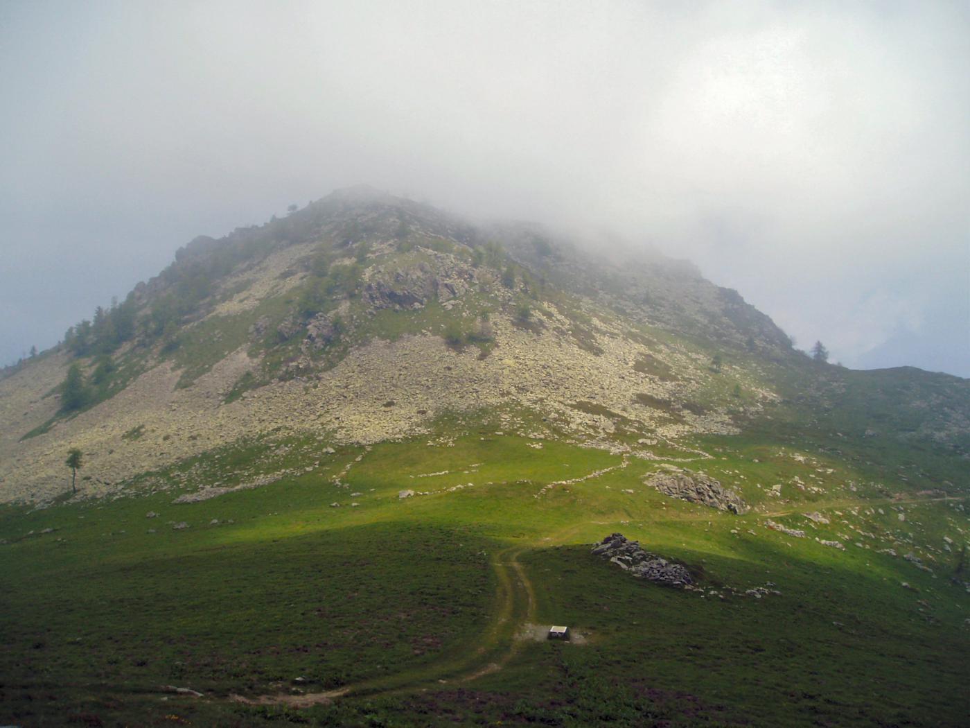 Con un traverso dirigersi verso il colle a nord dell’Alpe e di qui per prati seguendo gli ometti fino in punta.