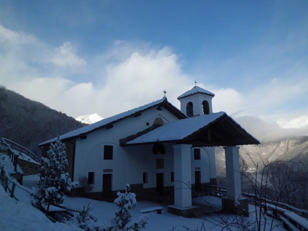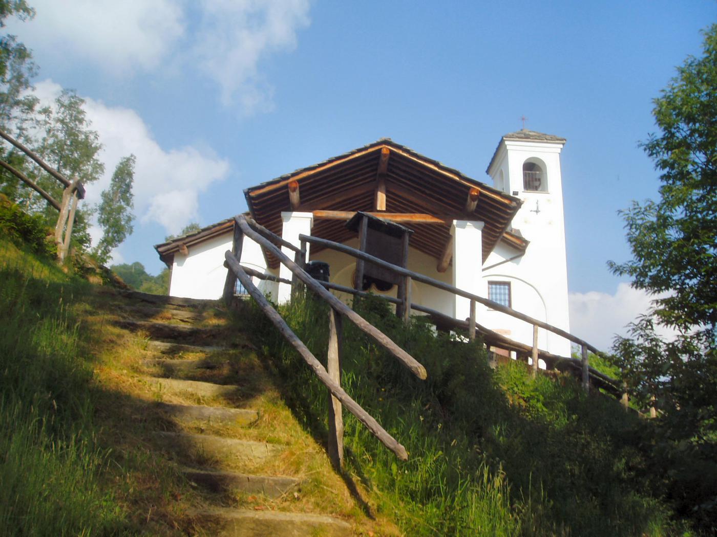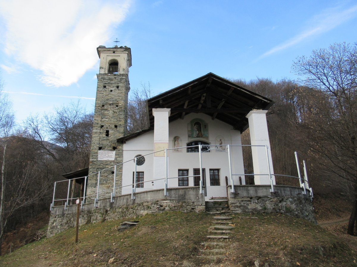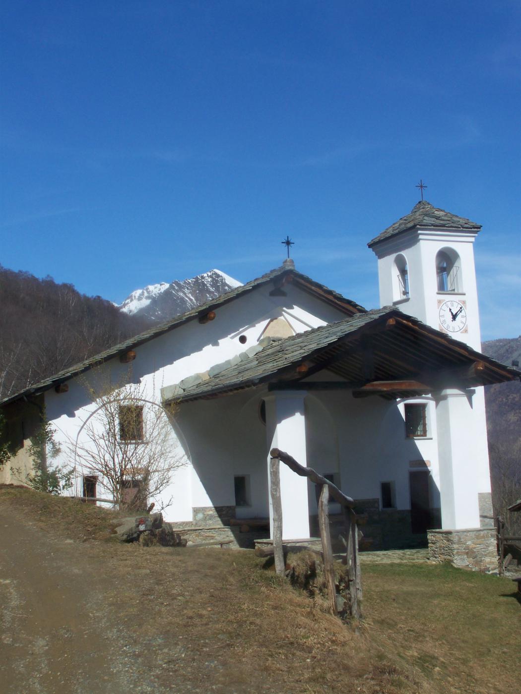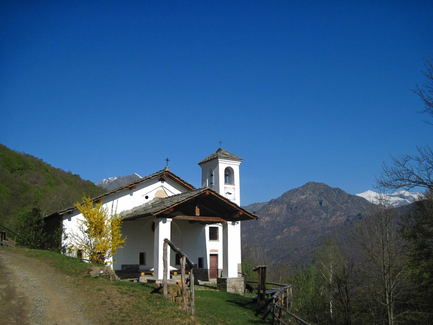 Percorrere la strada prima asfaltata e poi sterrata che sale verso la cappella della Consolata. Una mulattiera nel bosco, ben indicata, permette di tagliare numerosi tornanti costeggiando alcuni piloni votivi fino a raggiungere la cappella a 1073 m. Proseguire lungo la strada, utilizzando eventualmente le molte scorciatoie (sempre segnate con tacche bianche e rosse) fino ad arrivare in vista dell’’Alpe Belvedere.