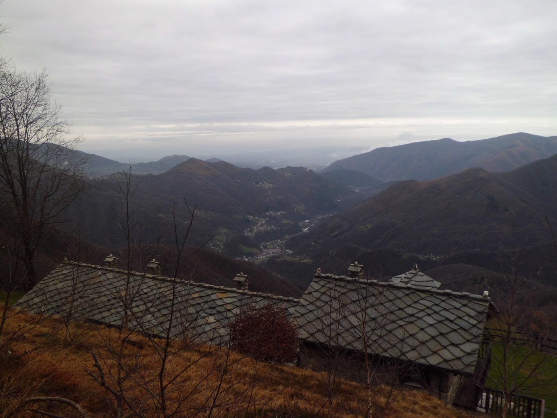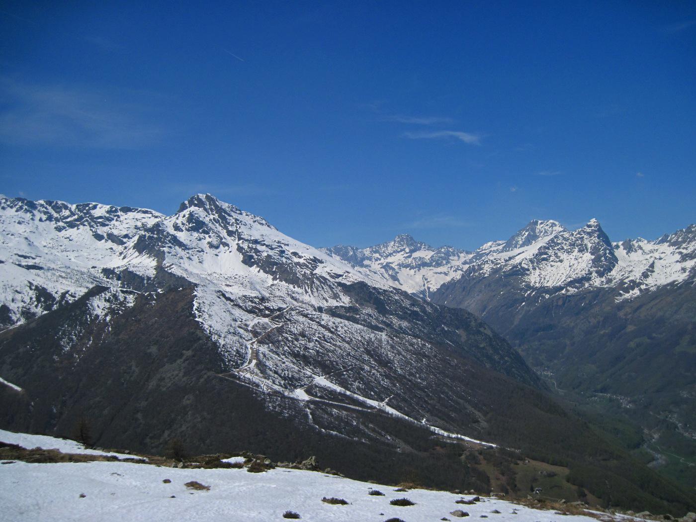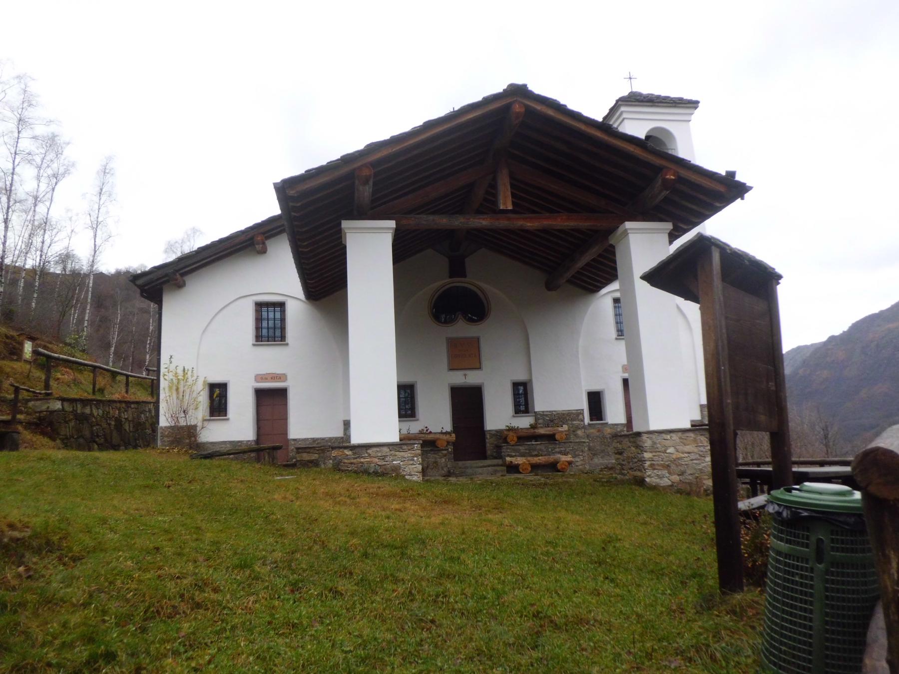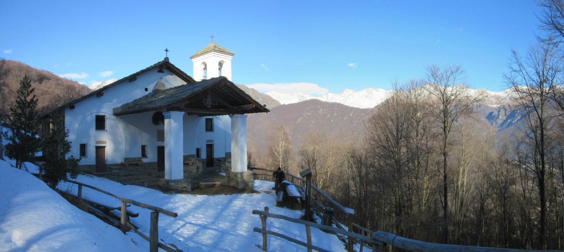 Percorrere la strada prima asfaltata e poi sterrata che sale verso la cappella della Consolata. Una mulattiera nel bosco, ben indicata, permette di tagliare numerosi tornanti costeggiando alcuni piloni votivi fino a raggiungere la cappella a 1073 m. Proseguire lungo la strada, utilizzando eventualmente le molte scorciatoie (sempre segnate con tacche bianche e rosse) fino ad arrivare in vista dell’’Alpe Belvedere.