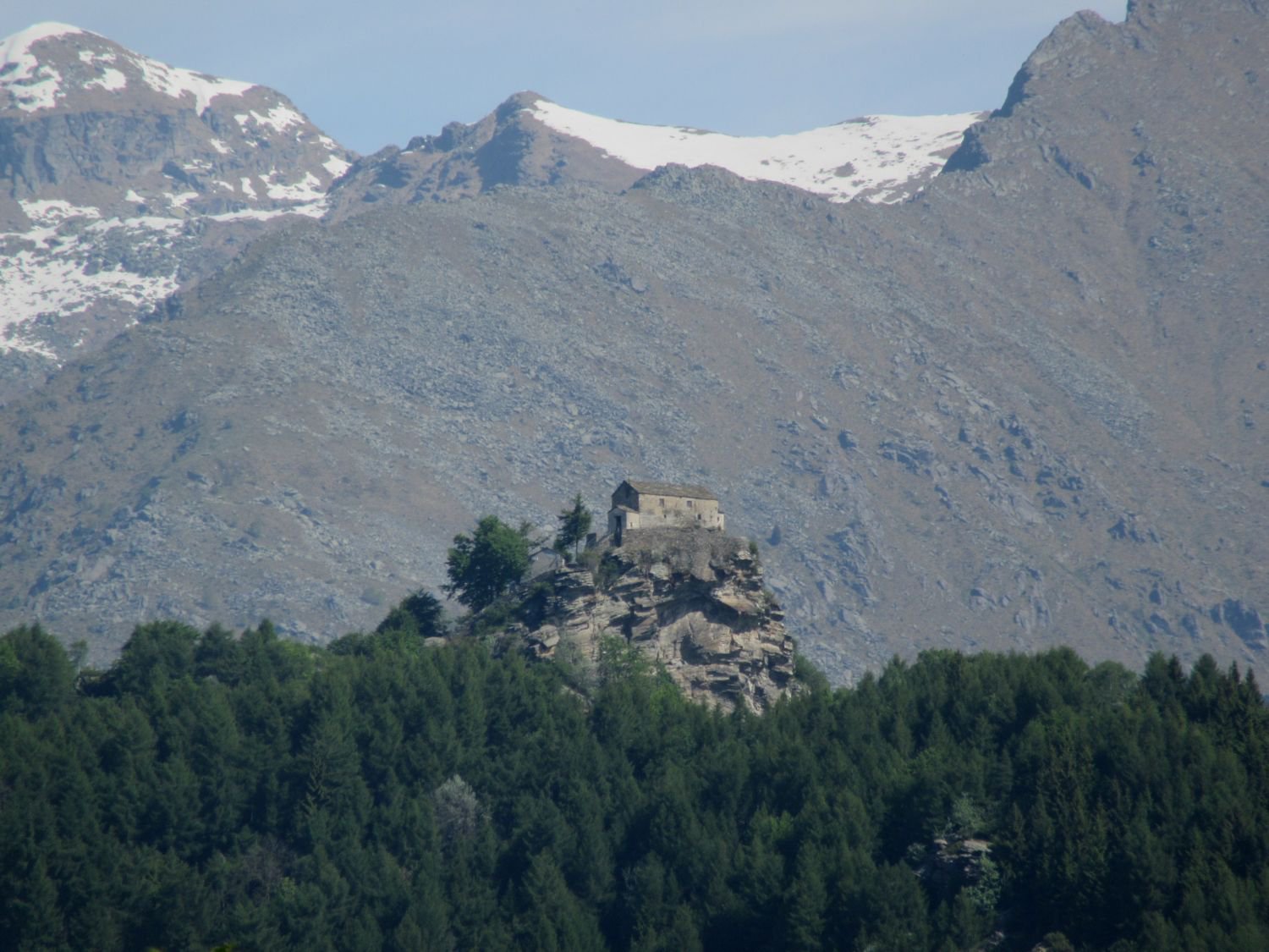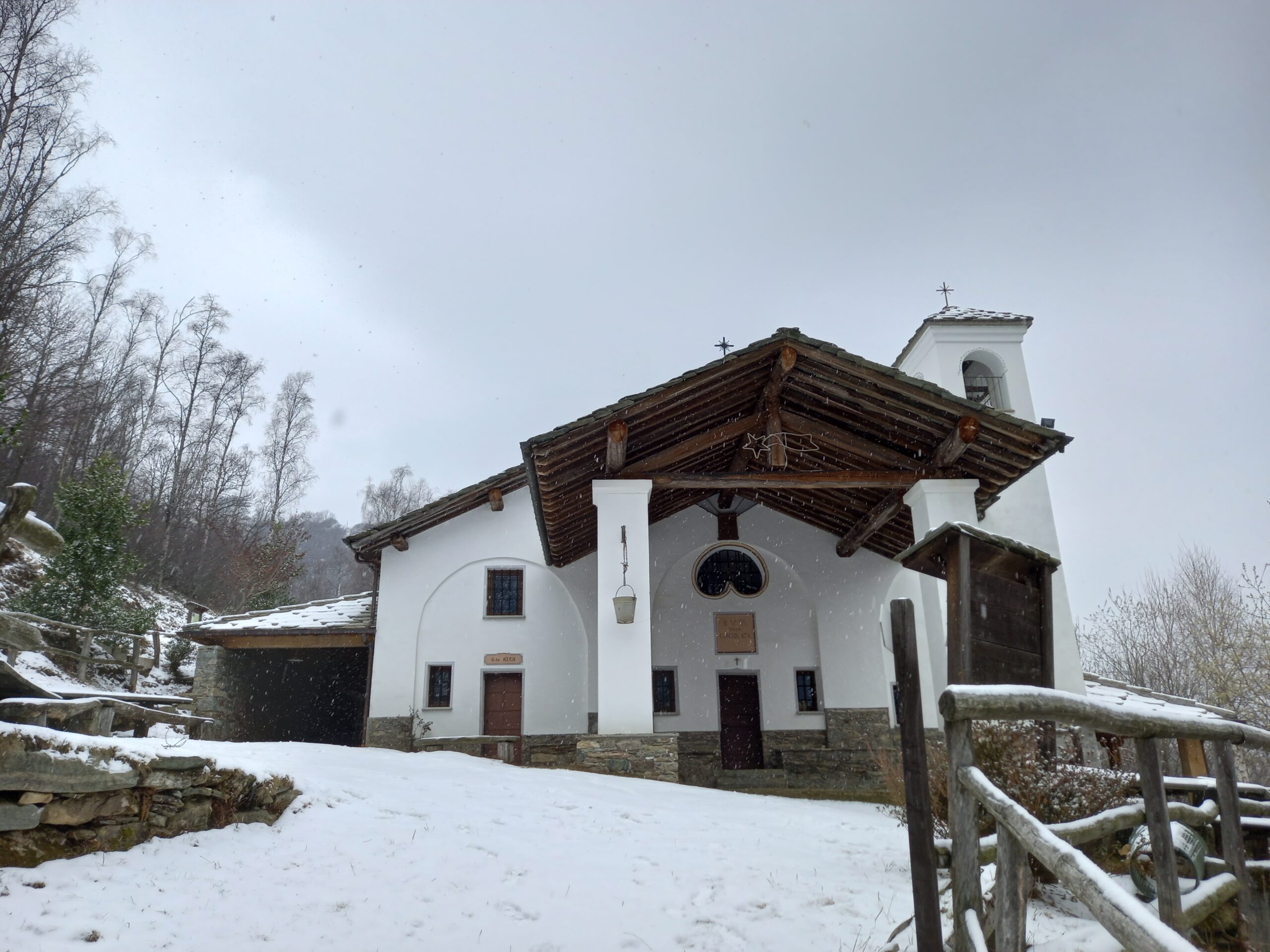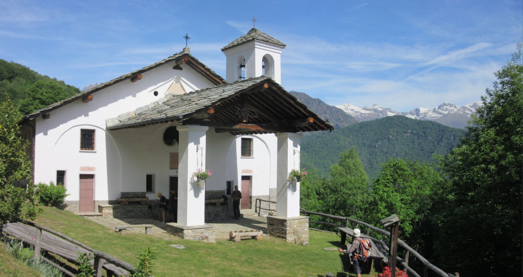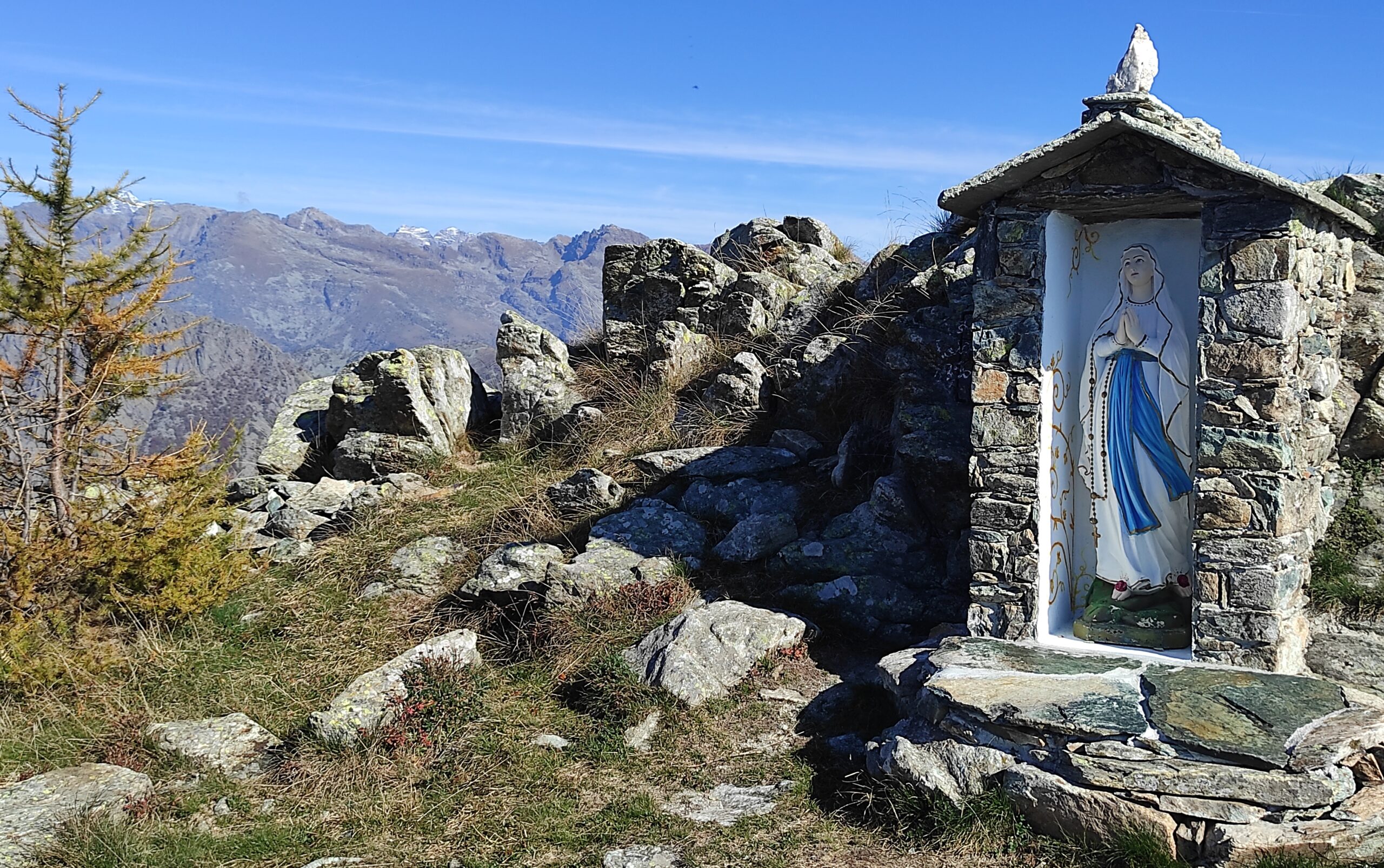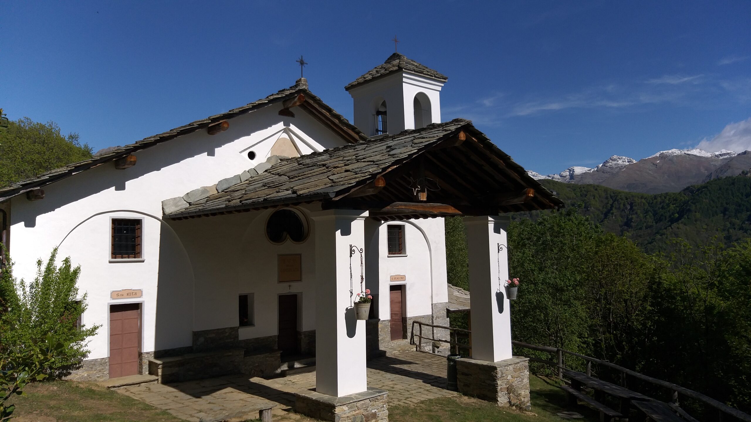 Percorrere la strada prima asfaltata e poi sterrata che sale verso la cappella della Consolata. Una mulattiera nel bosco, ben indicata, permette di tagliare numerosi tornanti costeggiando alcuni piloni votivi fino a raggiungere la cappella a 1073 m. Proseguire lungo la strada, utilizzando eventualmente le molte scorciatoie (sempre segnate con tacche bianche e rosse) fino ad arrivare in vista dell’’Alpe Belvedere.