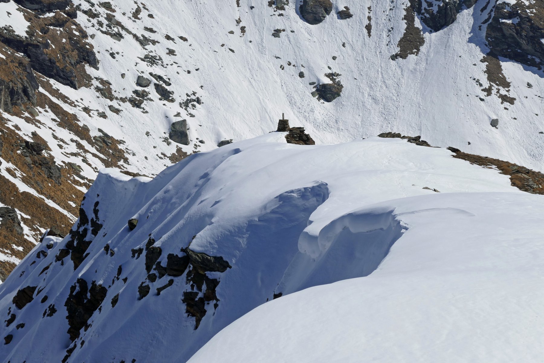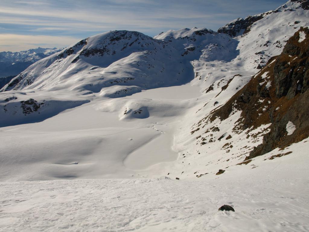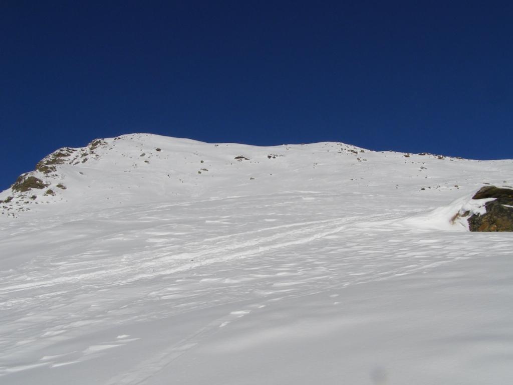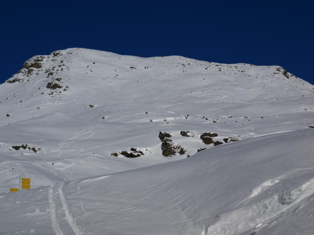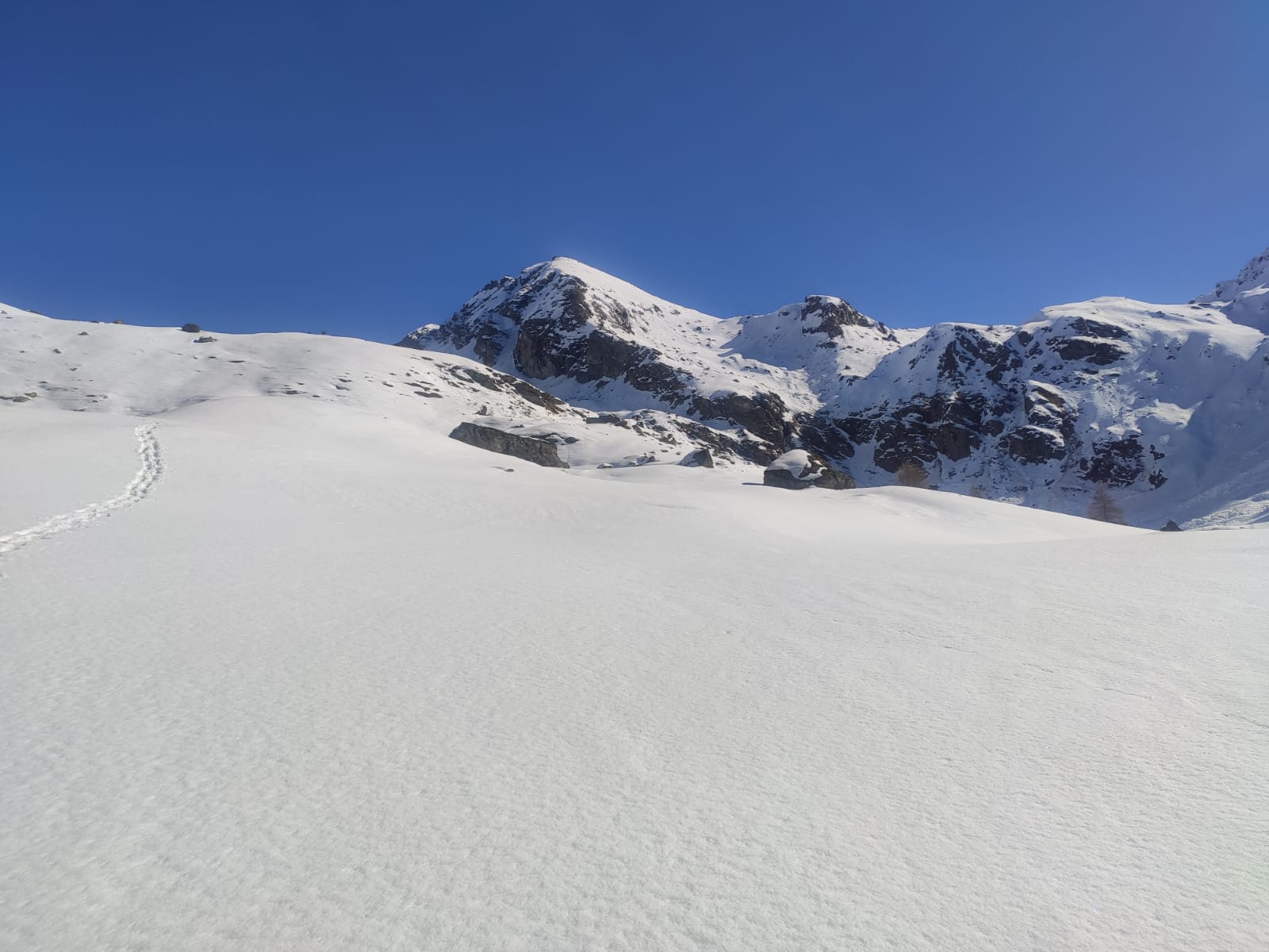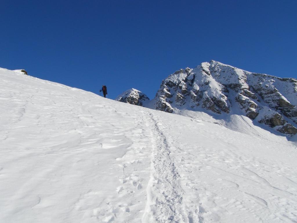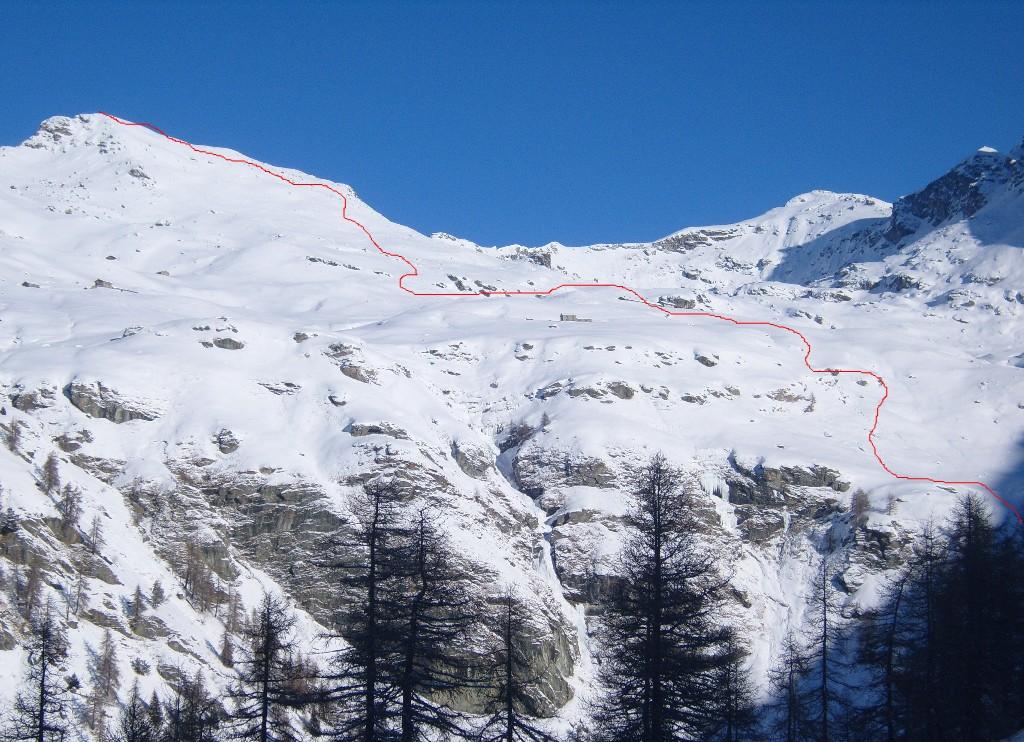 Nella parte mediana si attraversa un pendio soggetto a slavine,bisogna quindi fare attenzione all'assestamento della neve altrimenti si puo' evitare di passarci sotto rimanendo in basso al vallone sotto il rifugio Arp tutto a sinistra salendo in modo piu' sicuro e con pendio meno ripido.