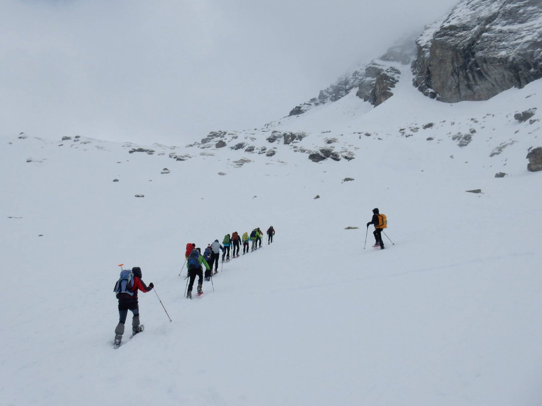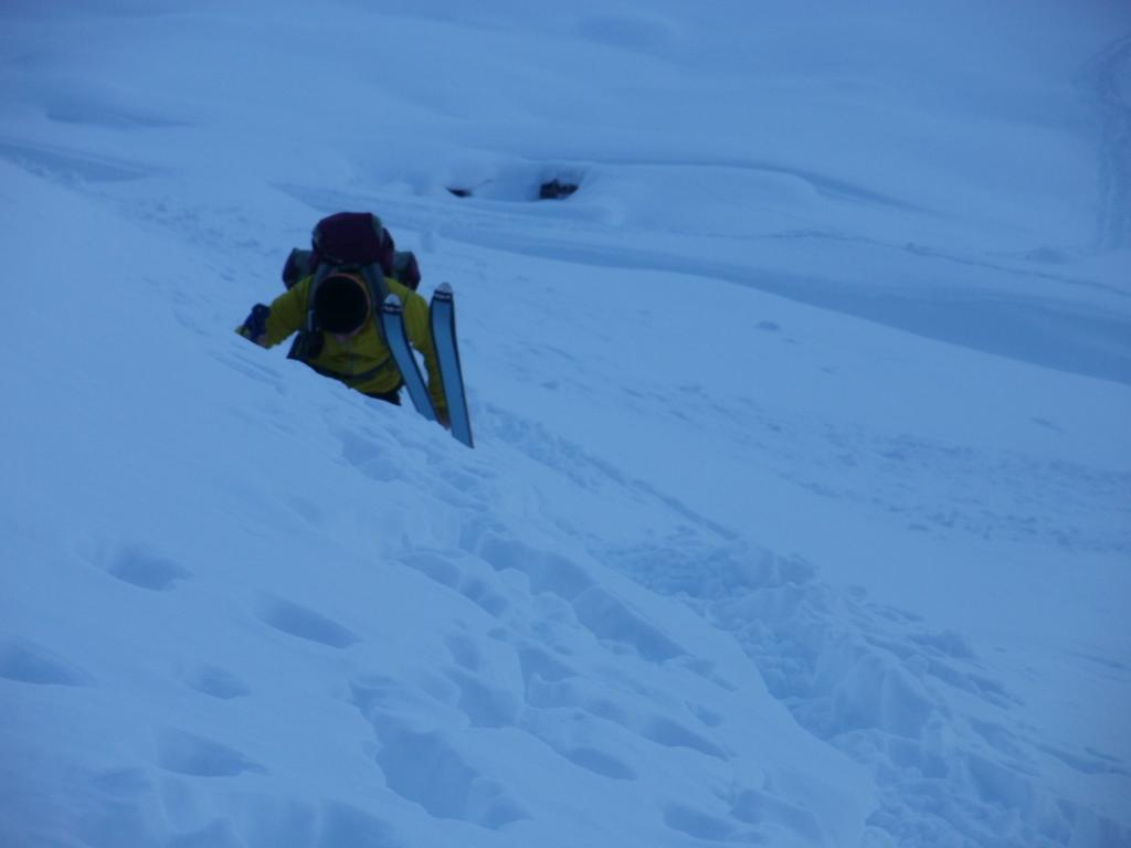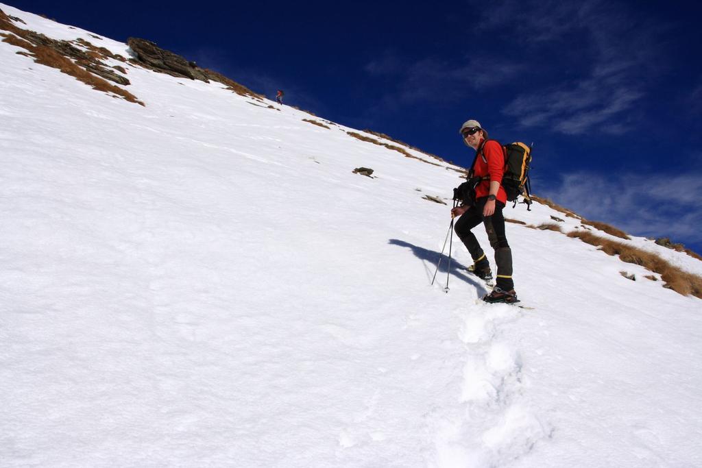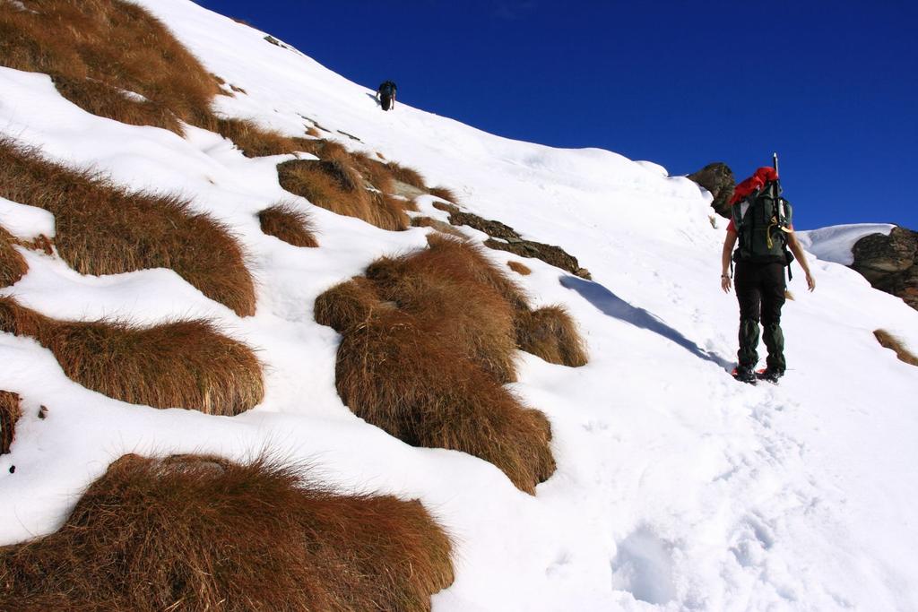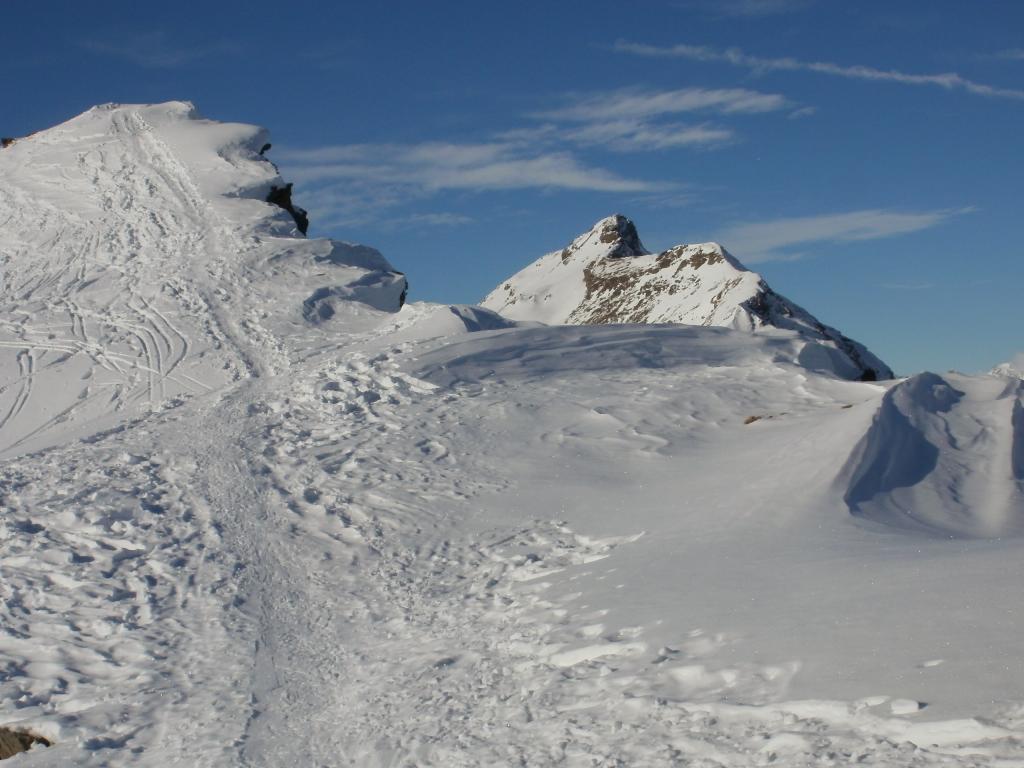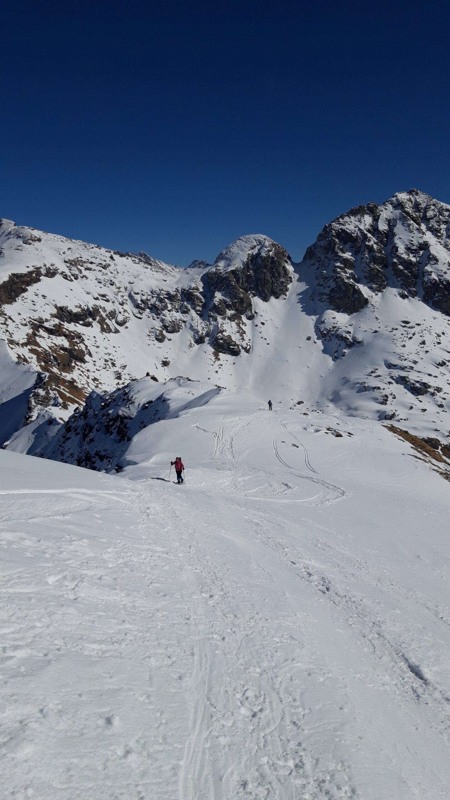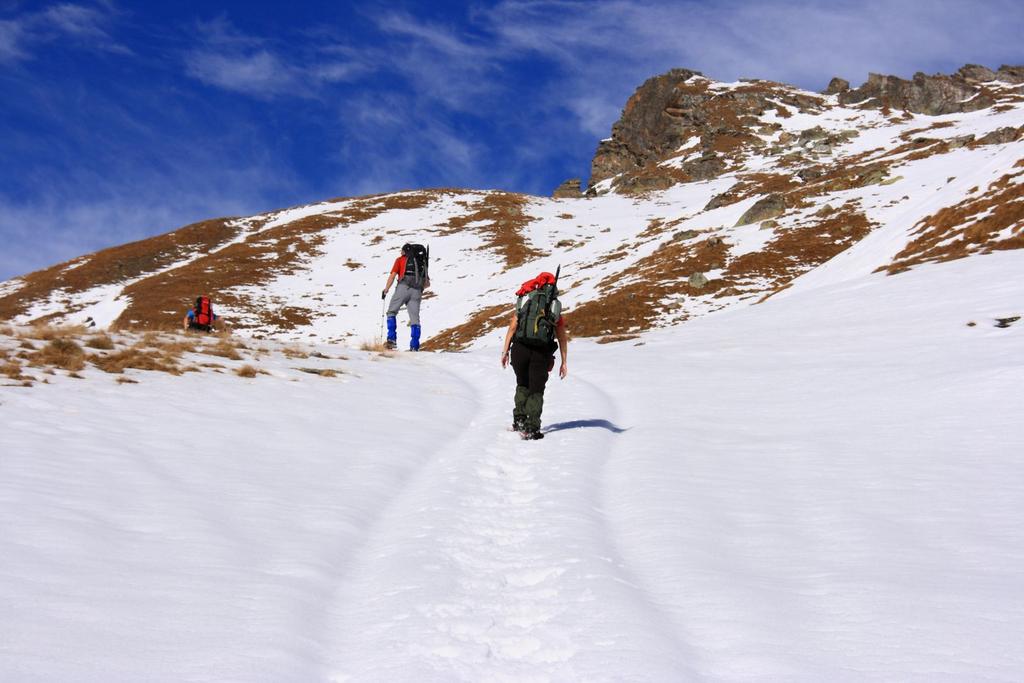 Nella parte mediana si attraversa un pendio soggetto a slavine,bisogna quindi fare attenzione all'assestamento della neve altrimenti si puo' evitare di passarci sotto rimanendo in basso al vallone sotto il rifugio Arp tutto a sinistra salendo in modo piu' sicuro e con pendio meno ripido.