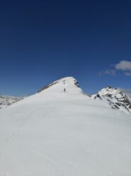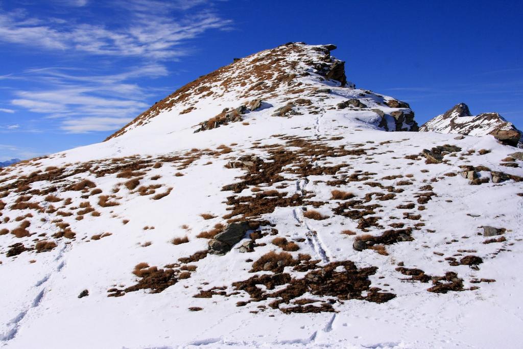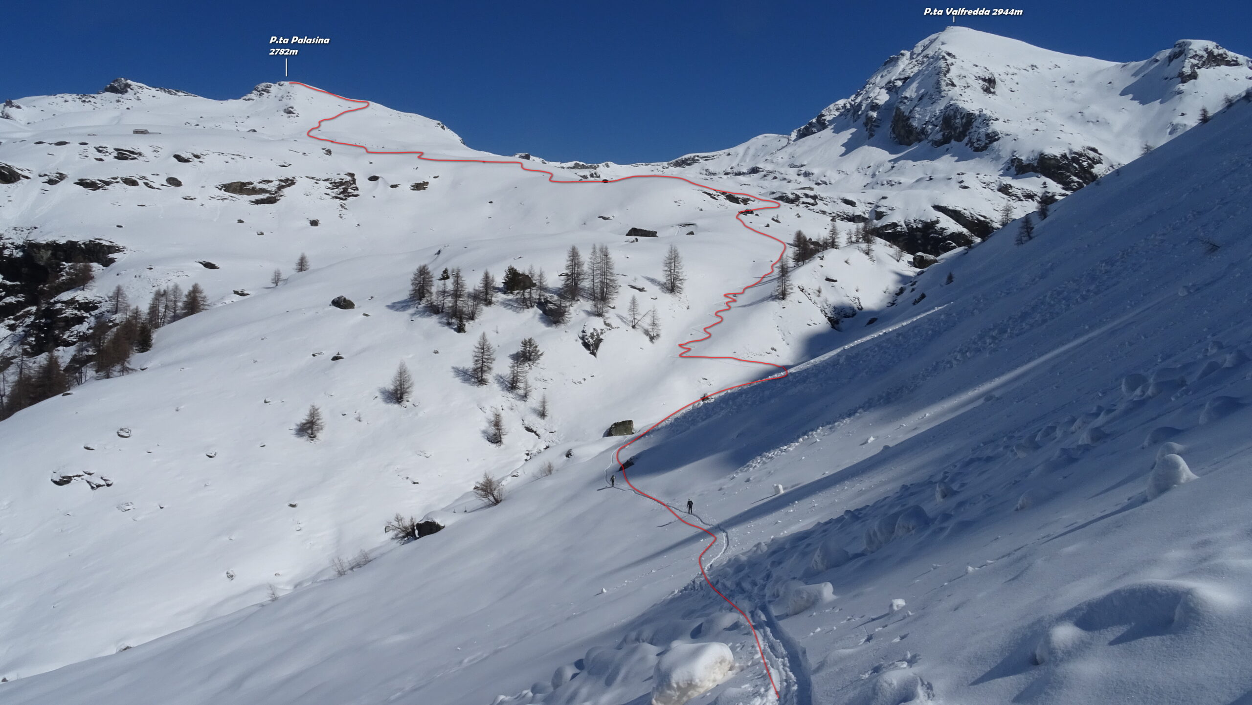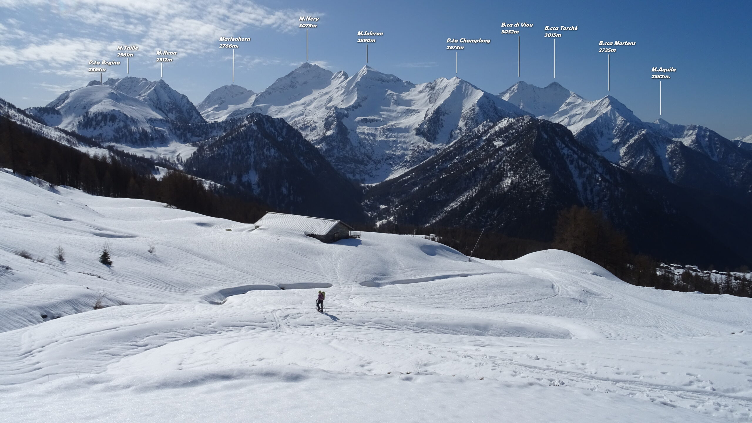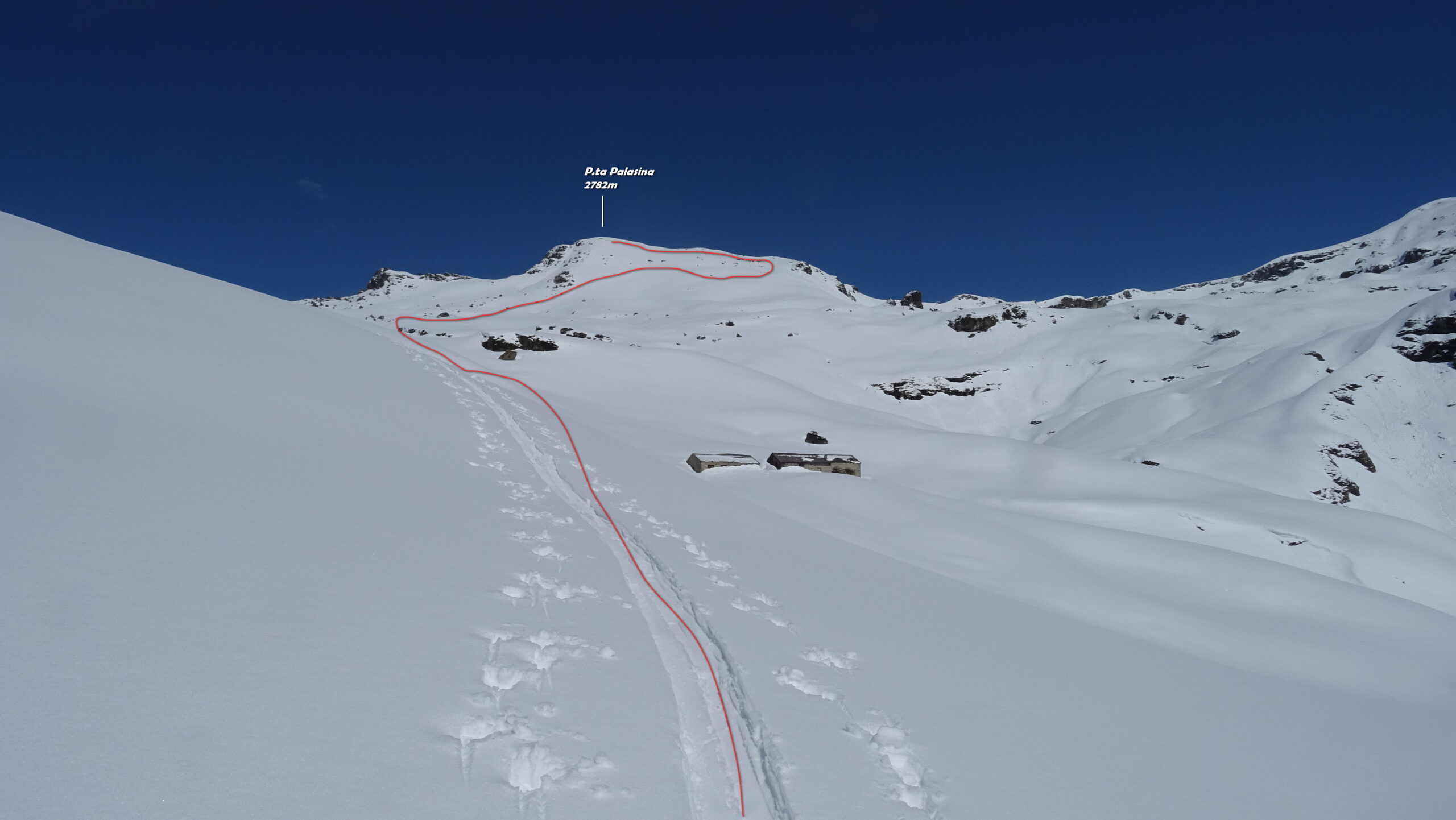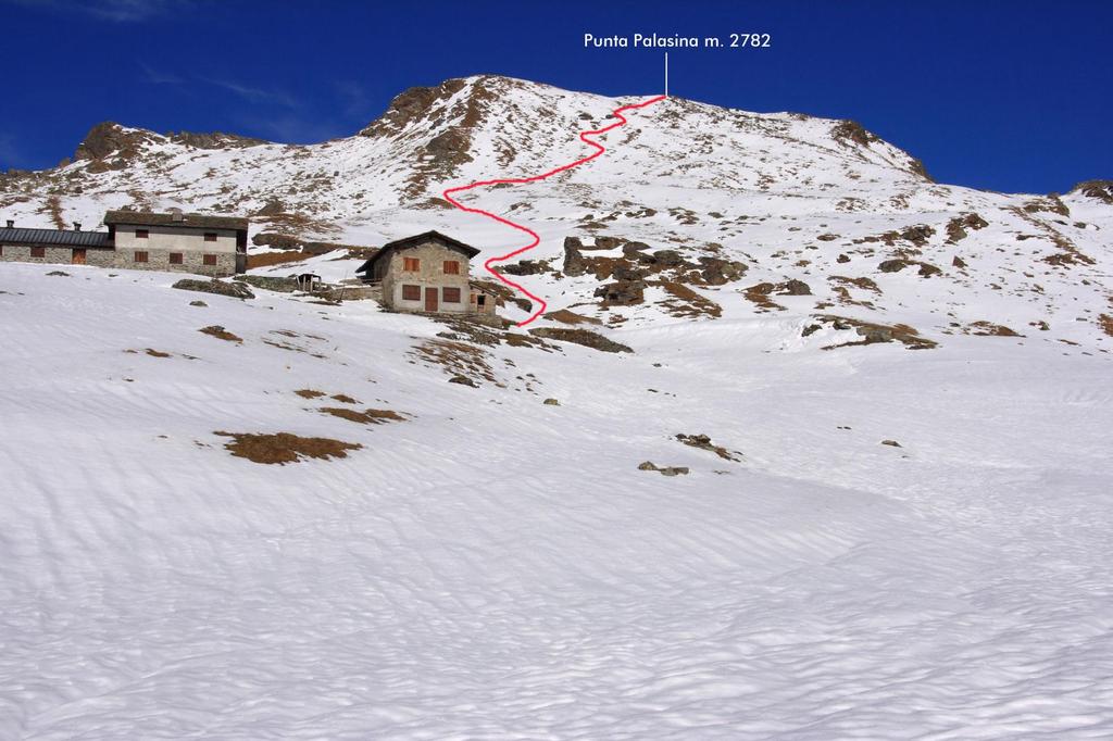 Si risale la dorsale a sinistra portandosi in breve nei pressi di un gruppo di baite che si superano puntando verso la retrostante Punta Palasinaz la cui vetta si raggiunge senza particolari difficoltà.