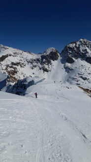 Si attraversa un torrente e si inizia a risalire l’altro versante fino a portarsi sopra la conca dominata dalla Punta Valfredda.
