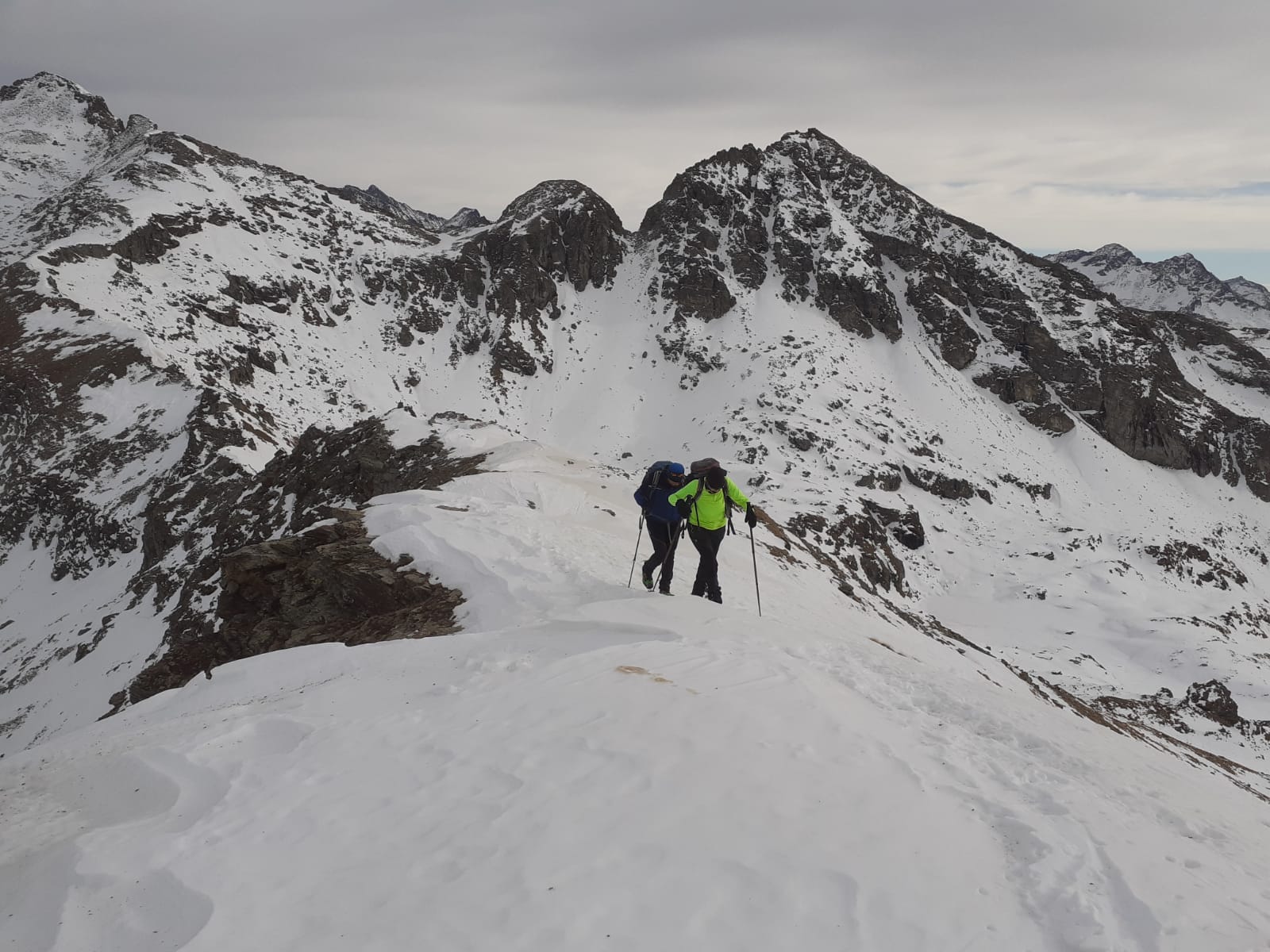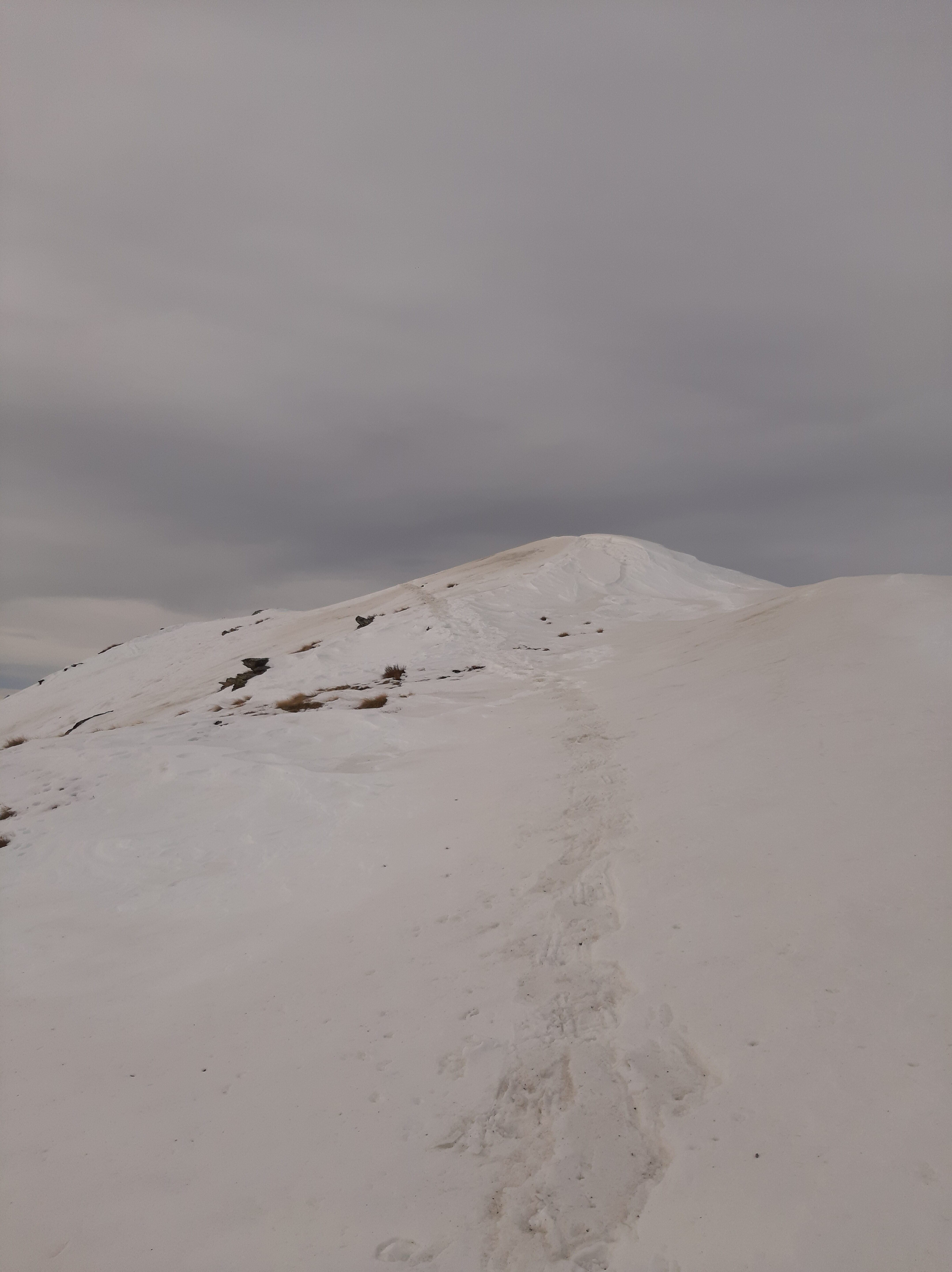 Traccia presente fino in vetta. Messo subito le ciaspole, ma la neve bella è un’altra roba. La traccia finale si tiene più a sx rispetto allo standard. È molto più tecnica e oggi non ha mollato niente. Direi che la gita in queste condizioni è BR. Per salire nel vallone sono comode sia la stradina alta , sia la traccetta bassa.