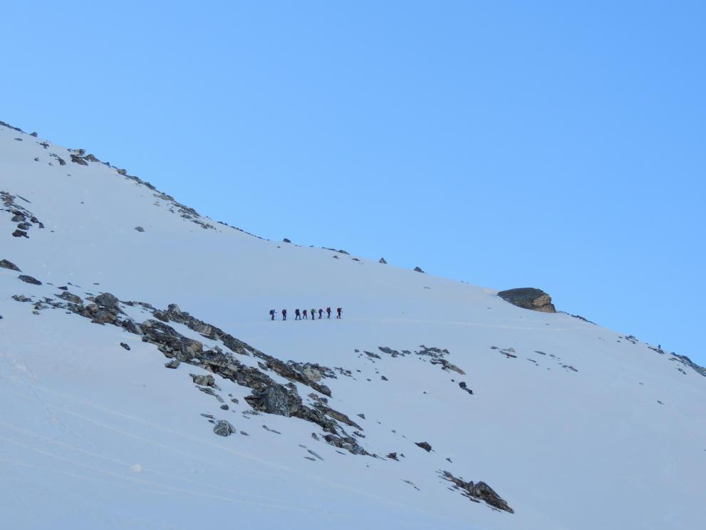 Il percorso dopo il rifugio Benevolo è decisamente diretto, richiede neve assestata per la presenza di alcuni pendii ripidi.