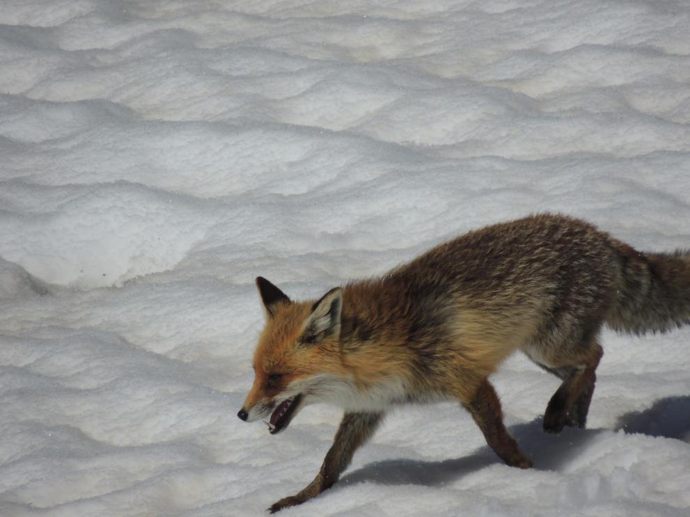 - il percorso classico prosegue a destra, salendo un dosso ripido in diagonale un po’ scomodo con le racchette, puntando ad un grosso masso cubico ben visibile. Da qui si accede ad un altro pendio, anch’esso ripido che può essere superato o tramite una sorta di canalino al centro tra alcune roccette a destra e una cresta rocciosa a sinistra, oppure salendo il più lungo ma meno ripido (ma sempre sostenuto) pendio-dorsale sulla destra, costellato di massi affioranti. In entrambi i casi si arriva ai pendii finali con la cima ora visibile di fronte.