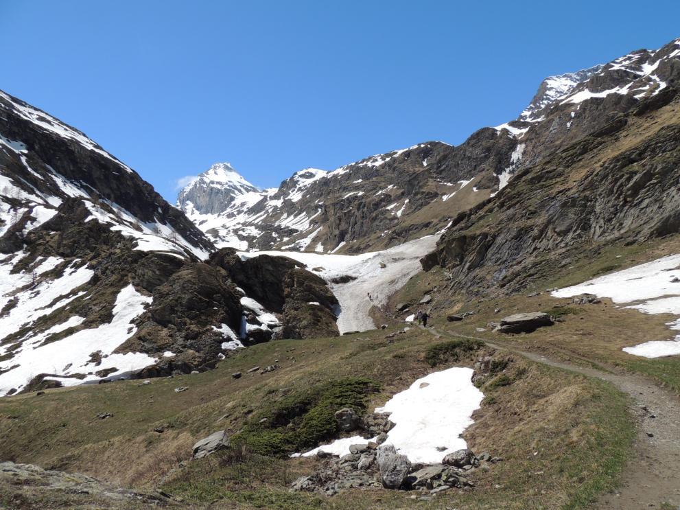 Raggiunto il rifugio si prosegue ancora brevemente sul ripiano lasciando a destra la Dora di Rhemes, per poi abbandonare il percorso per la Punta Galisia a favore di alcuni dossi e pendii sulla sinistra, esposti a sud-ovest. Si giunge rapidamente nei pressi del ruderi dell’Alpe Basei 2412 m, e superato un pendio si accede alla conca posta sotto la Punta Palettaz a destra, e la Punta di Lavassey a sinistra.