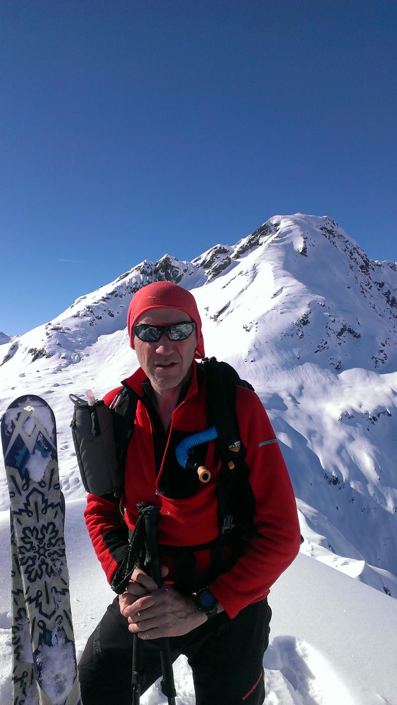 Oggi una ventina di Skialp sul tracciato, molti per un giorno feriale. Salito in 2.15 h lungo una traccia più a sinistra di quella tradizionale ad intersecare il tracciato della seggiovia e poi sino alla cima vera. Cresta terminale senza problemi. Conseguentemente sceso su pendii intonsi a dir poco entusiasmanti.