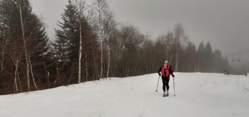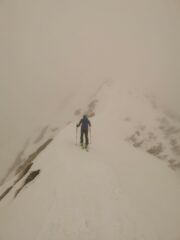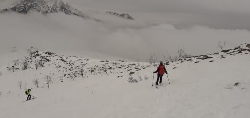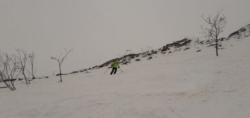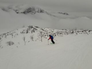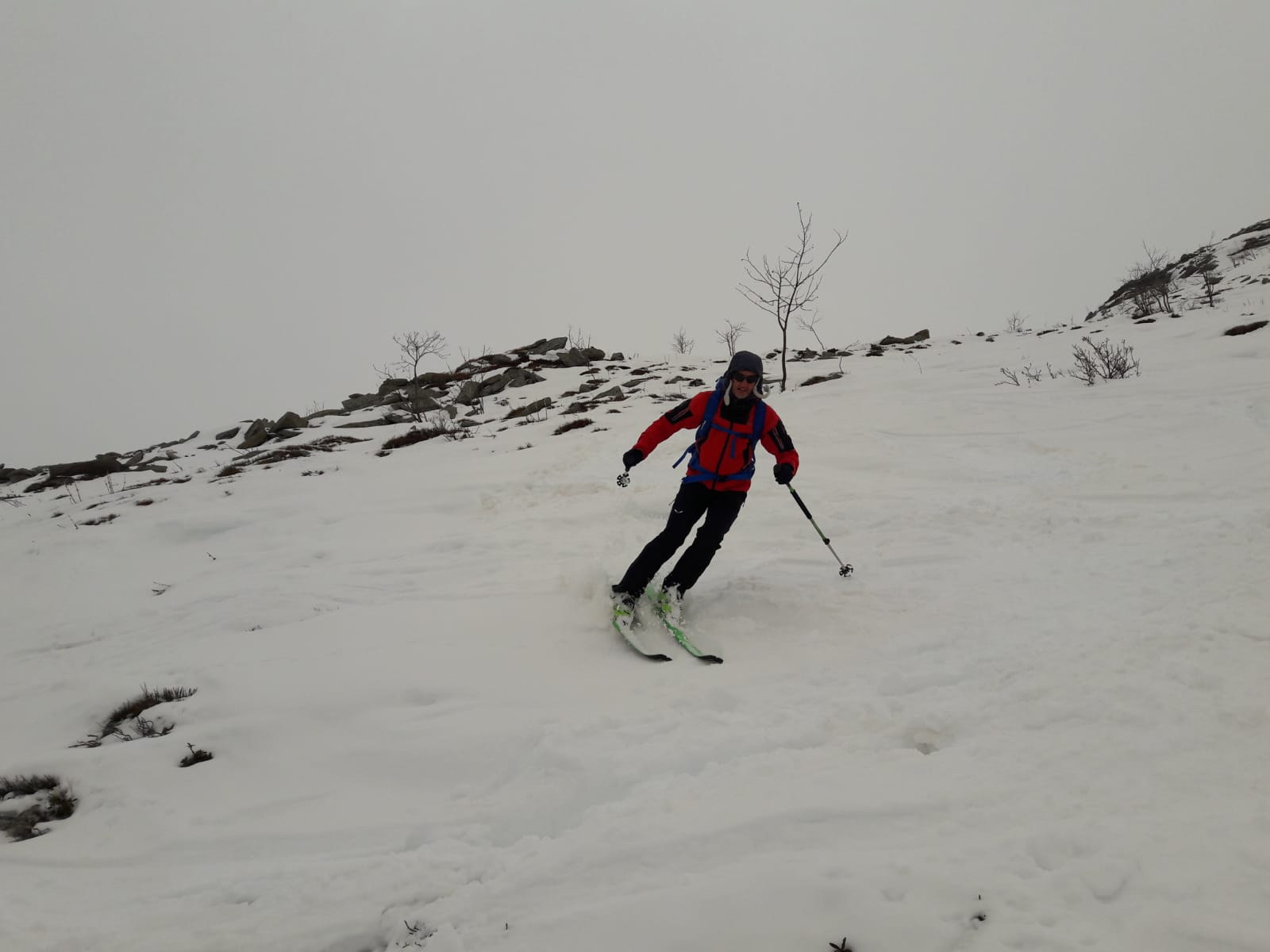 Temperature elevate, umidità e nebbia alla partenza. La meta inizialmente prevista era il Gran Munt poi la visibilità sempre più scarsa ci ha indotti a deviare per la più battuta e conosciuta punta Palit. Dall’anticima la cresta è tracciata e non ci sono stati problemi ad arrivare in vetta anche senza vedere nulla o quasi. Per la mancanza di neve bisogna togliere gli sci un paio di volte. Discesa per la maggior parte di pura sopravvivenza. In alcuni tratti il manto nevoso è stato rimaneggiato dal vento e ci sono pietre e arbusti scoperti che richiedono attenzione per non danneggiare le solette. Prevalenza di crosta da rigelo umida e non portante. Da quota 1.600 in giù la situazione è stata leggermente migliore con visibilità in aumento e la possibilità di seguire la strada battuta e ben sciabile. Discreti gli ultimi 100 metri prima di arrivare al parcheggio del vecchio impianto. Con Daniela e Massimiliano.