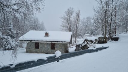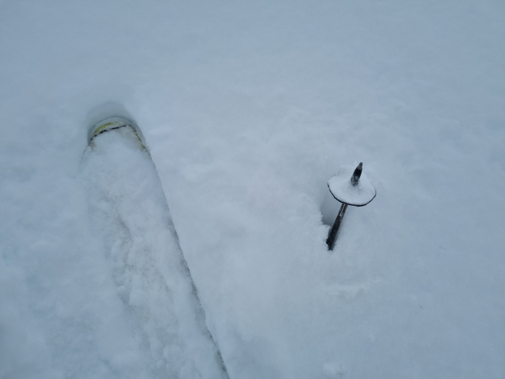 25 cm al ponte qualche km prima di Fondo, lo spazzaneve non ancora passato…. proseguo con gli sci. Quando sarò quasi arrivato alla partenza degli impianti, lo spazzaneve arriva 😤. Due ragazzi hanno già aperto traccia fino all’arrivo della seggiovia (grazie!), dove si sono fermati. Io proseguo, battendo su 50 cm di neve fresca, a cui si somma quella vecchia, che dai 1500 m in su non è poca. A 1800 m misuro 120 cm totali. Il bastoncino va dentro tutto. Mi fermo sulla cresta, dove dei grossi roccioni obbligano a scendere di 3 m, pri.a dell’ultima rampa. Ho valutato che forse sarei riuscito a scendere senza farmi male, ma sicuramente non a risalire, con tutta quella neve poco consistente.