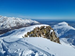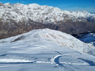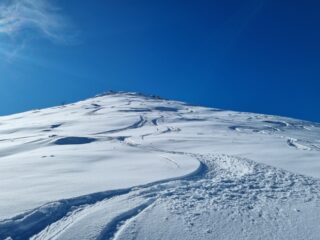 Oggi una Punta Palit superba. Molta gente anche oggi, 12 automobili al parcheggio, quando sono partito, ma è un via vai continuo dall’alba al tramonto. Innevamento ottimo sulla pista già dal parcheggio. Sembra impossibile, ai lati della pista (complici gli abeti) quasi non c’è neve, sulla pista tutto coperto, neanche una pietra. Come se l’avessero sparata. Comunque, salendo 100-200 m, la neve diventa abbondante anche fuori pista…. ed è farina 00. La “via normale” è ormai tritatissima, ma basta spostarsi su vie alternative (conoscendo un minimo la zona) e si aprono praterie di neve intonsa o quasi.