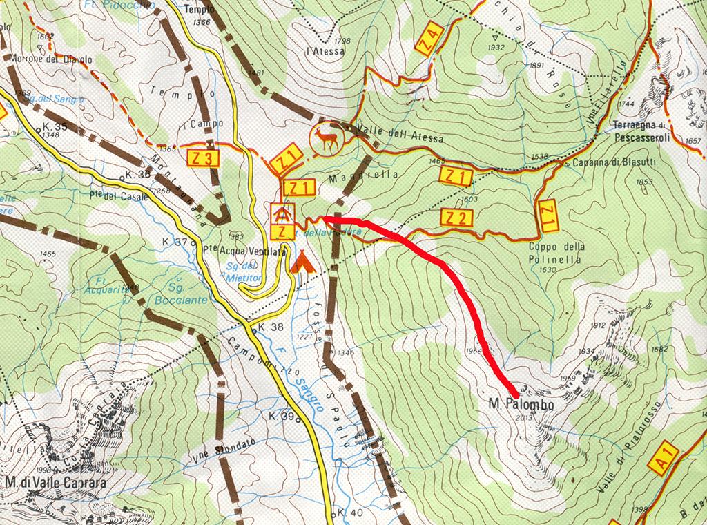 Dalla fonte Padura (mt. 1275) si segue la sterrata e si entra in una radura dopo una sbarra metallica.Si devia a dx (indicazioni per il Coppo della Polinella) e si inizia a risalire il bosco per il sentiero marcato con bollini arancioni. Bisogna evitare, guadagnando quota, di portarsi verso destra perchè li il bosco si infittisce e si hanno dei salti di rocce.Si segue successivamente una serie di radure allungate che percorrono la dorsale Nord-Ovest del M. Palombo. Una volta raggiunta la fine del bosco si incontra un grosso ripetitore e, di li a poco, si raggiunge la vetta per via di cresta.