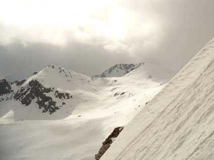 Raggiunto il conoide speravo che le cose cambiassero invece nel canale peggio che peggio. Neve a dir poco molle che a un certo punto mi lasciava dubbi di tenuta anche in salita.