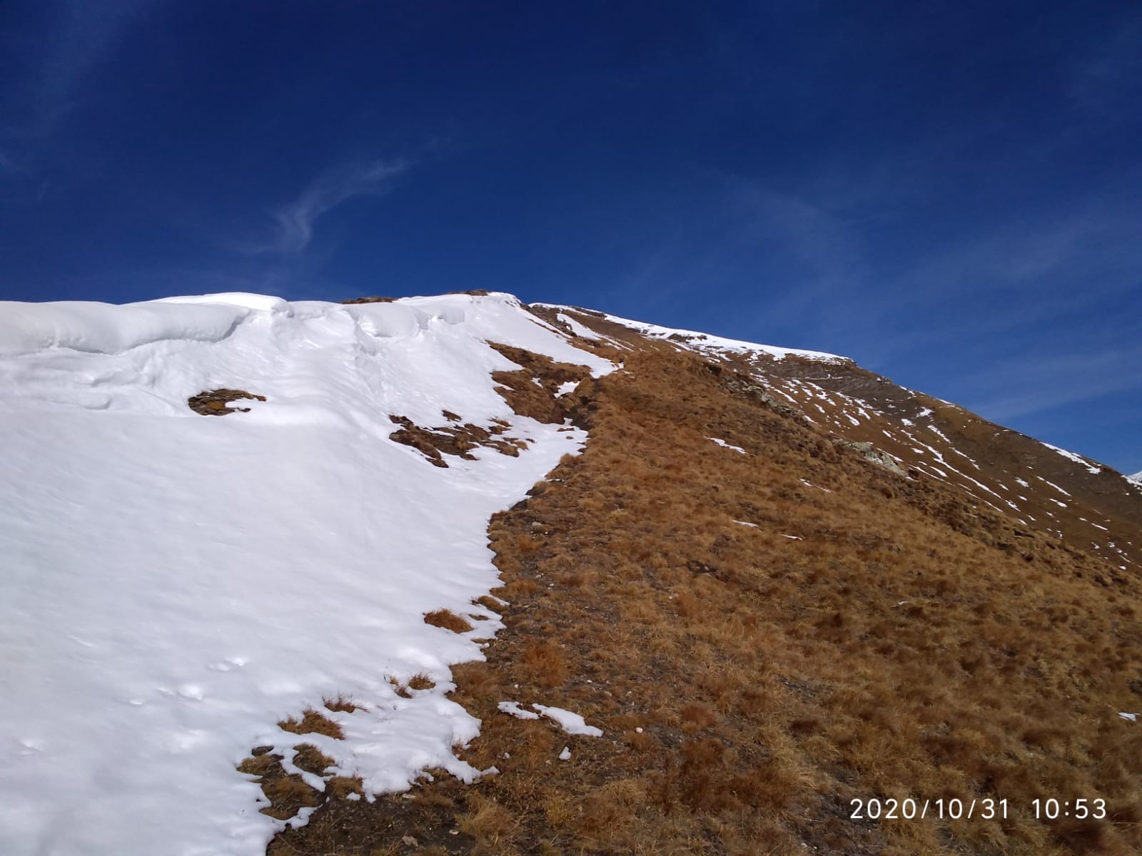 Passato il crinale dei Tre Cresti non abbiamo notato tracce verso la cima e così, ormai in vista del rifugio Ravetto, abbiamo tagliato verso il filo della larga dorsale sud per i prati. Qualche accumulo e qualche chiazza di neve poco sotto la cima. In discesa sulla dorsale, abbiamo continuato agevolmente lungo il crestone che si diparte a quota 2740 in direzione sudovest (“cresta Crèuse” sulla carta Fraternali), aggirando senza problemi a sx l’unico modesto salto di rocce.