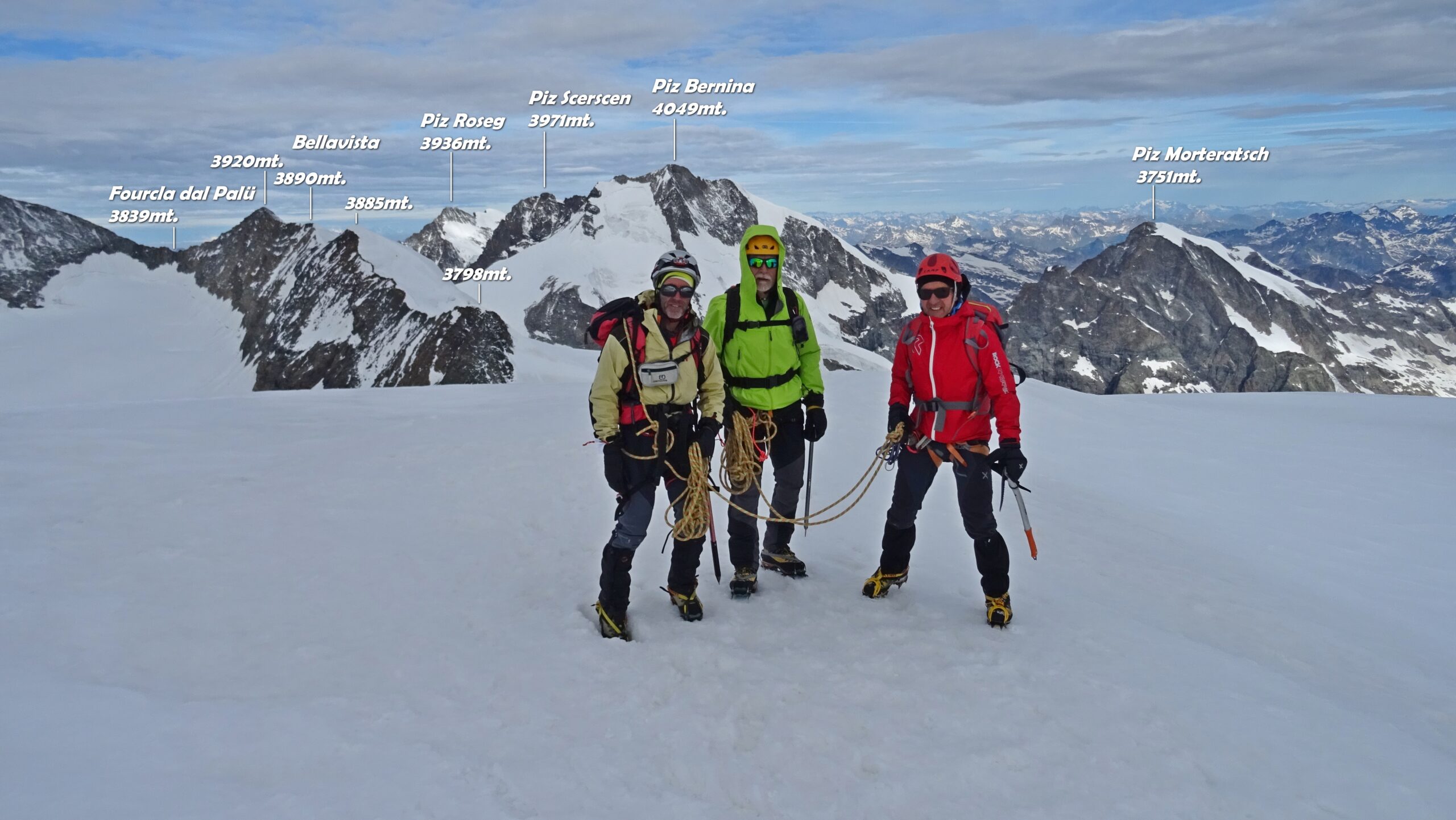Quarta volta di fila in territorio Elvetico ,oramai ci sono abbonato. Butto l’esca in settimana ai soci, attaccando all’amo i Piz Palü… Sergio e Clemente abboccano. Ovviamente per impegni lavorativi …miei, si parte un po’ tirati nel pomeriggio. Obbligatoriamente prendiamo a pelo la funivia che porta al Berghaus Diavolezza. Dopo la notte alla belle etoile in sacco a pelo di sabato scorso, questa volta ci siamo dati al lusso, abbiamo pernottato comodamente al Berghaus Diavolezza, più che un rifugio un albergo. Preso alloggio in comoda cameretta privata da 4 posti con lavello dove fanno anche trovare una bottiglietta CL. 0.50 di acqua (che qui in Svizzera si paga a peso d’oro) ed una mela a testa, il tutto è unito al pacchetto di A/R in funivia al costo di 109 € a testa. Può sembrare caro, ma per quello che di danno non lo è. Cena top, ben curata tipo albergo, Insalata caprese come antipasto , zuppetta di ceci di primo, riso con spinaci e udite, udite… scorfano con salsa di pomodori olive e capperi, incredibile. Un ringraziamento alla disponibile Francesca e allo staff tutto italiano.