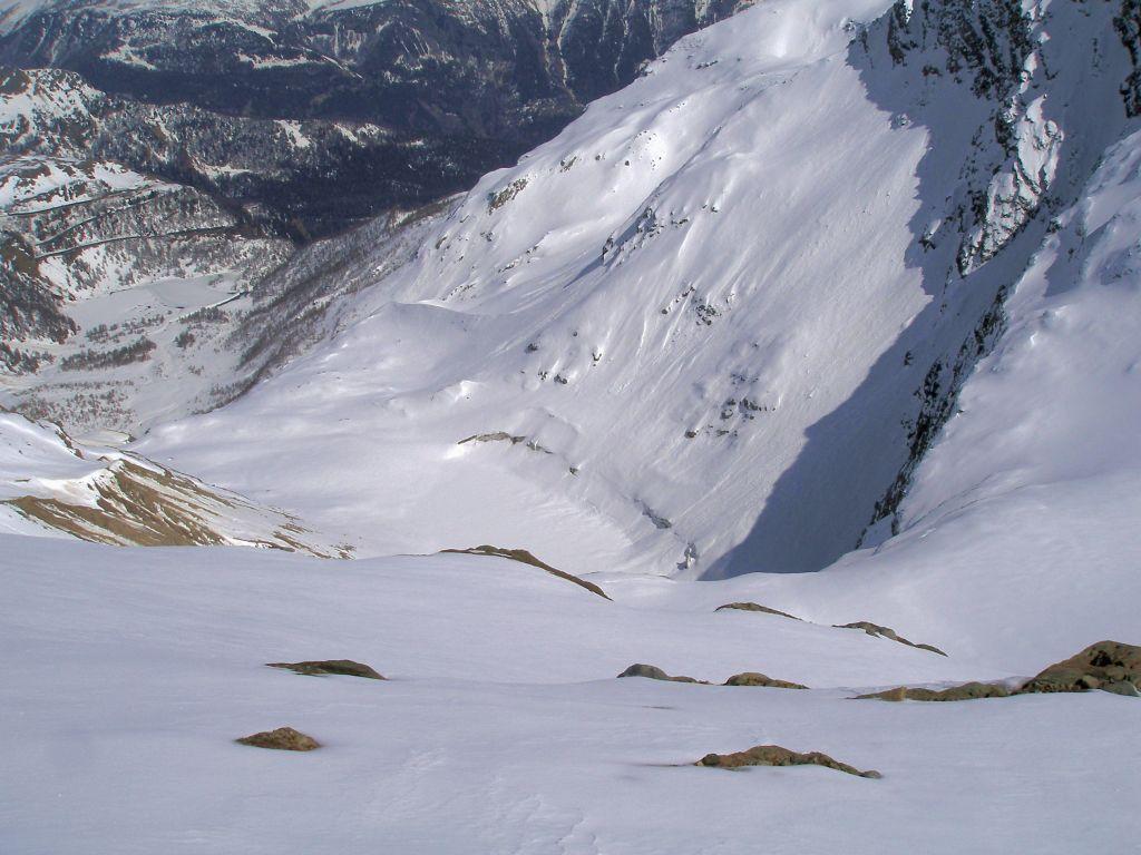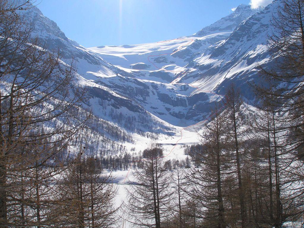 Dalla Capanna Diavolezza seguire l’itinerario classico fino alla vetta del Piz Palù (ore 3 circa a seconda delle condizioni della cresta).Da qui con gli sci ai piedi scendere sino alla massima depressione con il Piz Spinas; per roccette un pò insidiose scendere senza sci un primo tratto, per poi giungere sull’Altipiano di Fellaria prestando attenzione alla crepaccia terminale sempre aperta sulla destra. Con buon innevamento si può scendere con attenzione anche con gli sci (20 metri a 50°- 100 metri poco oltre 40°). Con facile discesa puntare in direzione sud-est sino a q.3500 metri. Qui il ghiacciaio diventa molto insidioso e crepacciato. Non appena si supera la prima fascia di crepacci tenendosi leggermente a destra, puntare poi con lungo traverso in direzione nord-est per prendere una zona molto più tranquilla che con bella sciata porta allo sperone che divide la vedretta. Scendere sulla destra dello sperone per circa 100 metri tenendosi a ridosso delle rocce di sinistra per un canale poco marcato sino ad un plateau. Ora non proseguire assolutamente ma con traverso verso destra (un pò delicato) puntare decisamente alla base della seraccata mediana. Da qui una sciata molto bella consente di portarsi, puntando verso sinistra, al di sopra della balconata, dove la valle fa un salto di 50 metri. L’unico punto di passaggio è evidente sulla sinistra, dove con un traverso ci si porta in corrspondenza di un canale (pericolo valanghe) che scendendolo porta alla bese della balconata in corrispondenza di un laghetto ghiacciato. Superarlo sulla sinistra e con facile sciata portarsi sopra l’ultimo salto, che come il precedente deve essere superato a sin. su terreno delicato (molta attenzione alle valanghe di notevoli dimensioni) perchè le rocce sono levigate e la neve tende a scivolare. Tenendosi bene a sin. contro le rocce si giunge in corrispondenza di una piccola cascata da cui parte un canale che porta alla base dell’ultimo grande salto (fine delle difficoltà) Su ampii pianeggianti pendii tenendosi a destra del fiume giungere al lago e da qui facilmente, dopo avere ripellato, si giunge in mezz’ora alla stazione di Alp Grum, da cui con il treno si ritorna a Diavolezza