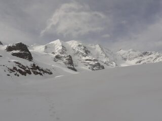 Partiti alle 8 con la prima funivia, insieme a una decina di altri skialper. Ambiente stupendo, traccia sempre evidente e ghiacciaio in ottime condizioni. Il vento molto forte in cresta, la nuvolosità diffusa e una piccola disavventura con un rampone di Giorgione ci hanno fatto desistere dal piano di fare la traversata. Scendiamo dunque dalla cima orientale e cominciamo ormai tardi la discesa, verso le 13.30. La neve ha già mollato anche in alto, ma giungiamo con un’ottima sciata fino al fondo pianeggiante del vadret da pers, che seguiamo su neve sempre più bagnata e pesante fino al morteratsch. Percorso evidente su ghiacciaio molto chiuso. Si arriva ancora con gli sci al trenino su neve pappina.