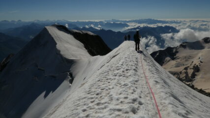 Partiti dal Rifugio Marco e Rosa dopo la Biancograt. Condizioni e meteo ottimi; colazione alle 5 e partenza alle 6 in tranquillità. Risalita verso i Bellavista e falsopiano fino ad arrivare alle pendici del Palù Occidentale, qui cresta rocciosa divertente ma da fare attenzione per l’esposizione in certi passaggi. No ghiaccio e buona copertura nevosa lungo l’estetica cresta dei Palù. Parte bassa del ghiacciaio un po’ crepacciato, ma no problema, si arriva così su terreno asciutto e dopo una risalita lato sud-est si giunge presso la funivia e il Rifugio Diavolezza; il colpo d’occhio è spettacolare. Funivia solo discesa 31 CHF, in alternativa, in circa 2h di sentiero si arriva giù e con il trenino si giunge a Pontresina.