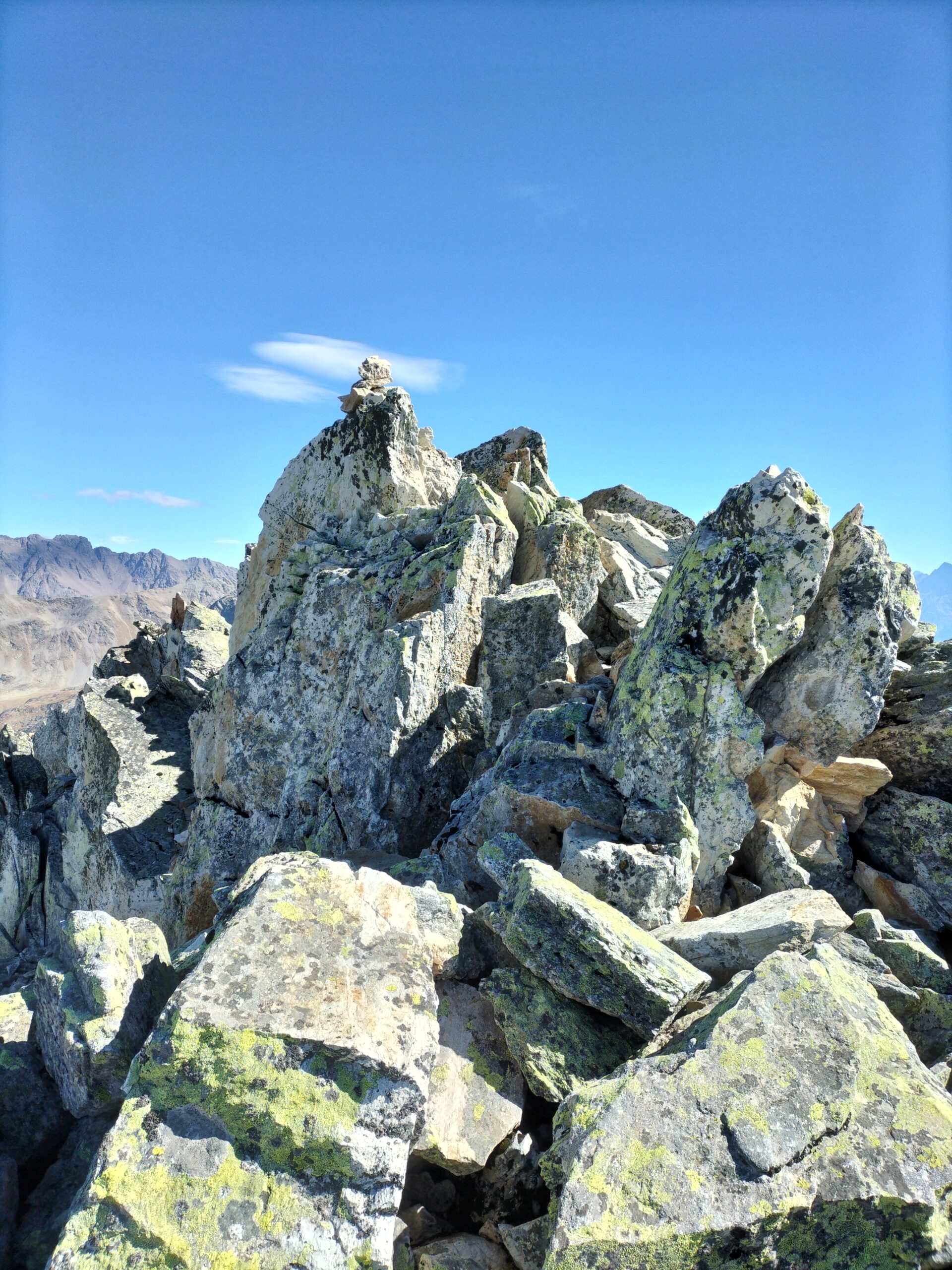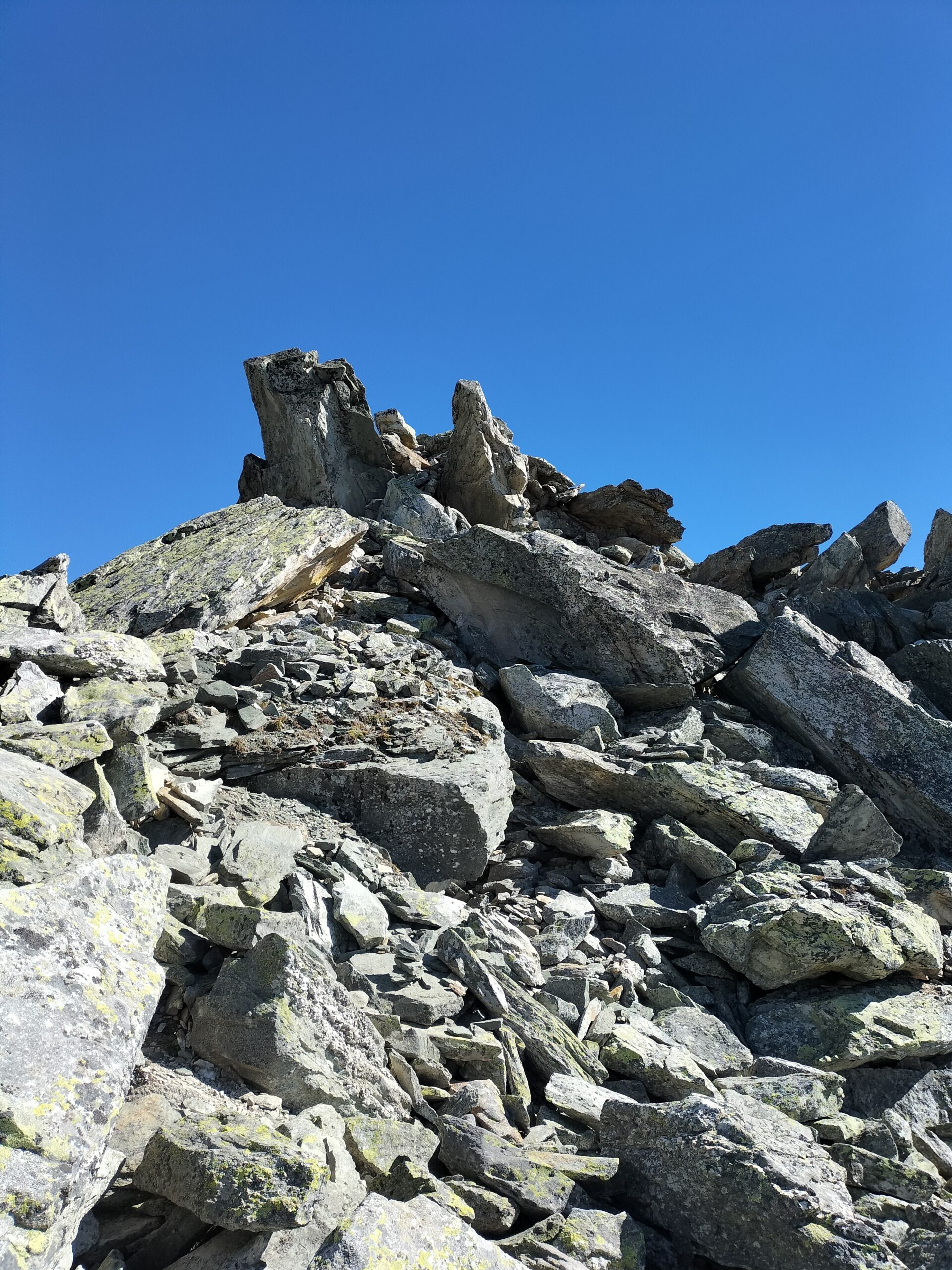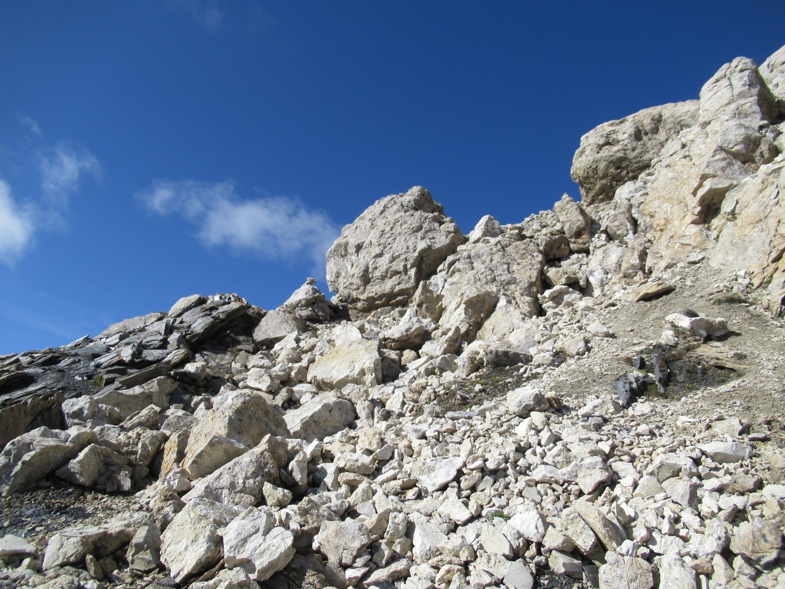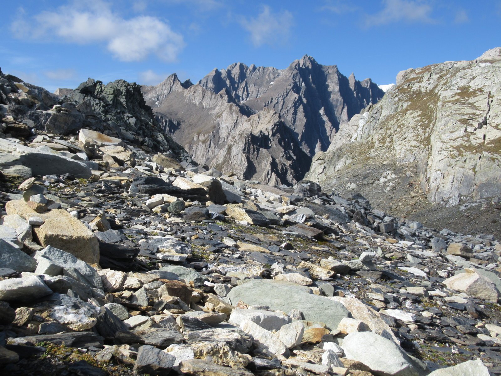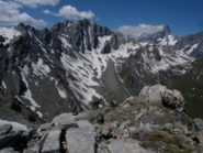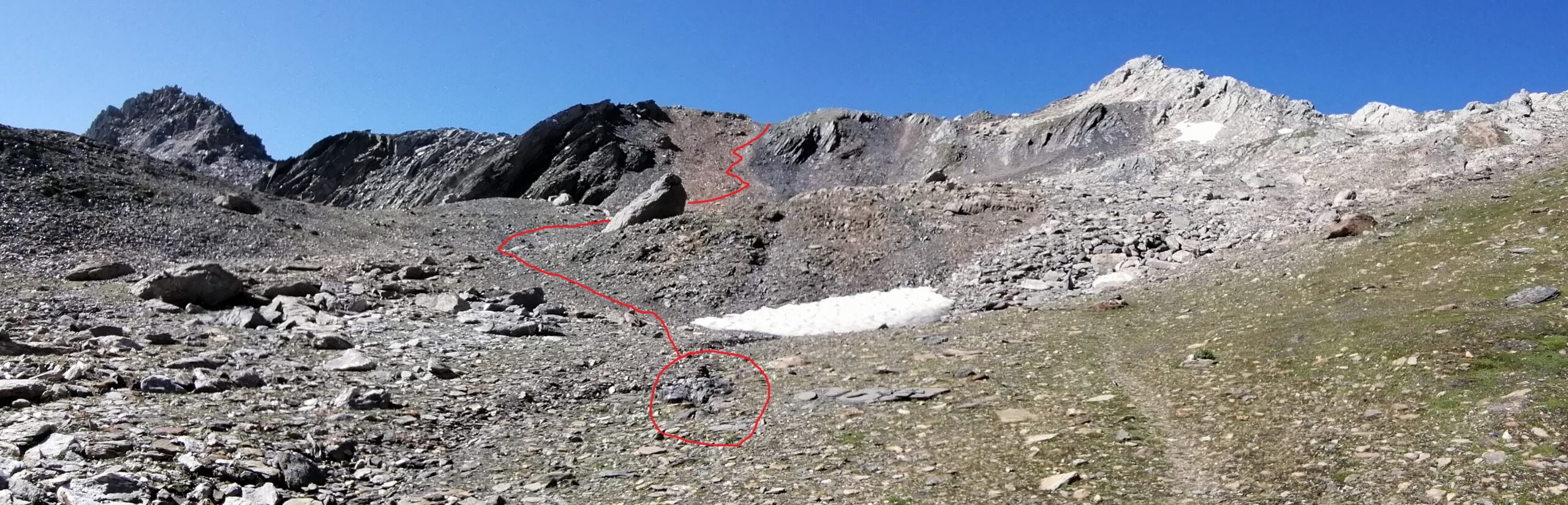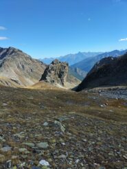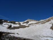Il percorso in seguito non è obbligato: scavalcare alcuni dossi erbosi, salire sulla destra un canale nevoso e di detriti e si procede sino alla sella detritica tra il Mont Fourchon e il Pain de Sucre, dalla quale si sale senza difficoltà (tracce di passaggio) alla cima per detriti e rocce (ore 1.45 )