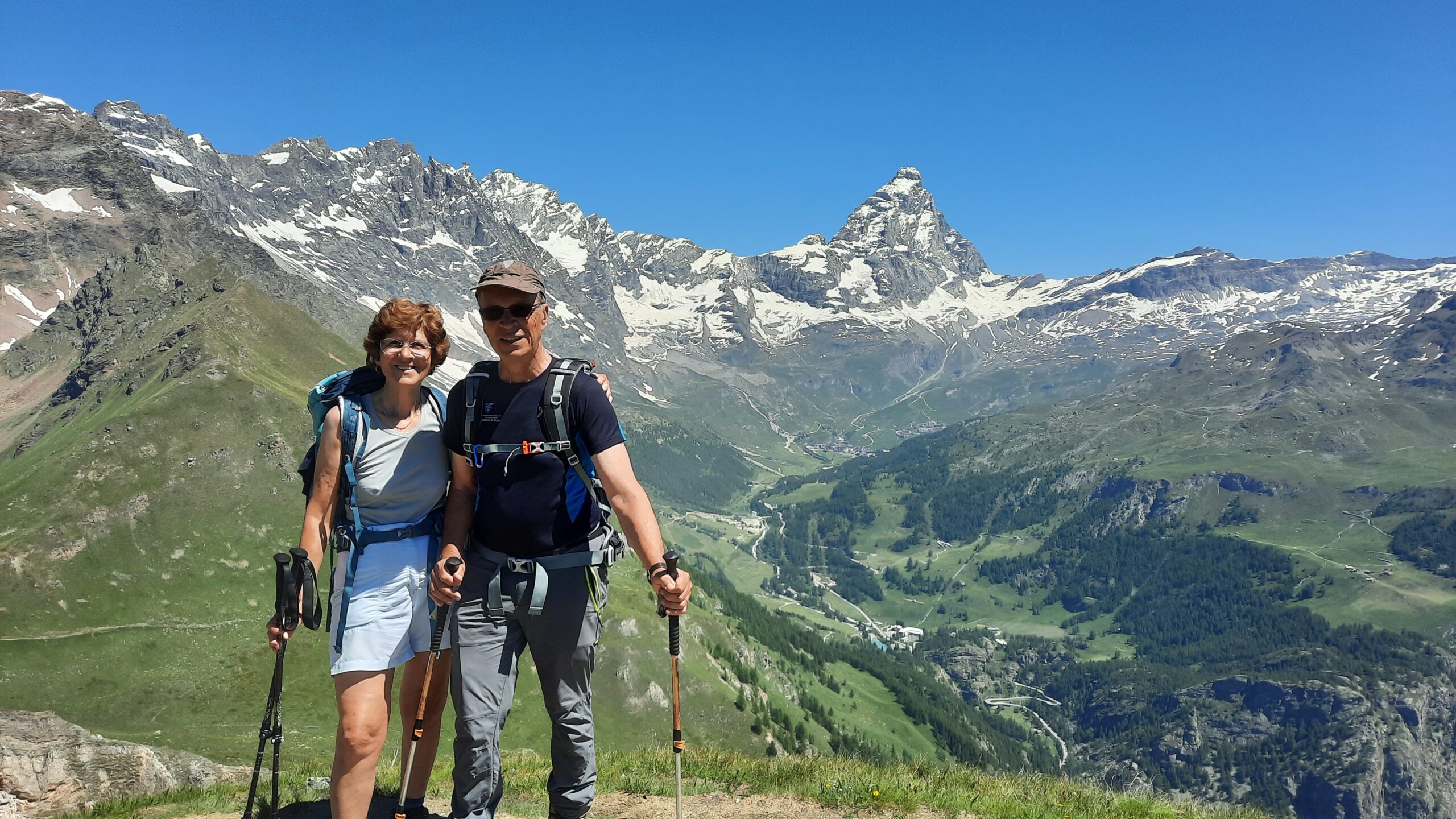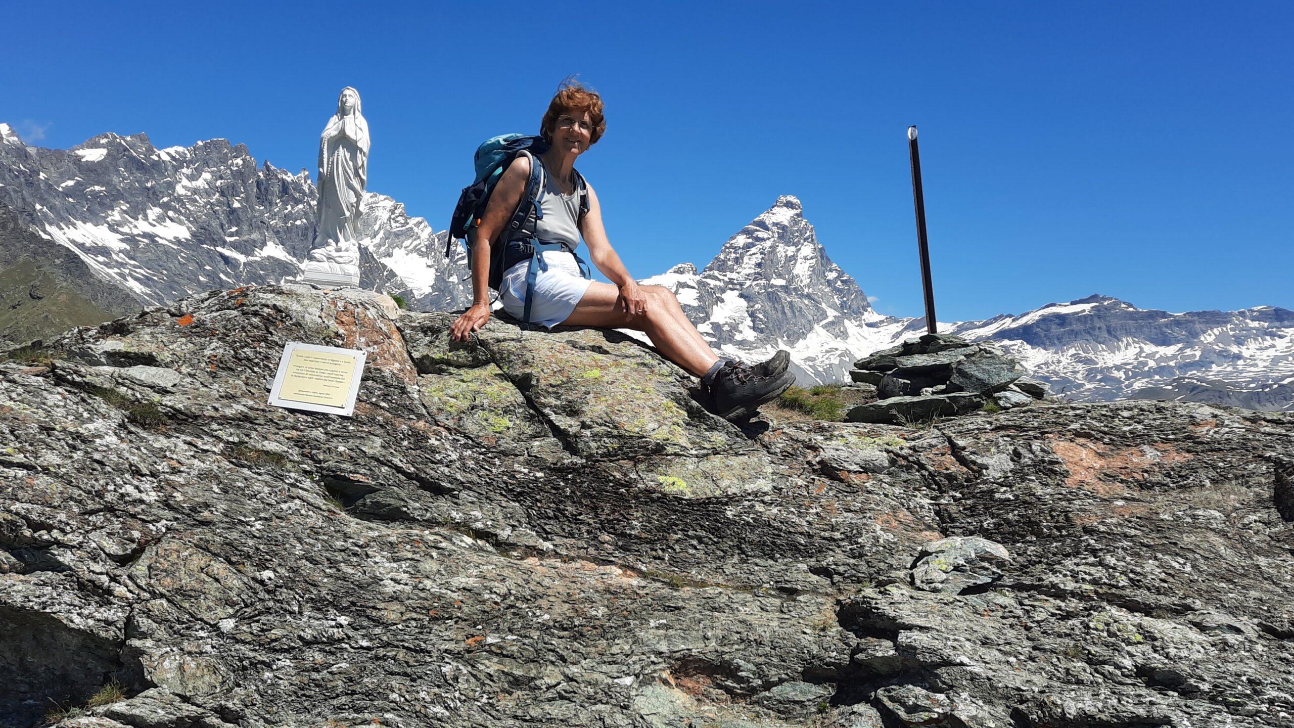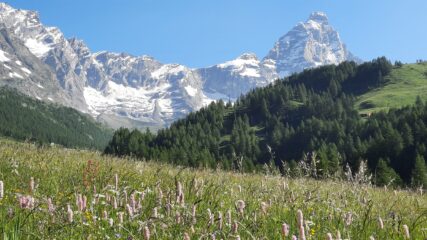 Bellissima gita che ancora non conoscevamo in una giornata splendida senza una nuvola, sempre al cospetto della Grande Becca. Sicuramente di qui si apprezzano i migliori panorami su Cervino e Breithorn. Alla finestra di Cignana in un’ora e 50 dal parcheggio, circa poi 50 minuti per raggiungere la vetta. Prima agevole sentiero, dalla finestra in poi tratti un po’ esposti (EE). Ultimo tratto con qualche canapone e qualche scalino, inutili nelle condizioni estive attuali. Oggi circa 800 metri di dislivello a quasi 5 mesi dall’intervento di Piera… Nell’itinerario si parla di un bellissimo alpeggio Le Grillon con stalla da vedere, Noi in discesa abbiamo tentato di avvicinarci alla vicina bella fontana, ma siamo stati assaliti da tre cani… altro che visitare la stalla…