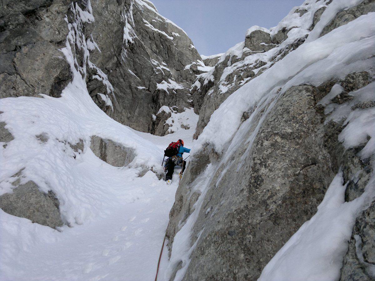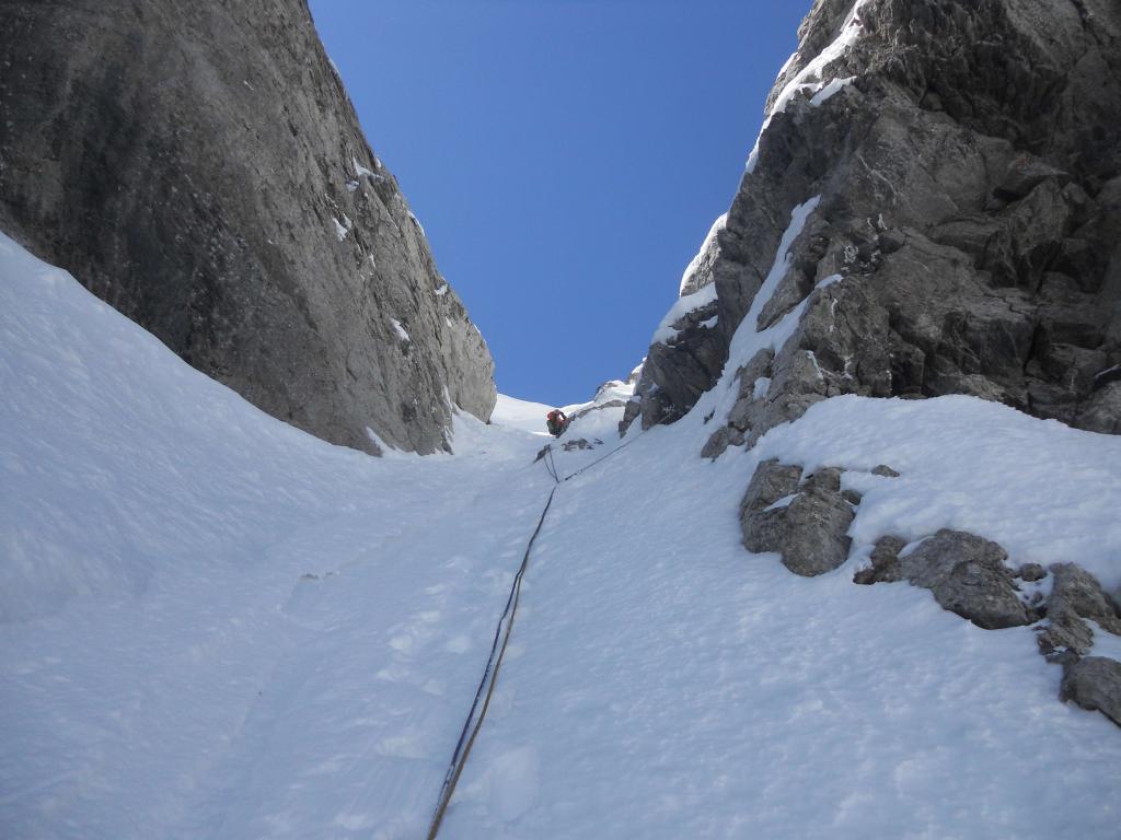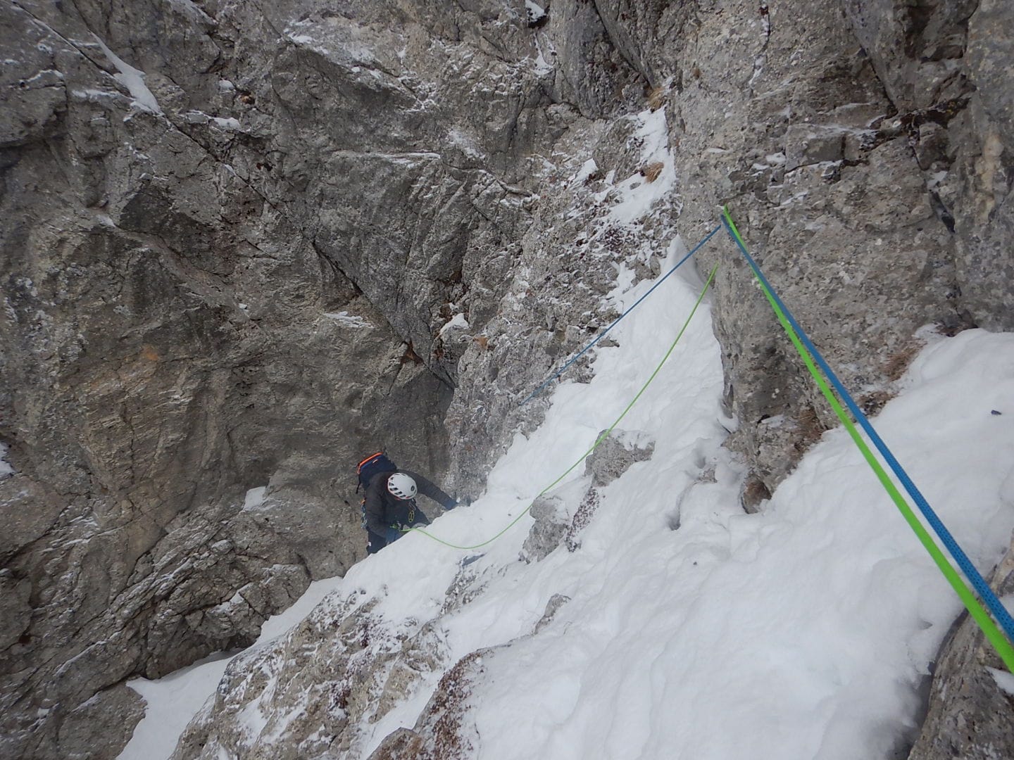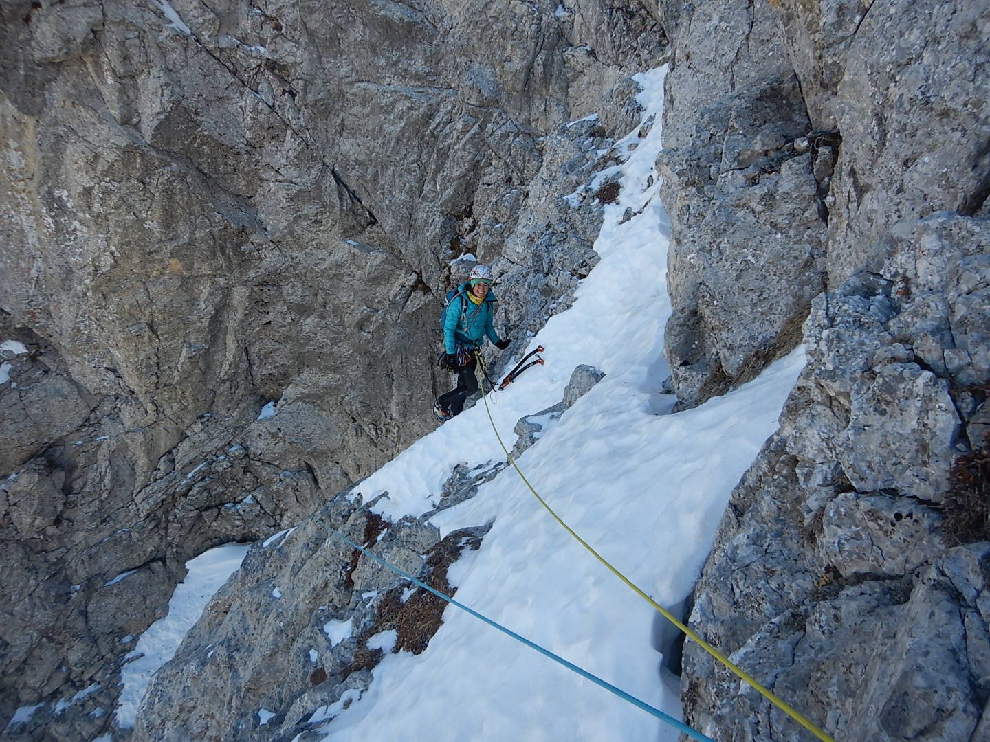 3.. Sempre dritti su placca innevata poi si sale un pilastrino fessurato (chiodi) quindi si attraversa diagonalmente a destra su neve e roccia arrivando in un canale, 50m 2 anelli sulla parete destra del canale.