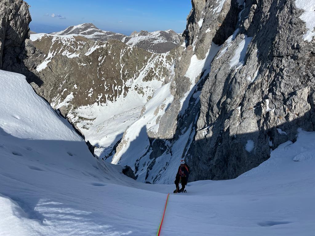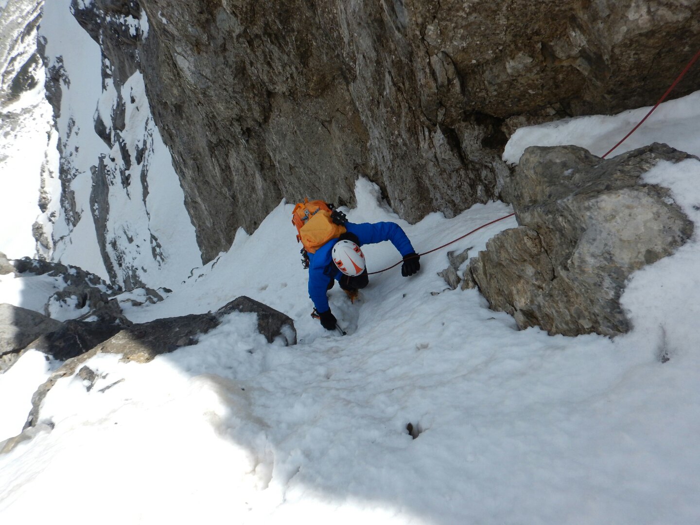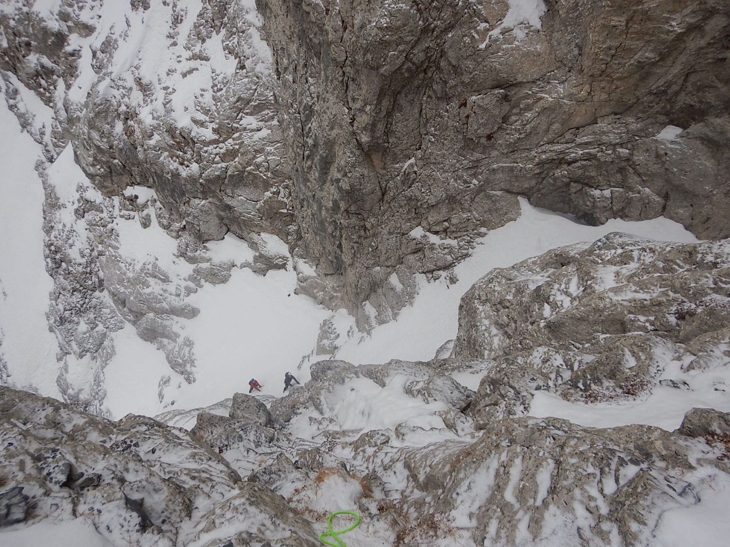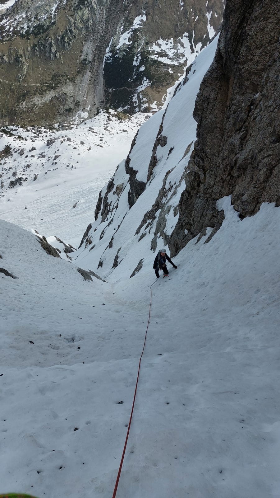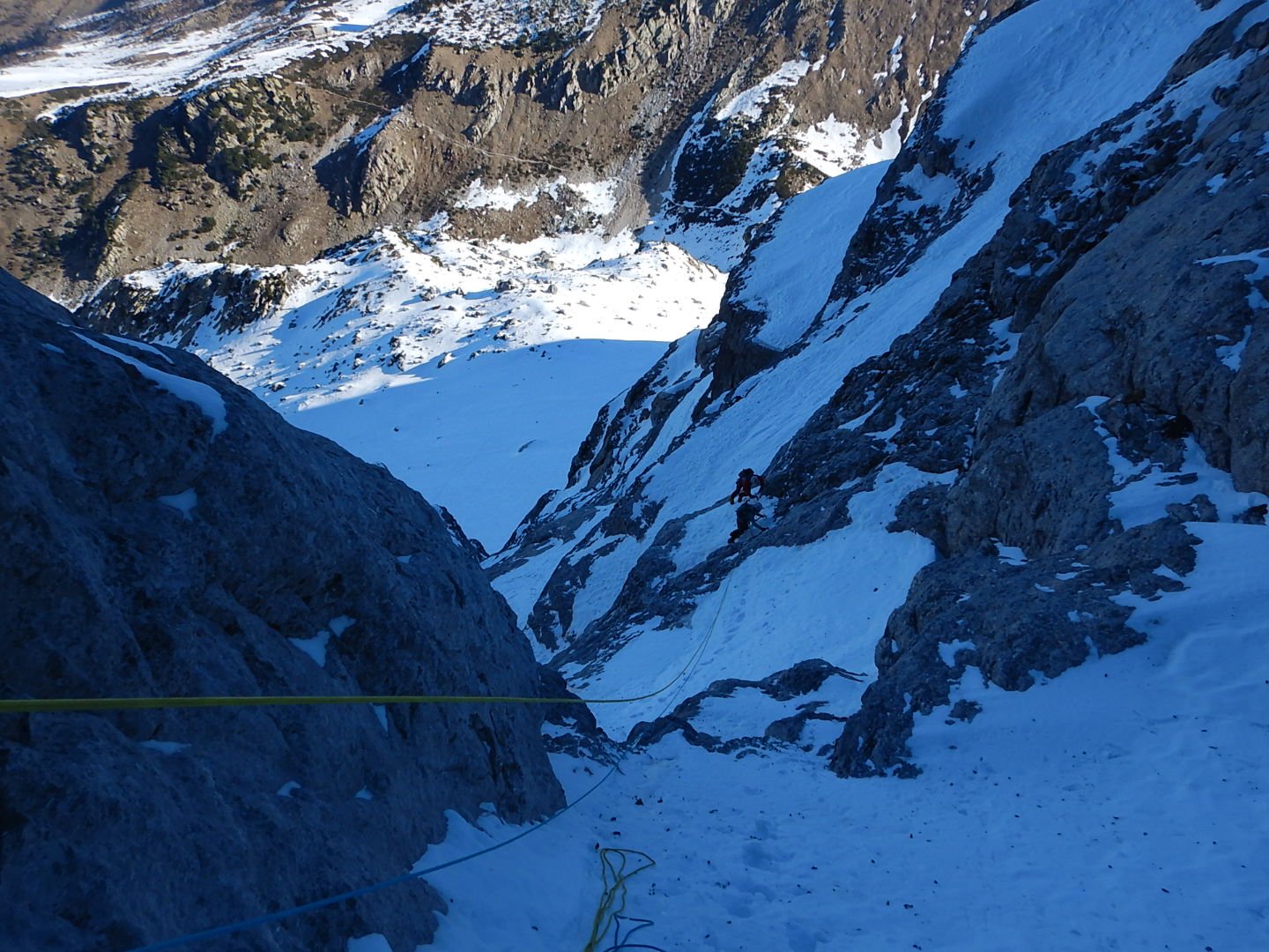 3.. Sempre dritti su placca innevata poi si sale un pilastrino fessurato (chiodi) quindi si attraversa diagonalmente a destra su neve e roccia arrivando in un canale, 50m 2 anelli sulla parete destra del canale.