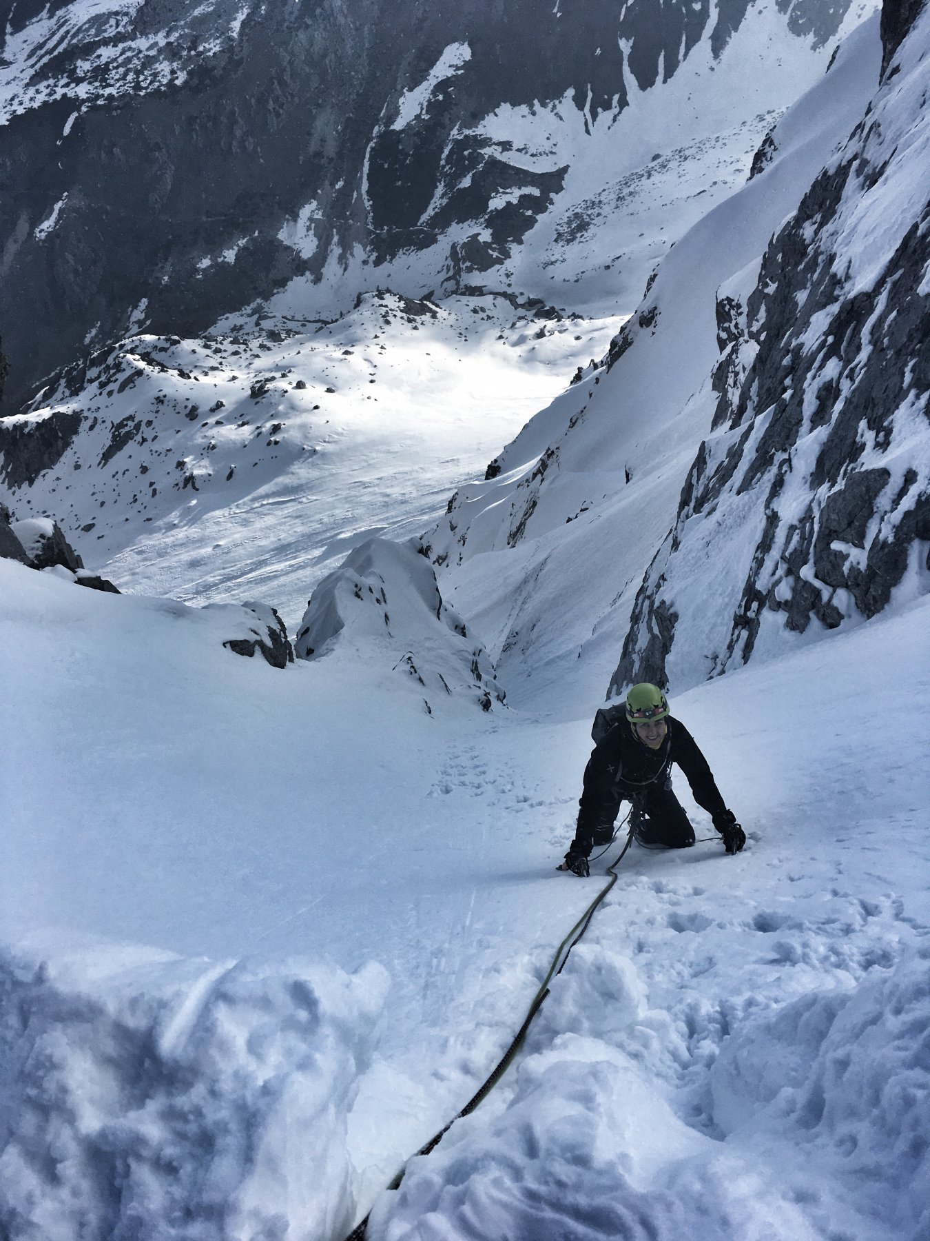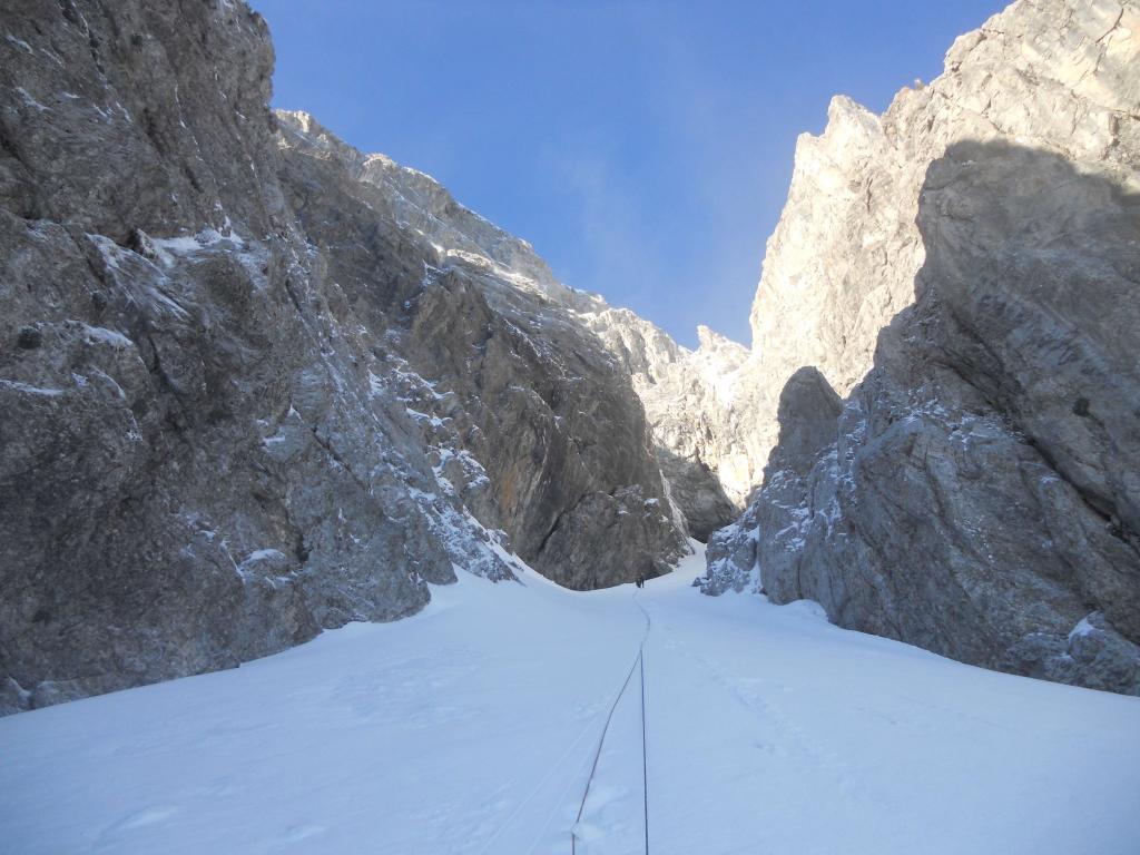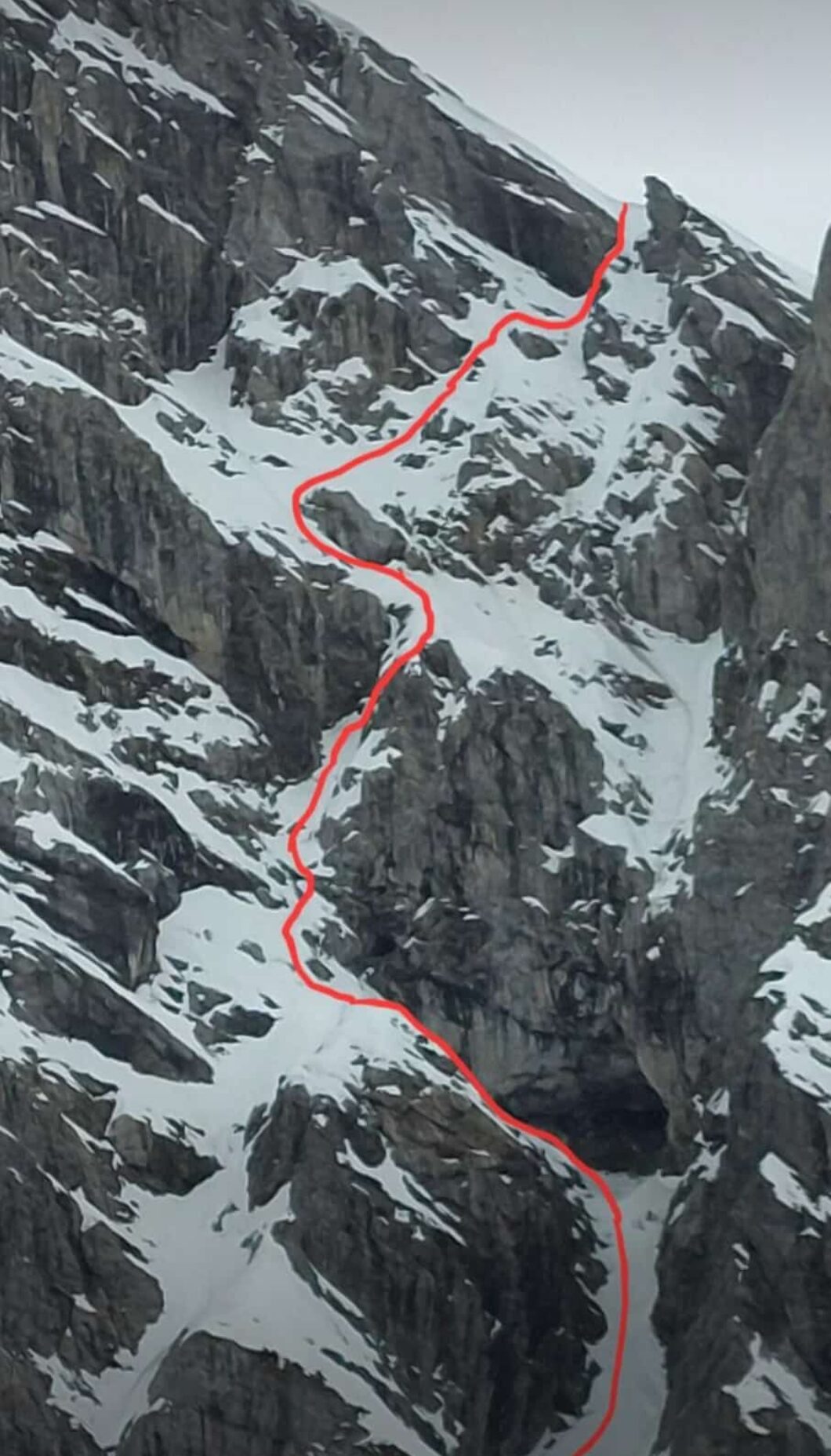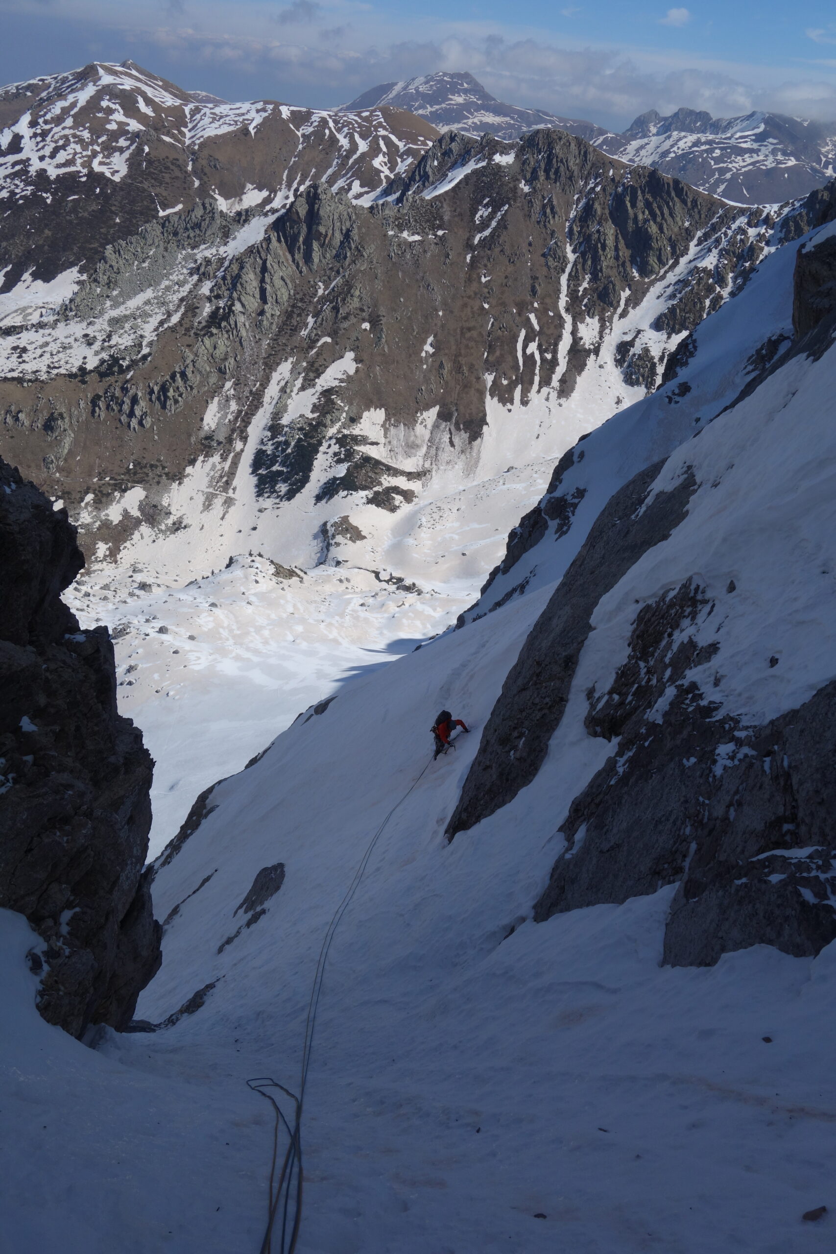 3.. Sempre dritti su placca innevata poi si sale un pilastrino fessurato (chiodi) quindi si attraversa diagonalmente a destra su neve e roccia arrivando in un canale, 50m 2 anelli sulla parete destra del canale.