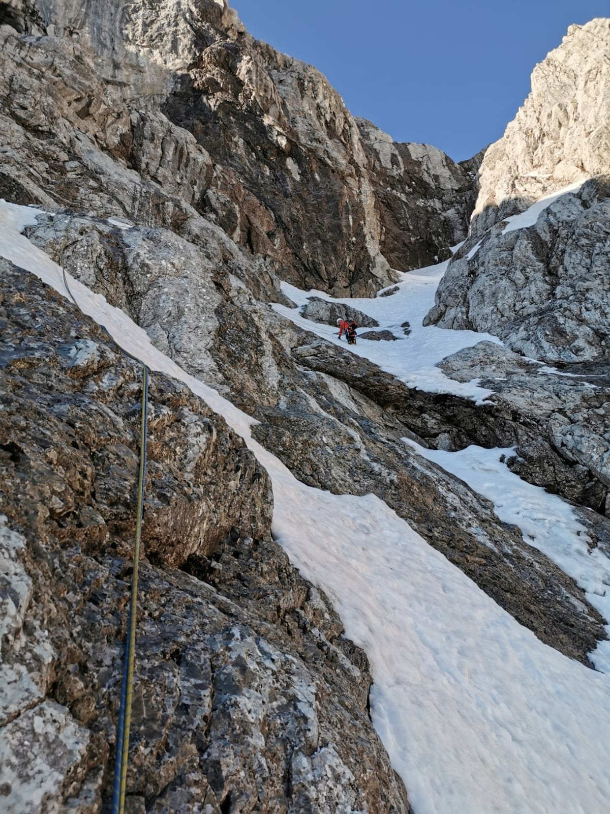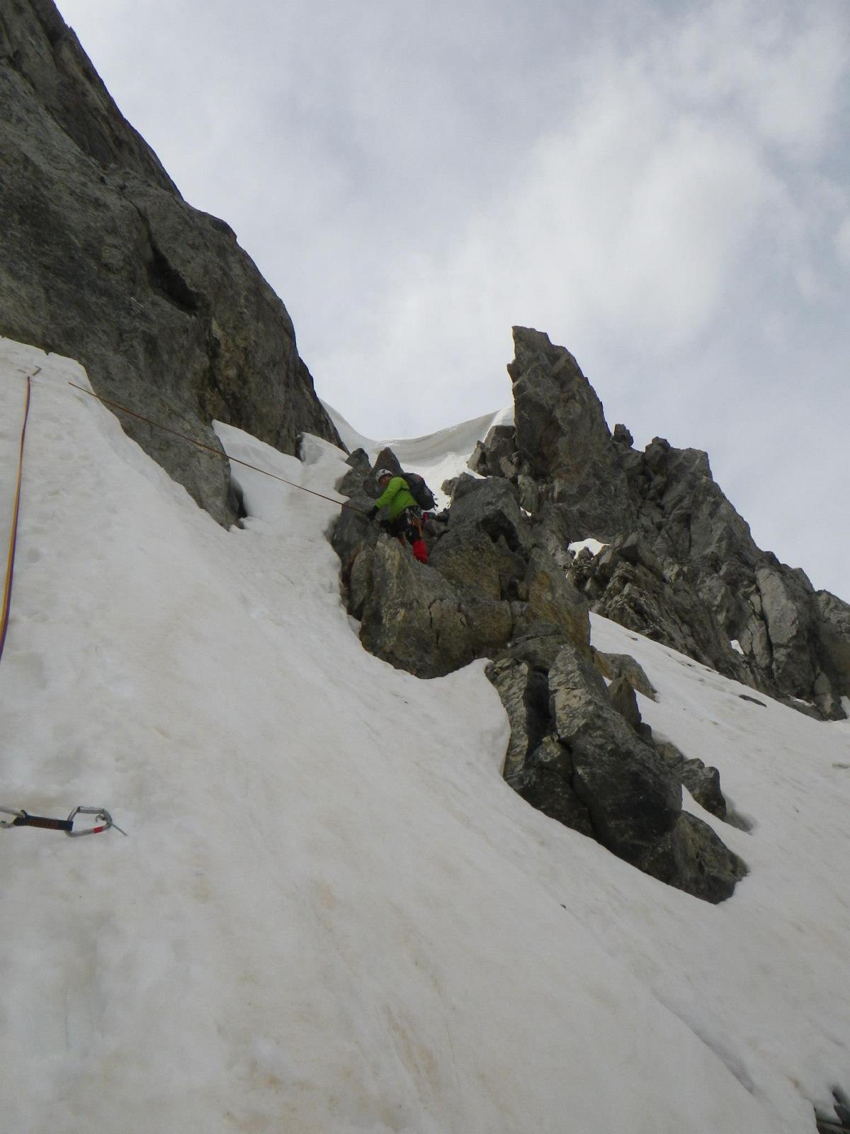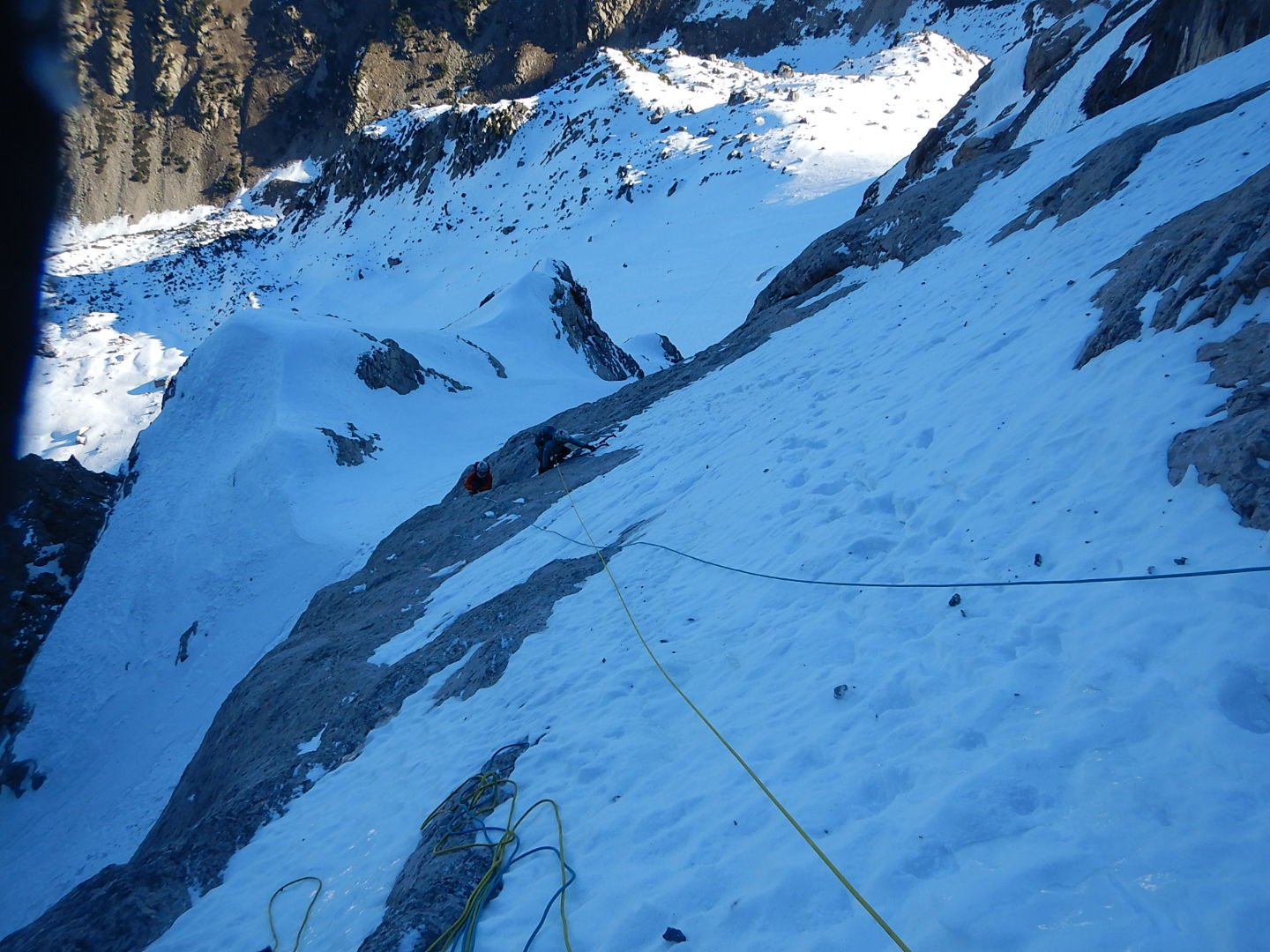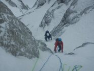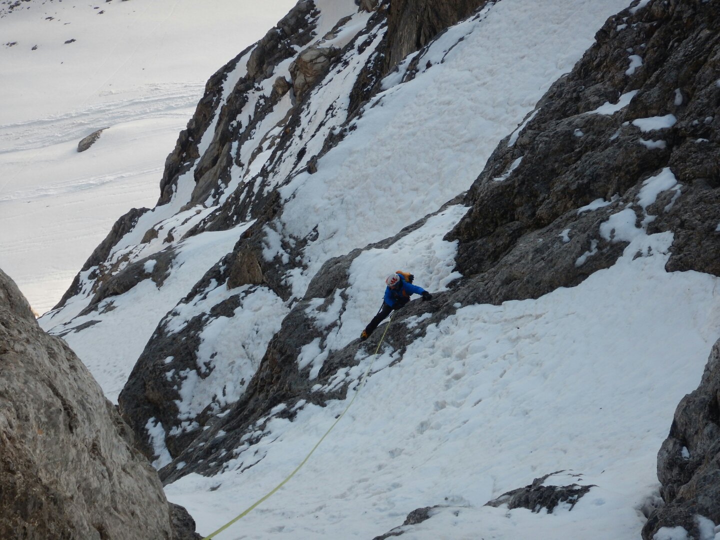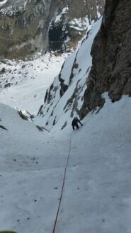 6.. Dalla sosta ci si abbassa di qualche metro, si attraversa a destra e si supera la fascia rocciosa su terreno misto (III, IV). Un breve pendio nevoso porta ad un altro affioramento roccioso, 55m 2 anelli.